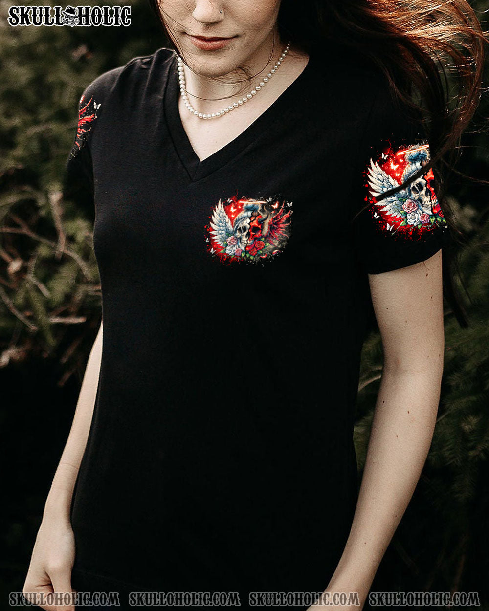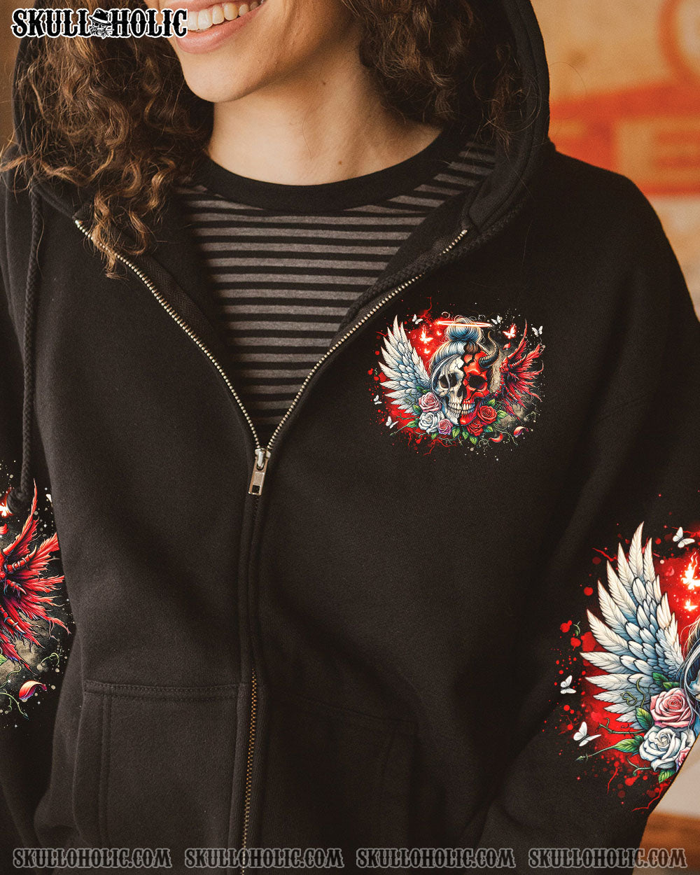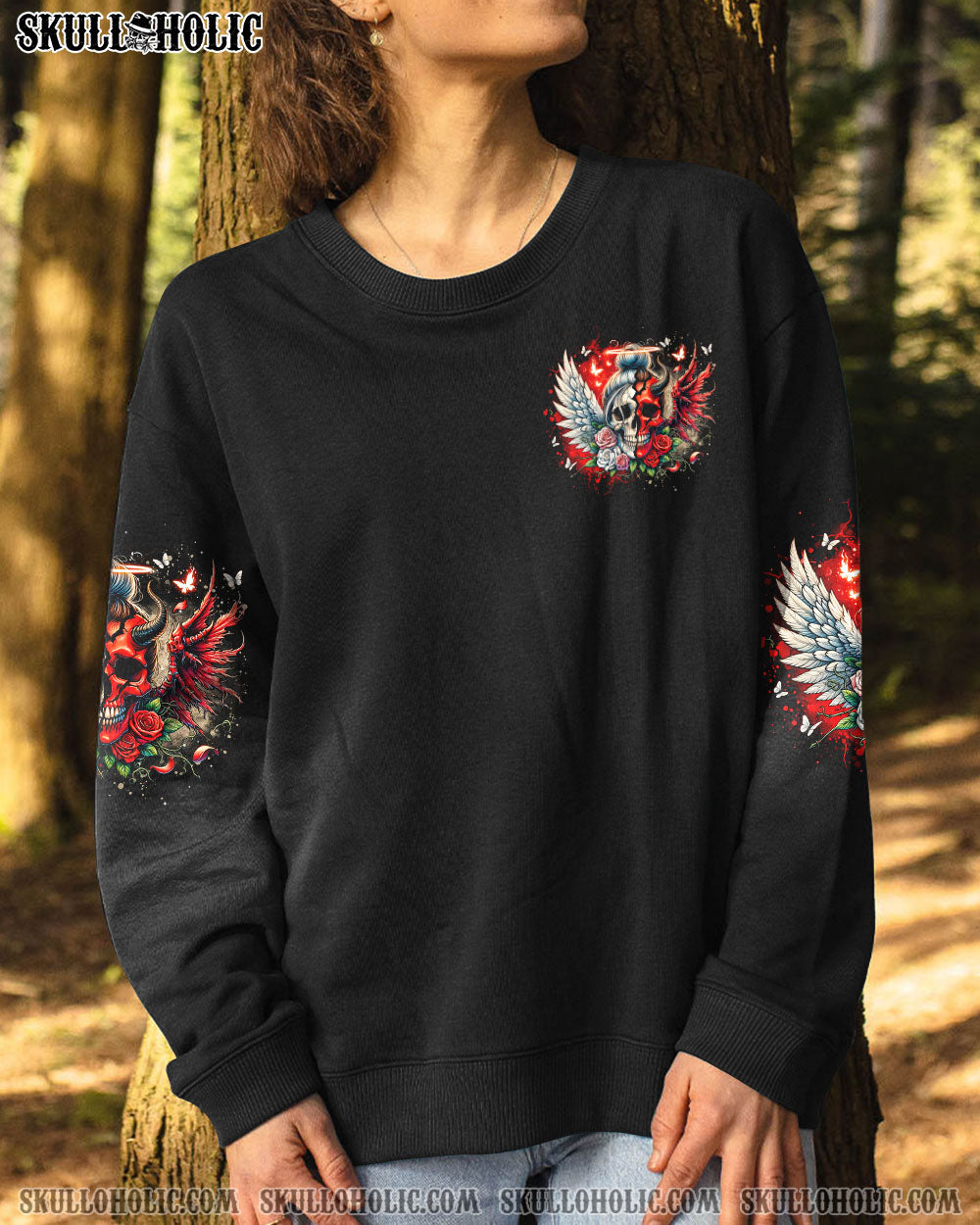 Embrace the duality of human nature with our captivating design featuring a half-angel, half-demon skull. Adorned with delicate roses and graceful butterflies, it serves as a powerful reminder of the deceptive nature of trust. Let this artwork inspire you to tread carefully and trust wisely, as it symbolizes the fragility of innocence and the allure of temptation. 🌹🦋💀
