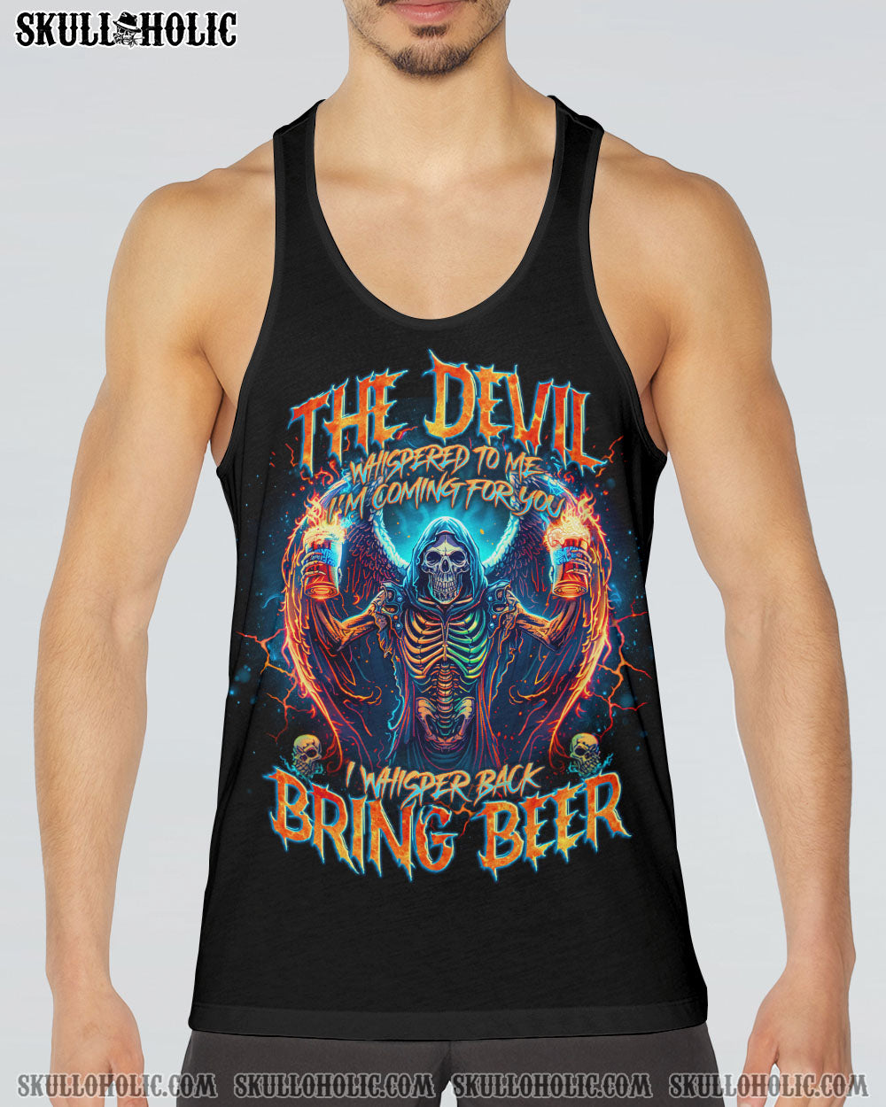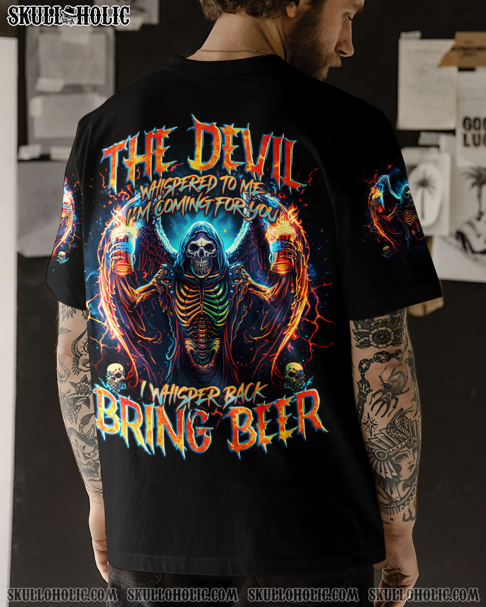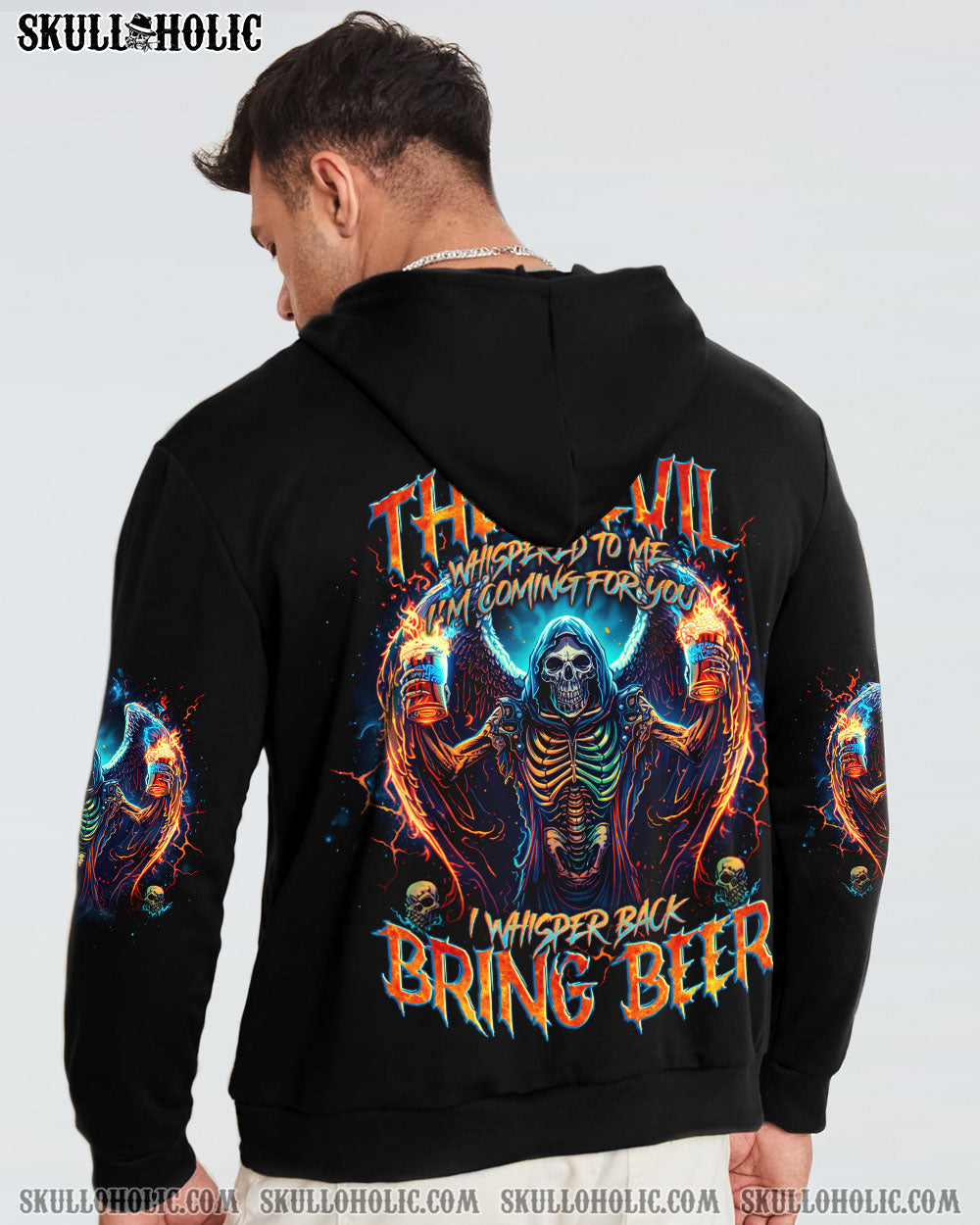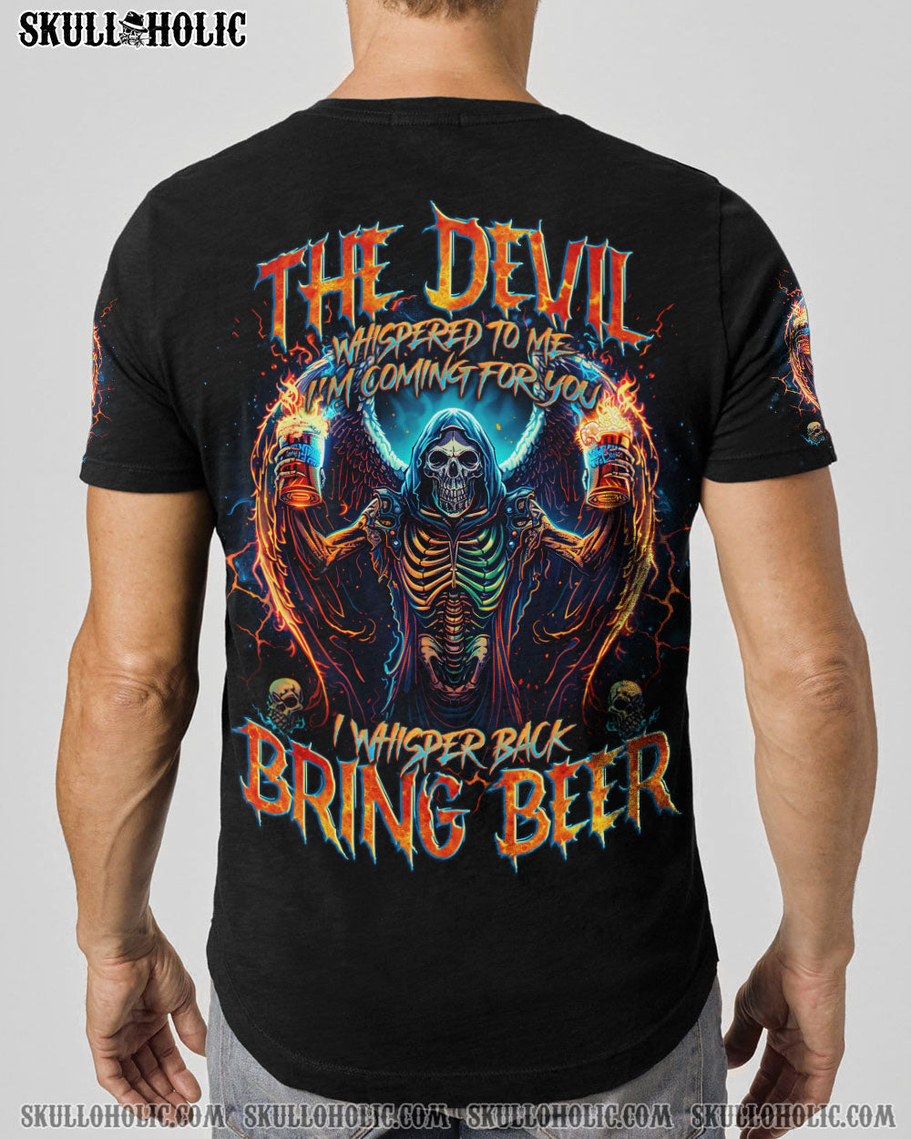 Unleash your fearless spirit with our BRING BEER SKULL REAPER ALL OVER PRINT. Emblazoned with a defiant skull reaper, wings spread wide, holding two glasses of beer. The quote “the devil whispers to me ‘I’m coming for you’, I whisper back ‘Bring beer'” represents a fearless response to challenges, overcoming with humor and resilience.