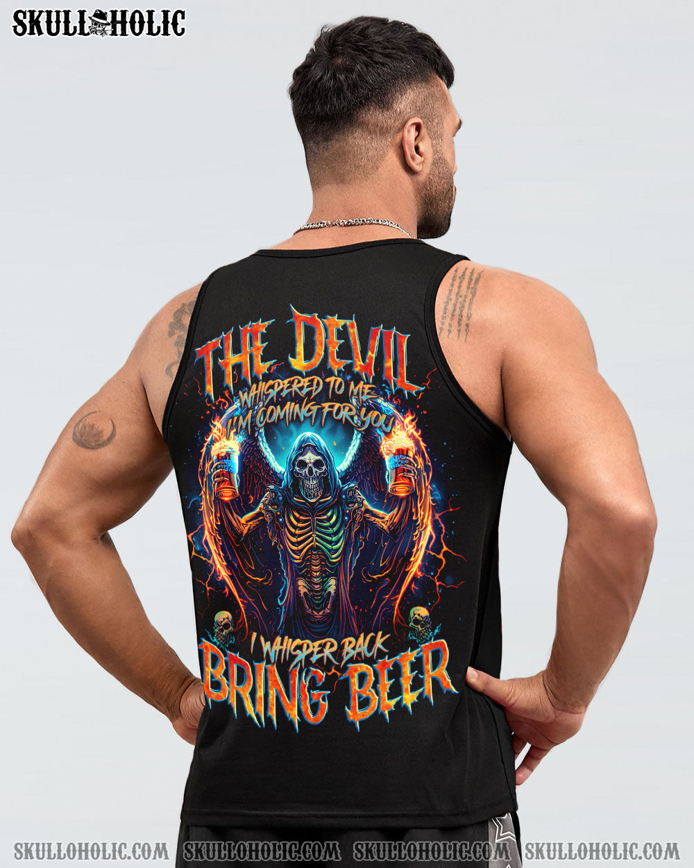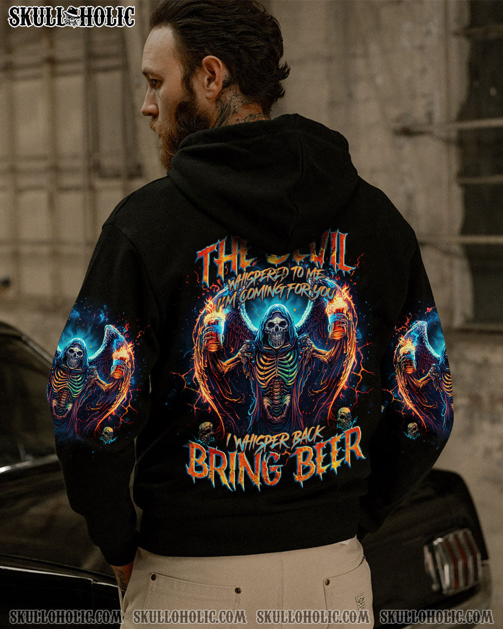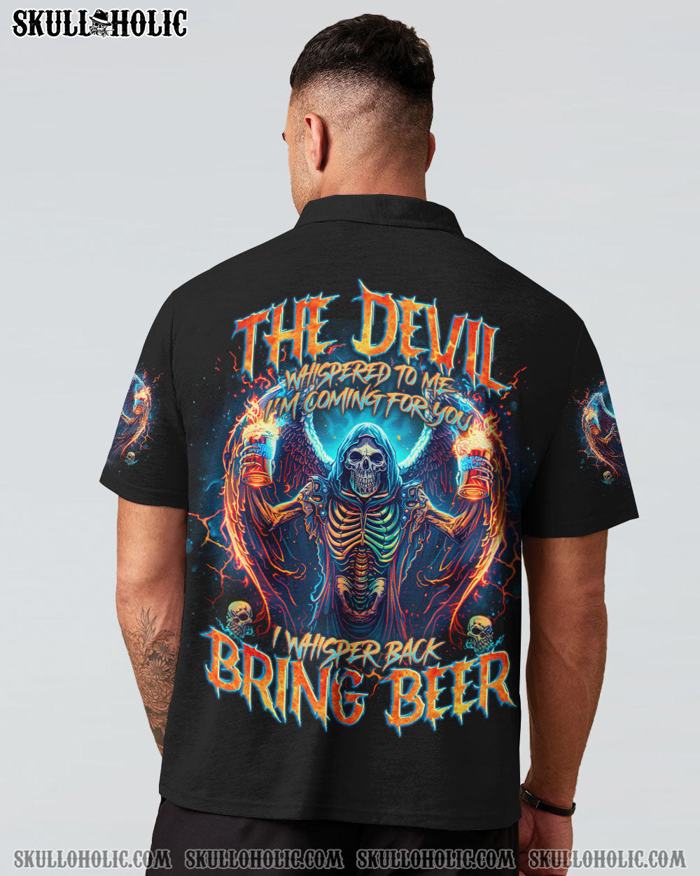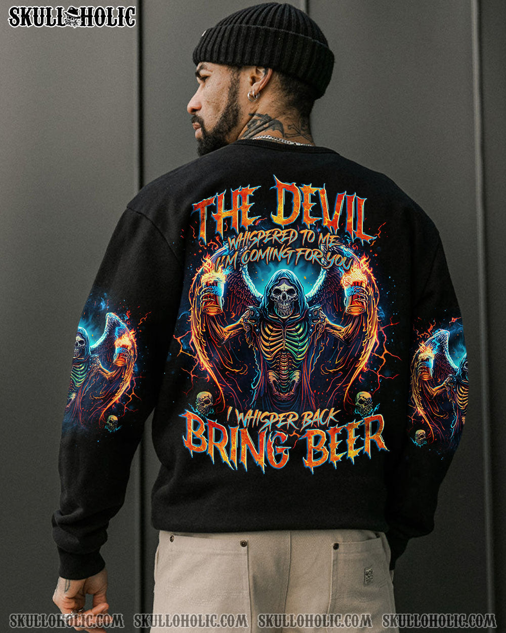Unleash your fearless spirit with our BRING BEER SKULL REAPER ALL OVER PRINT. Emblazoned with a defiant skull reaper, wings spread wide, holding two glasses of beer. The quote “the devil whispers to me ‘I’m coming for you’, I whisper back ‘Bring beer'” represents a fearless response to challenges, overcoming with humor and resilience.