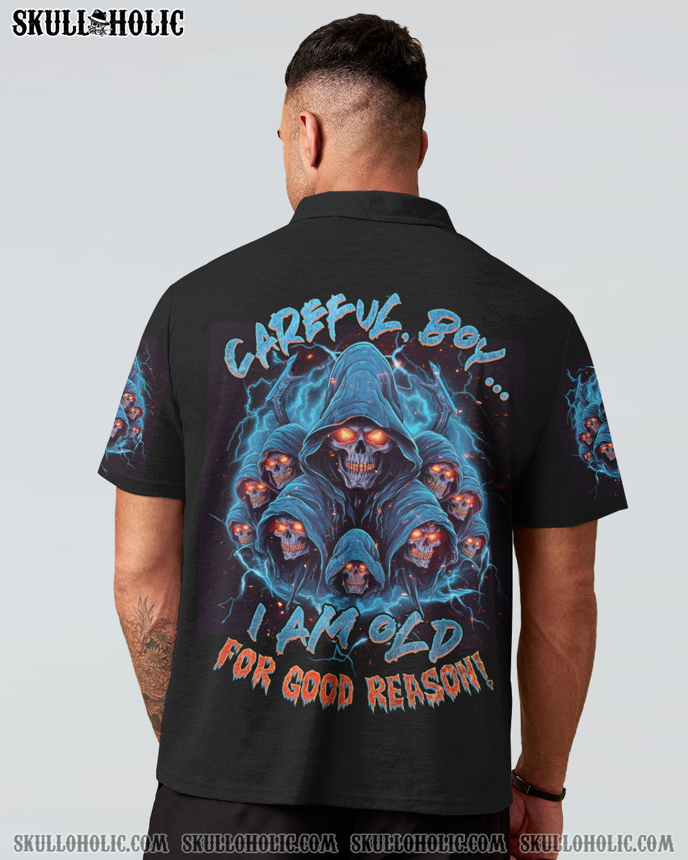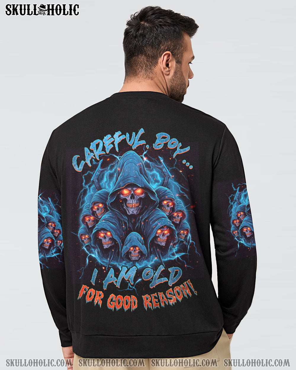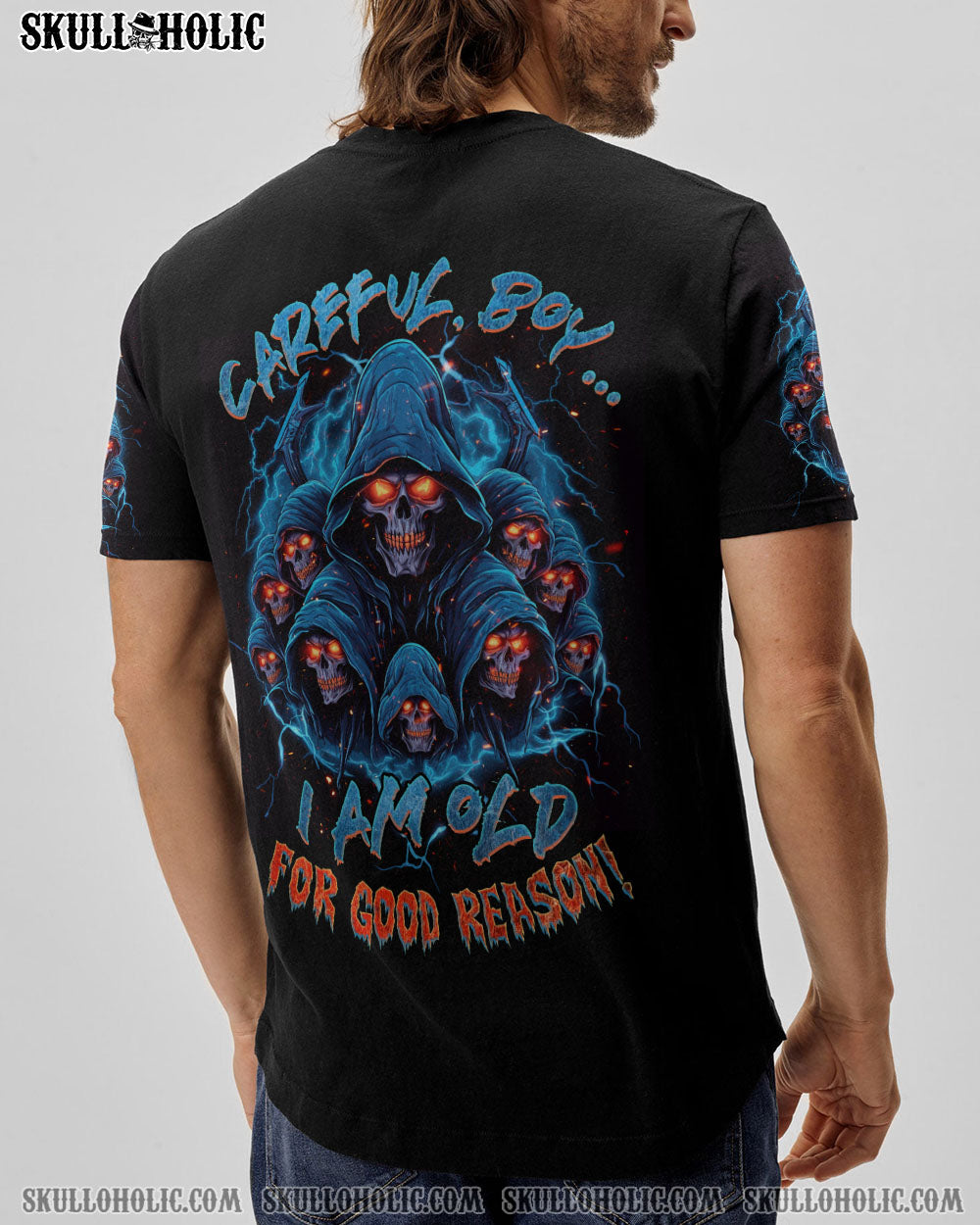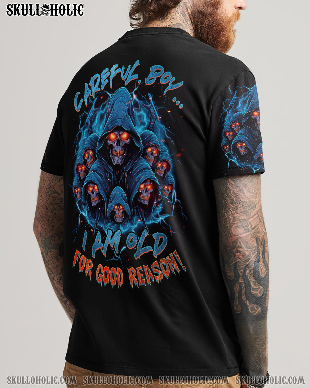 Be bold and powerful in our CAREFUL BOY REAPER ALL OVER PRINT – TLNZ1906231. Featuring a captivating reaper skull with fiery eyes and electrifying lightning, this design exudes resilience and authority. Accompanied by the phrase “Careful boy, I am old for good reason,” this utilitarian symbol reminds us that wisdom and experience are formidable. Showcase your strength and the lessons you’ve learned in life with this stylish piece.