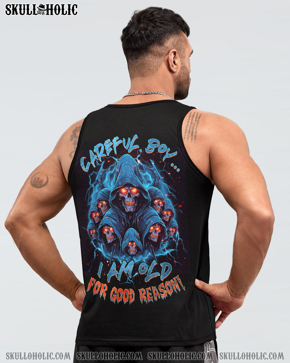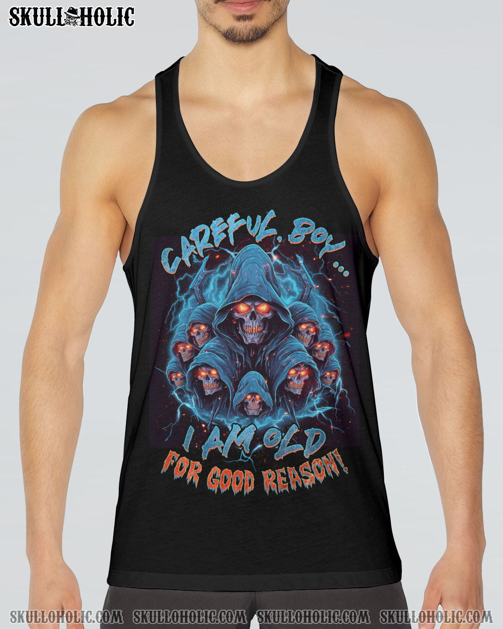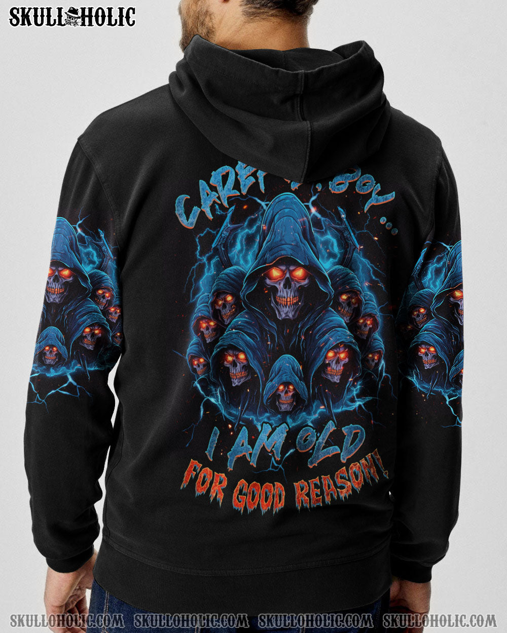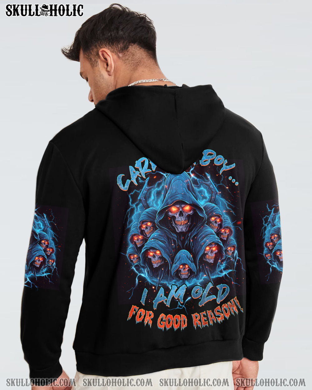 Be bold and powerful in our CAREFUL BOY REAPER ALL OVER PRINT – TLNZ1906231. Featuring a captivating reaper skull with fiery eyes and electrifying lightning, this design exudes resilience and authority. Accompanied by the phrase “Careful boy, I am old for good reason,” this utilitarian symbol reminds us that wisdom and experience are formidable. Showcase your strength and the lessons you’ve learned in life with this stylish piece.