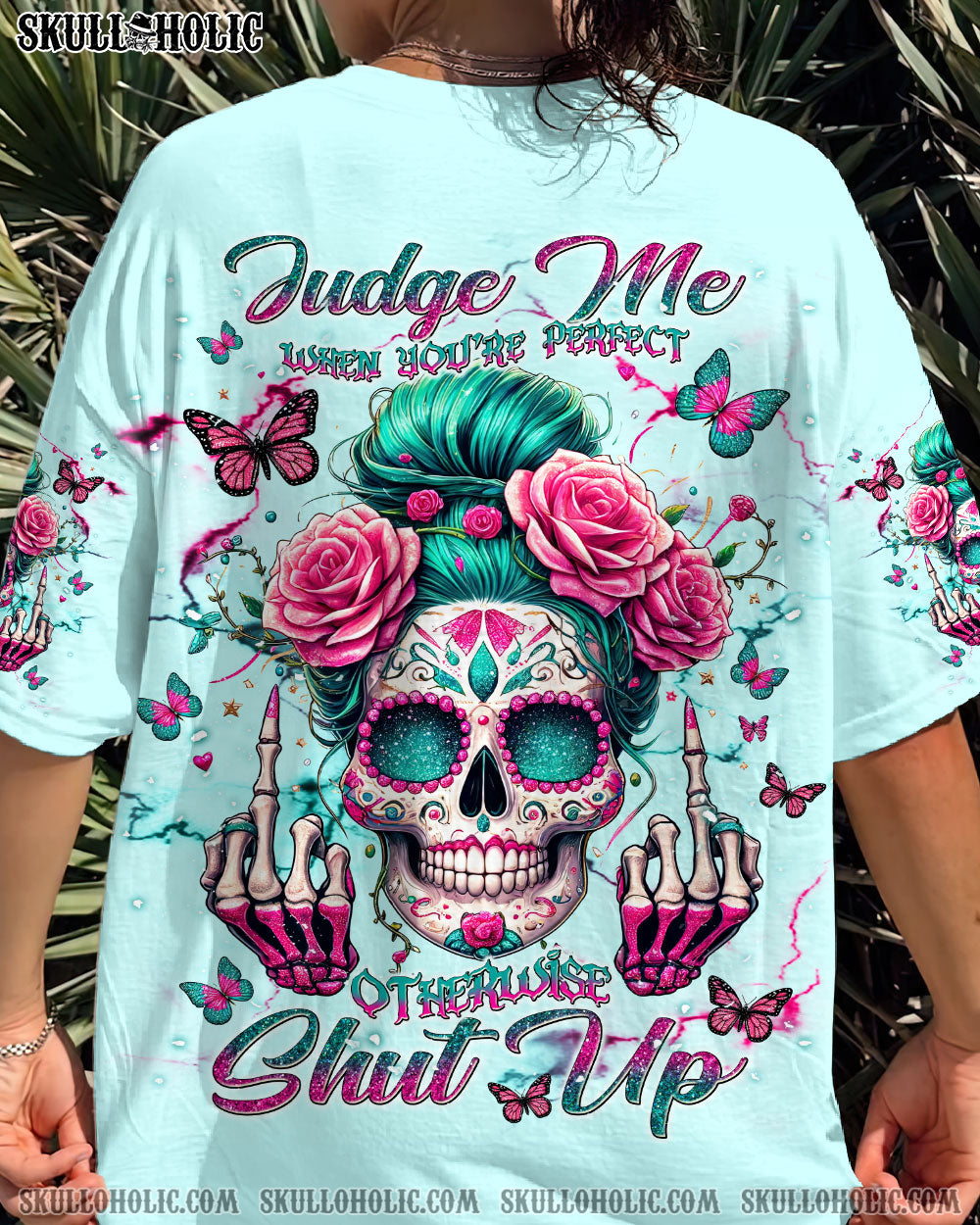 Embrace contradiction with our design: a skull with adorable hair ties, sweet yet mischievous smile, flashing two fingers, adorned with fairy wings, surrounded by butterflies. Capture the playful duality with our intriguing design. Unleash your unique charm.
