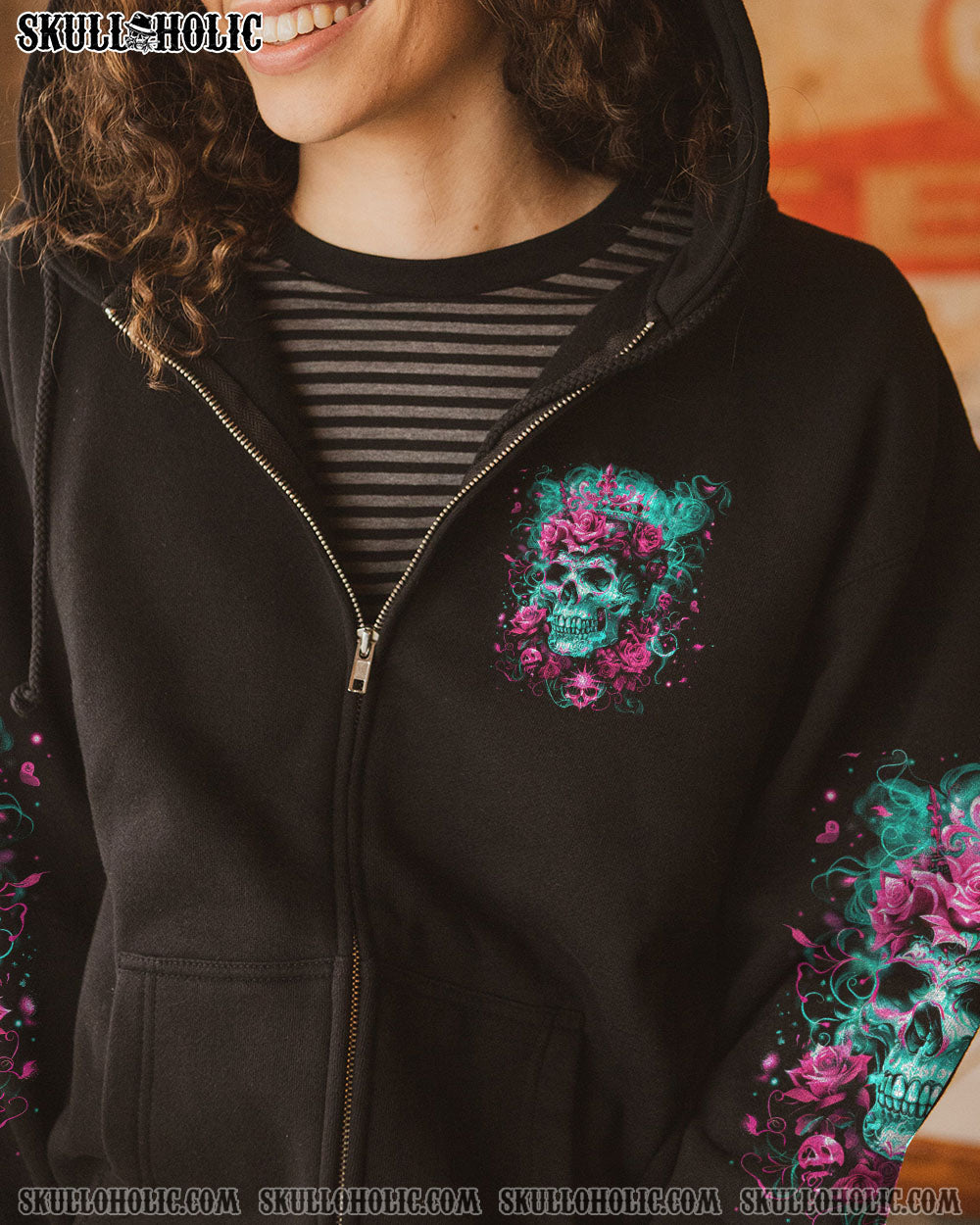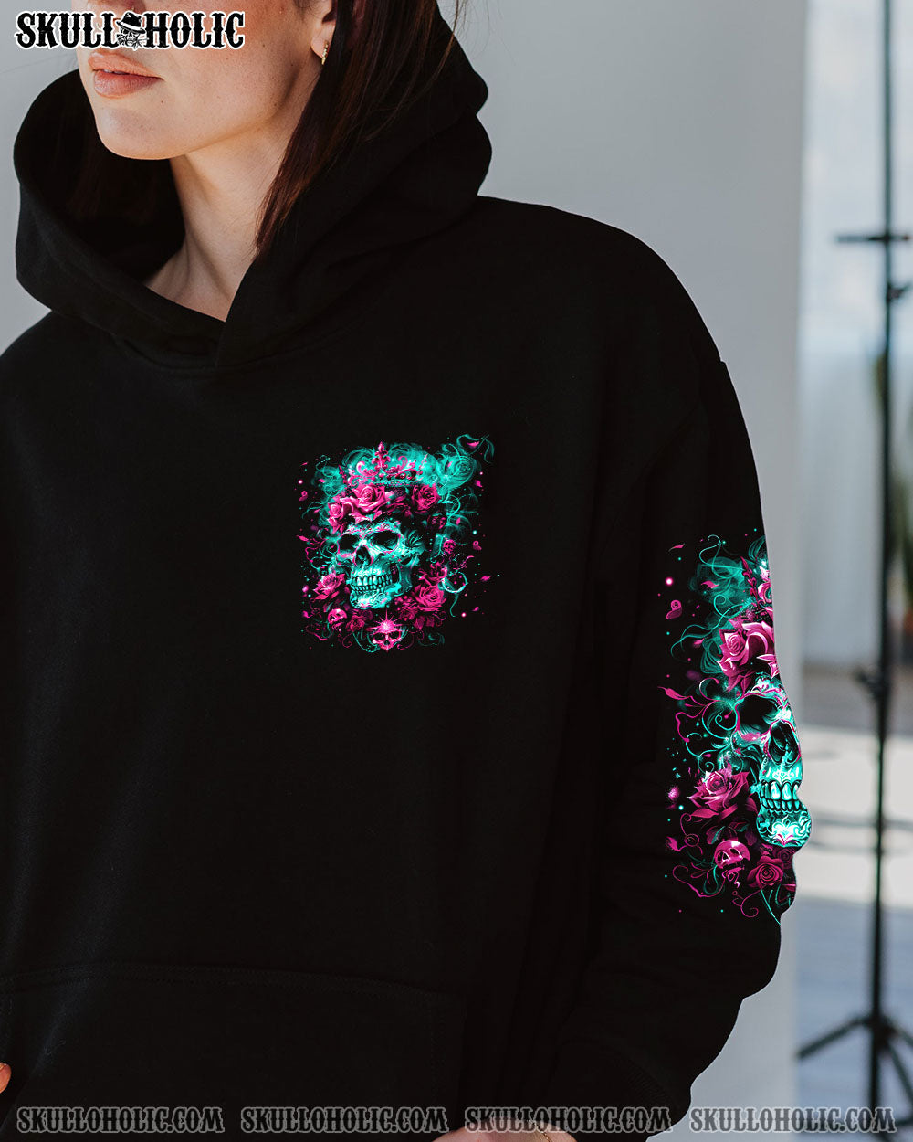 Step into the extraordinary with our captivating all-over print. A masterful fusion of a skull and a rose, enveloped in ethereal smoke, and accompanied by a thought-provoking quote. The contrast, complexity, and interplay of life’s beauty and the enigmatic nature of existence are captured in this visually striking design. Embrace the unexpected allure.