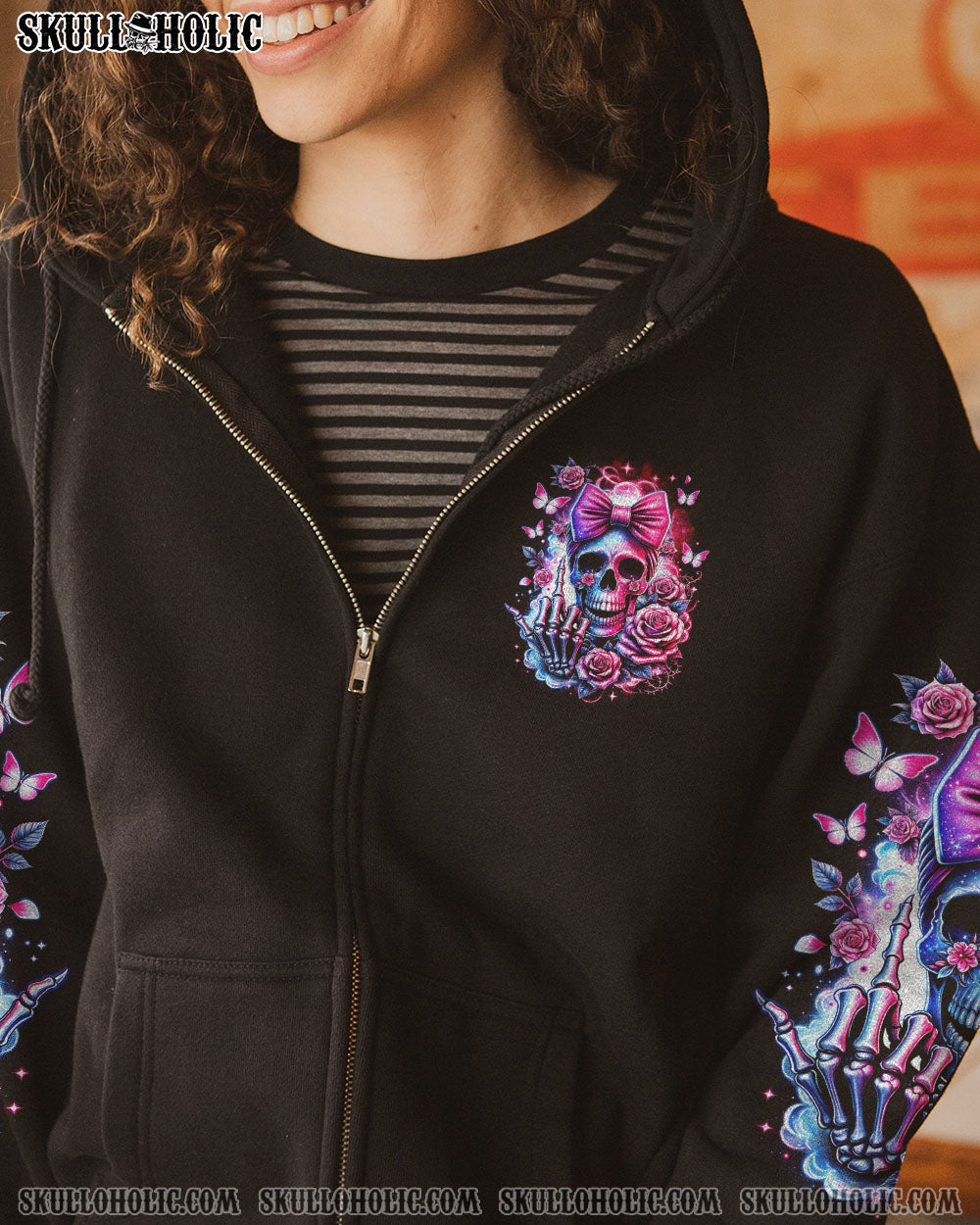 Journey through an alluring design with our “DON’T MESS WITH ME” print. Adorned with a skull, bows, roses, and butterflies, this piece celebrates the balance between darkness and beauty. A powerful quote adds depth, making this design a bold statement of life’s intricate nature.