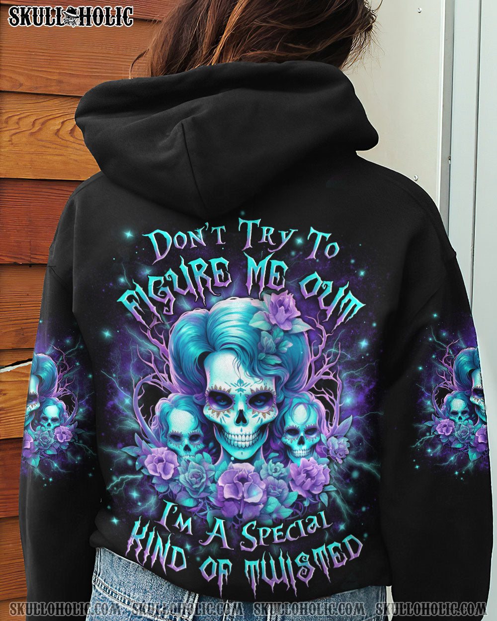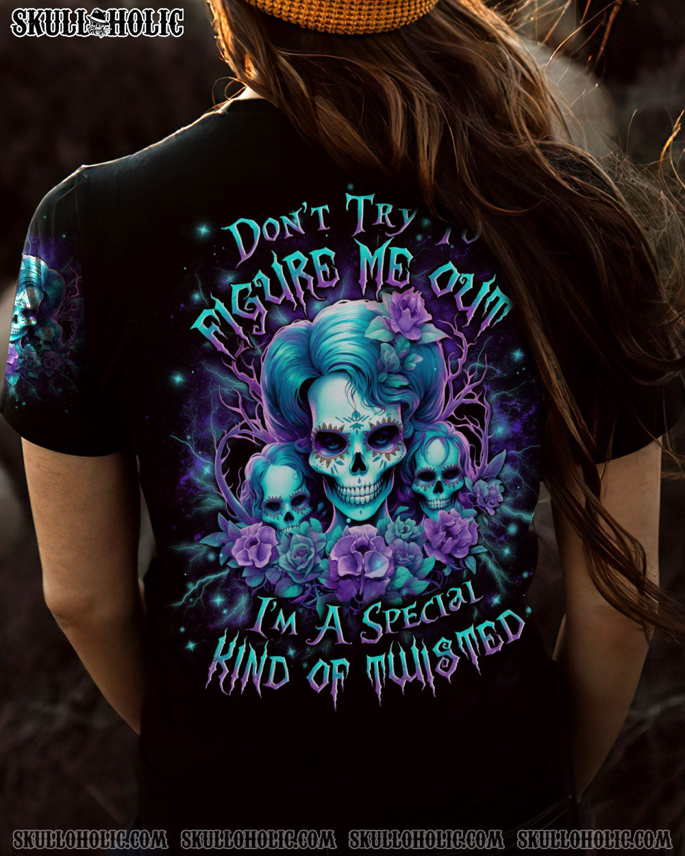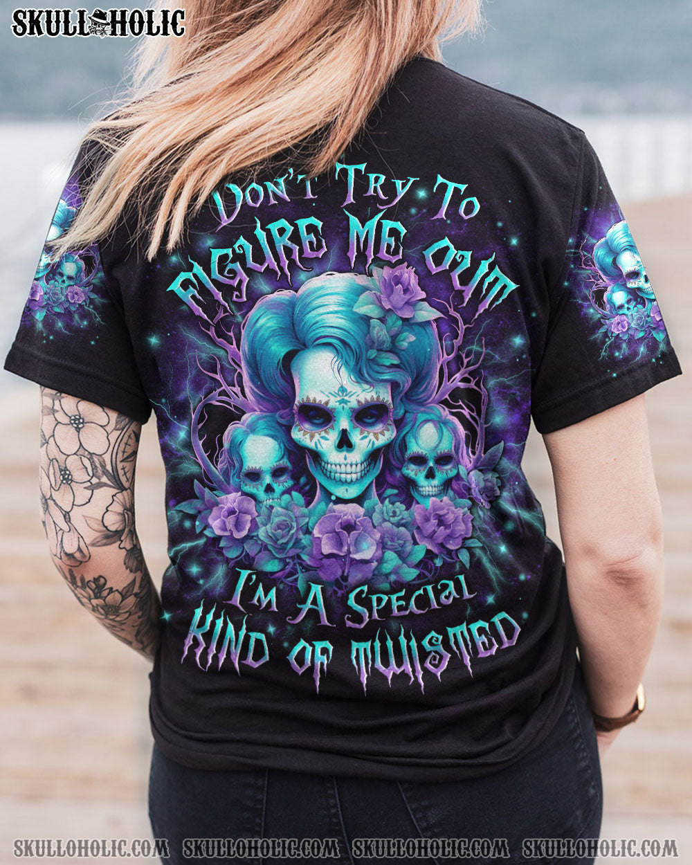 Be an enigma no more! Stand out in this striking “Don’t Try to Figure Me Out; I’m a Special Kind of Twisted” all-over print t-shirt and proudly declare your unique spirit. Showcase your quirks and individuality with confidence and command attention wherever you go. Make a statement and embrace your one-of-a-kind identity with this must-have design.