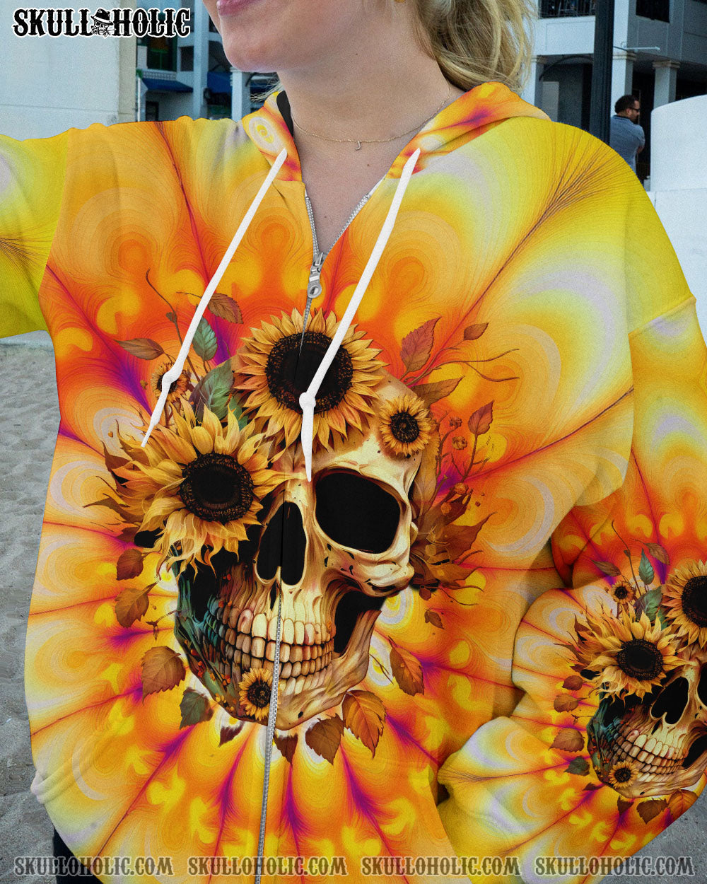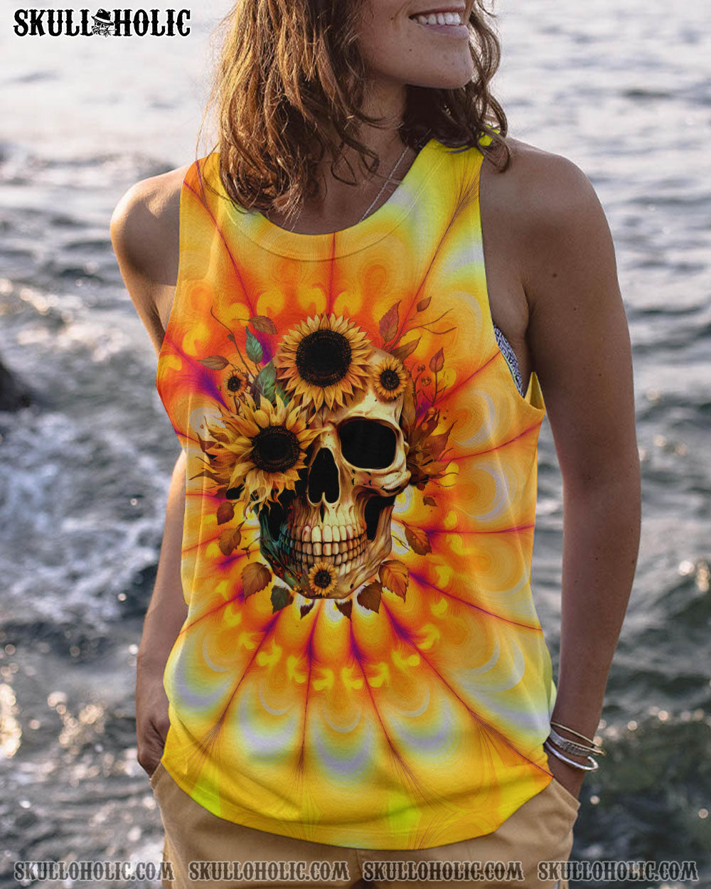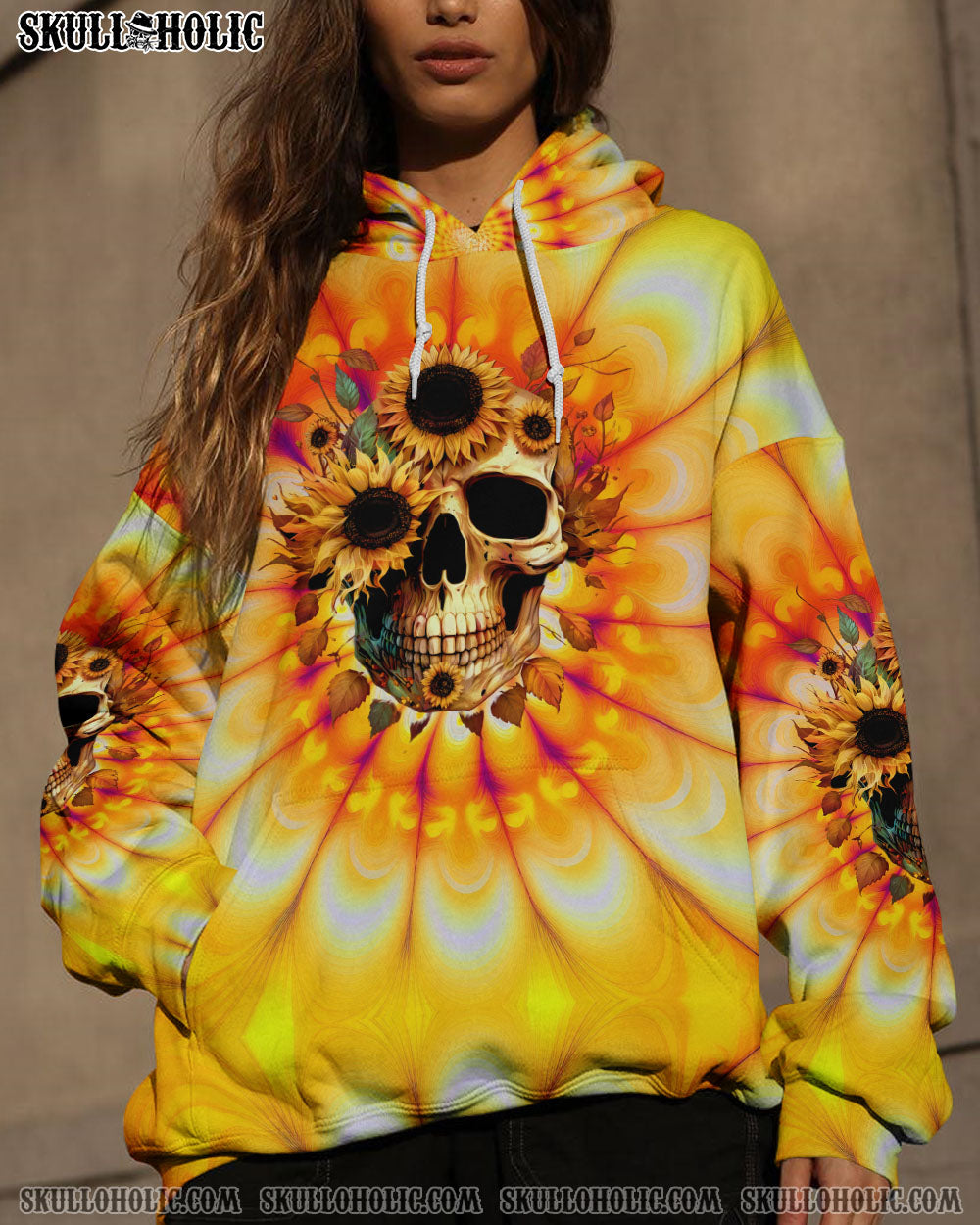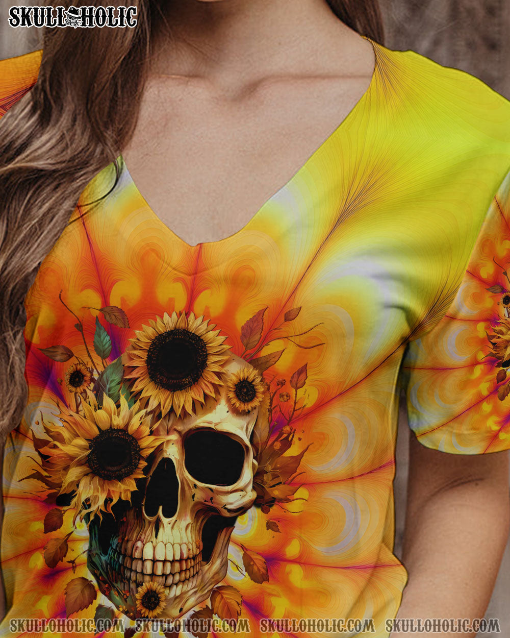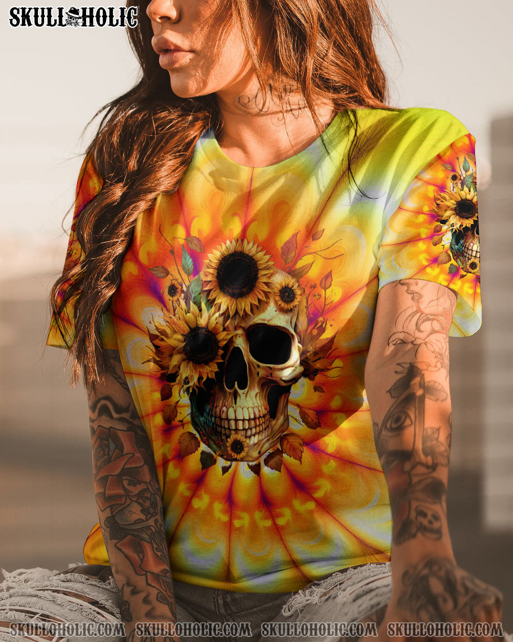 Brighten up your wardrobe with this design. It features a captivating sunflower and skull print set against a vibrant tie-dye background, perfect for expressing your free-spirited personality and carefree lifestyle.Â