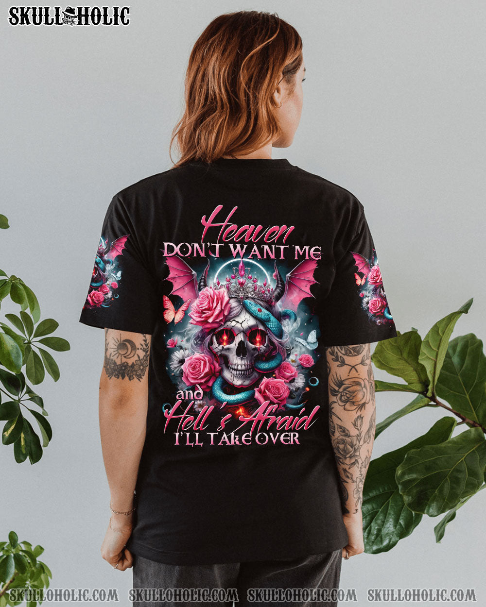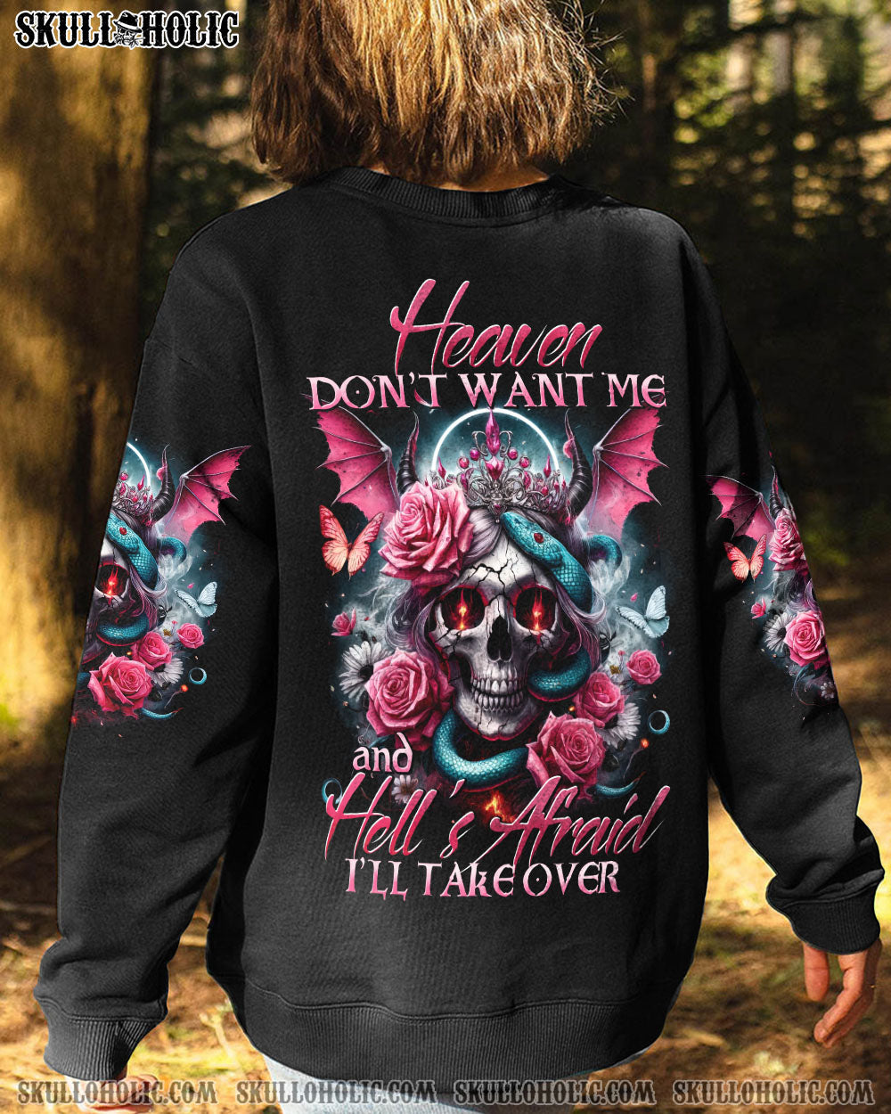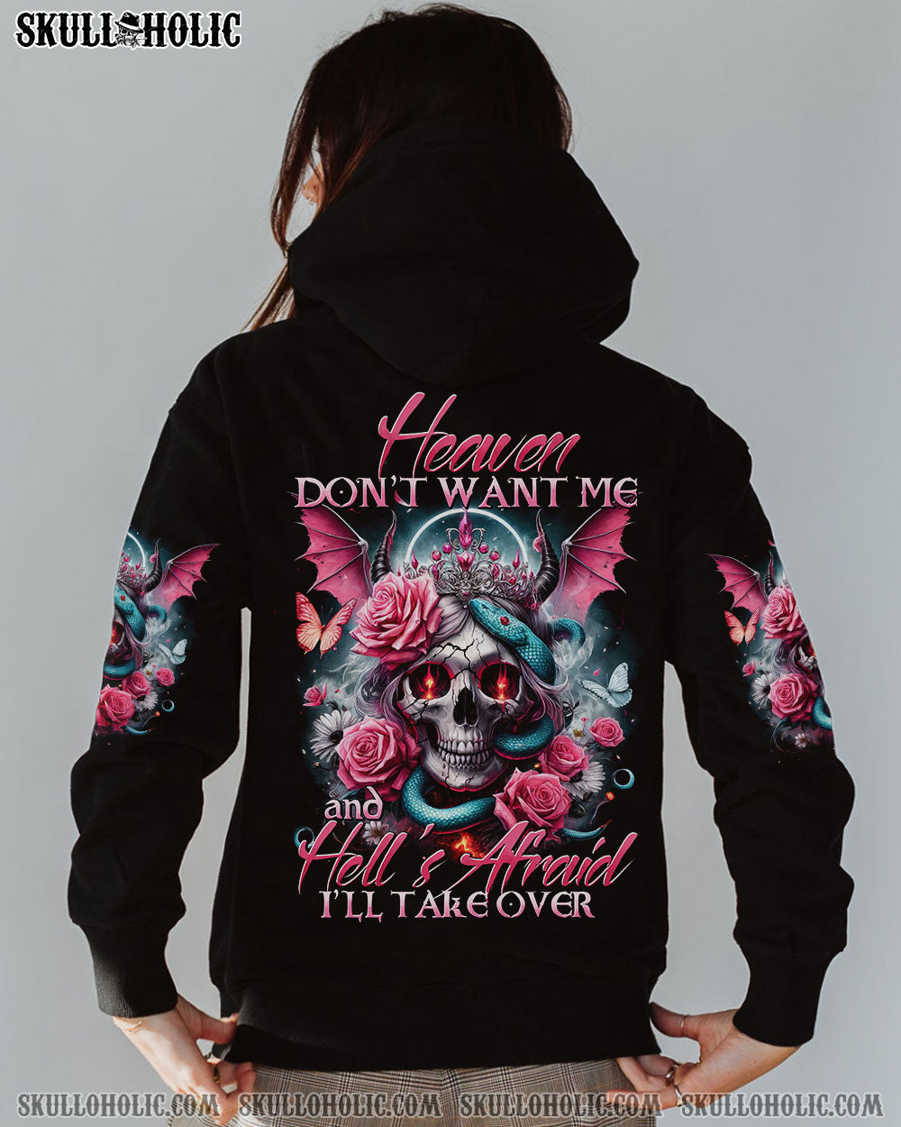Embrace your uniqueness with our captivating “Heaven Don’t Want Me” all over print design. Featuring a fusion of skull angel devil crown, halo, wings, horns, roses, snakes, butterflies, and an empowering quote, this striking masterpiece embodies resilience, defiance, and duality. Let it inspire you to conquer any challenge.