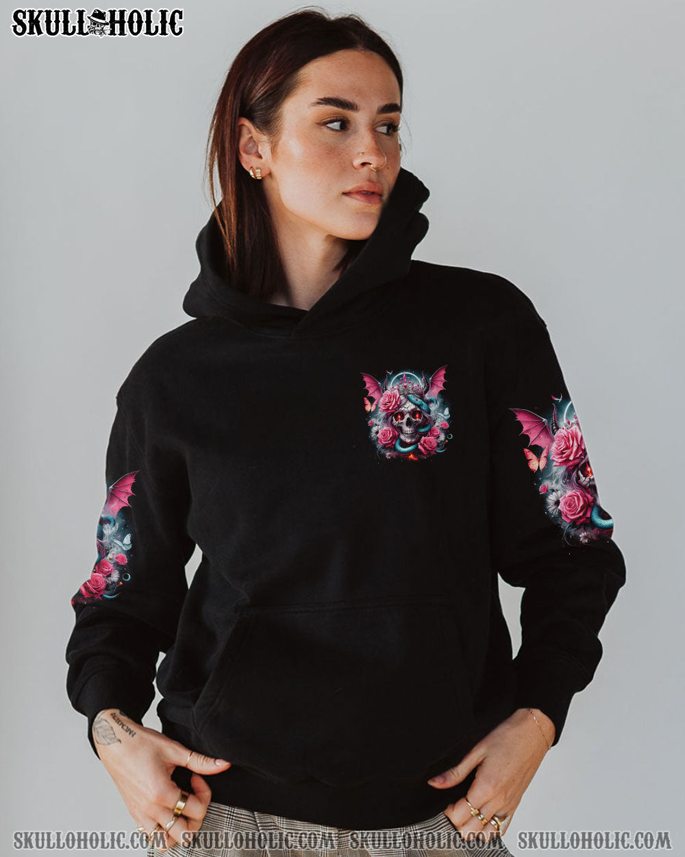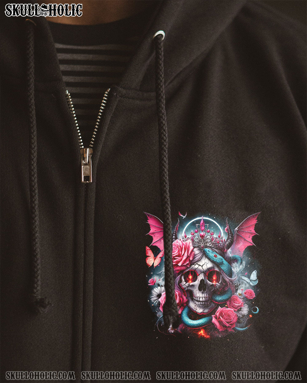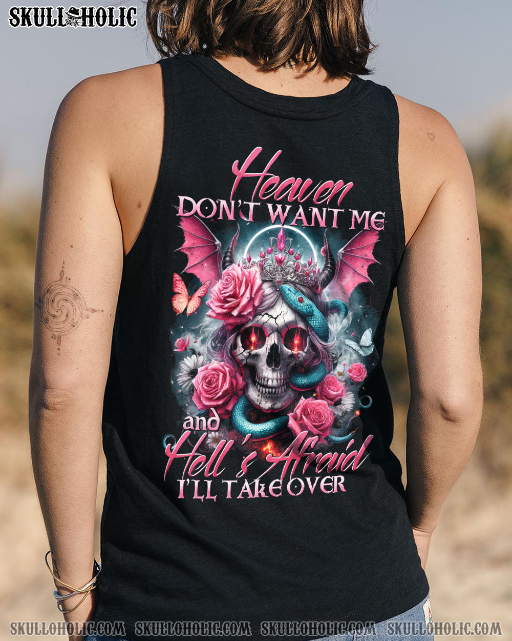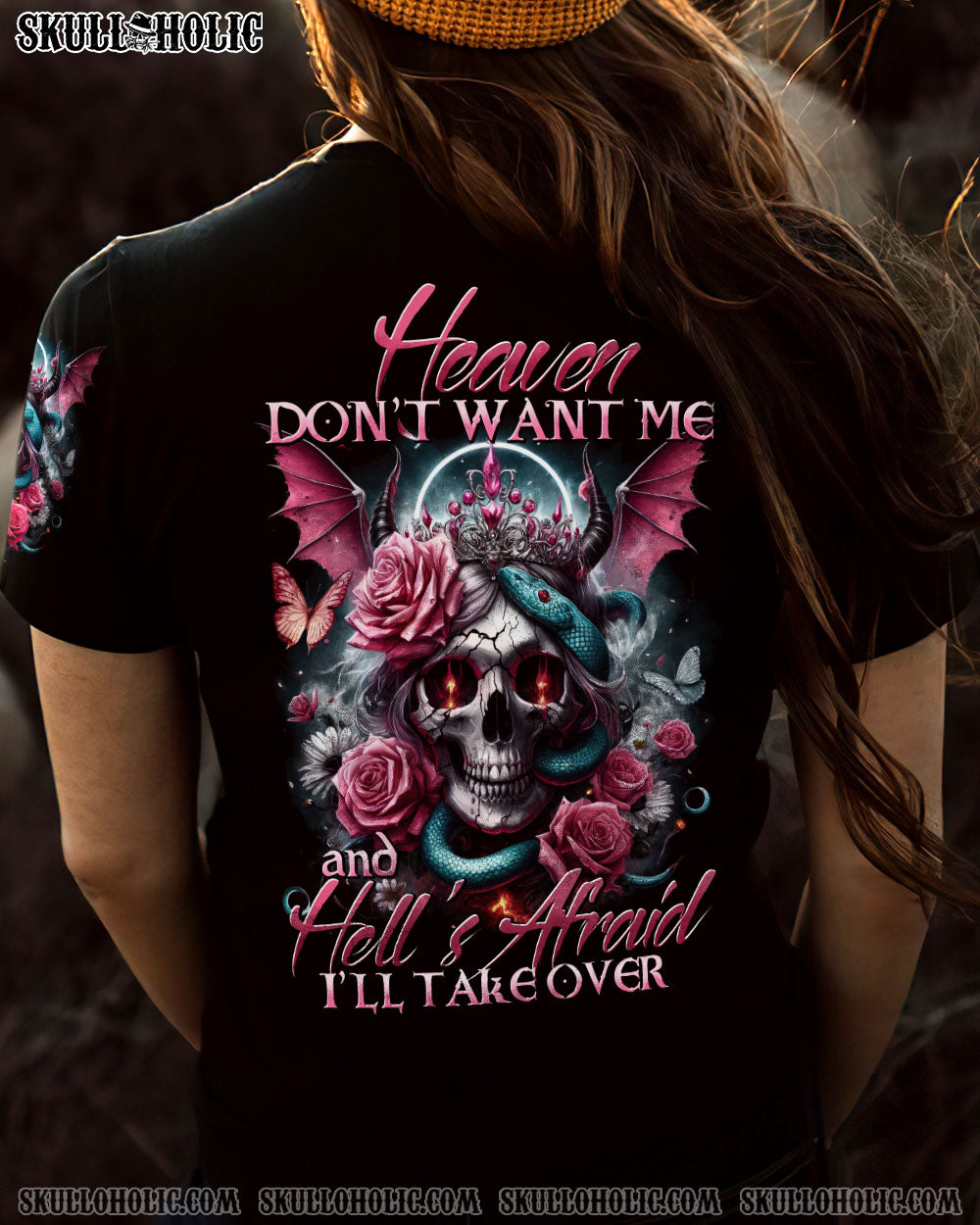 Embrace your uniqueness with our captivating “Heaven Don’t Want Me” all over print design. Featuring a fusion of skull angel devil crown, halo, wings, horns, roses, snakes, butterflies, and an empowering quote, this striking masterpiece embodies resilience, defiance, and duality. Let it inspire you to conquer any challenge.