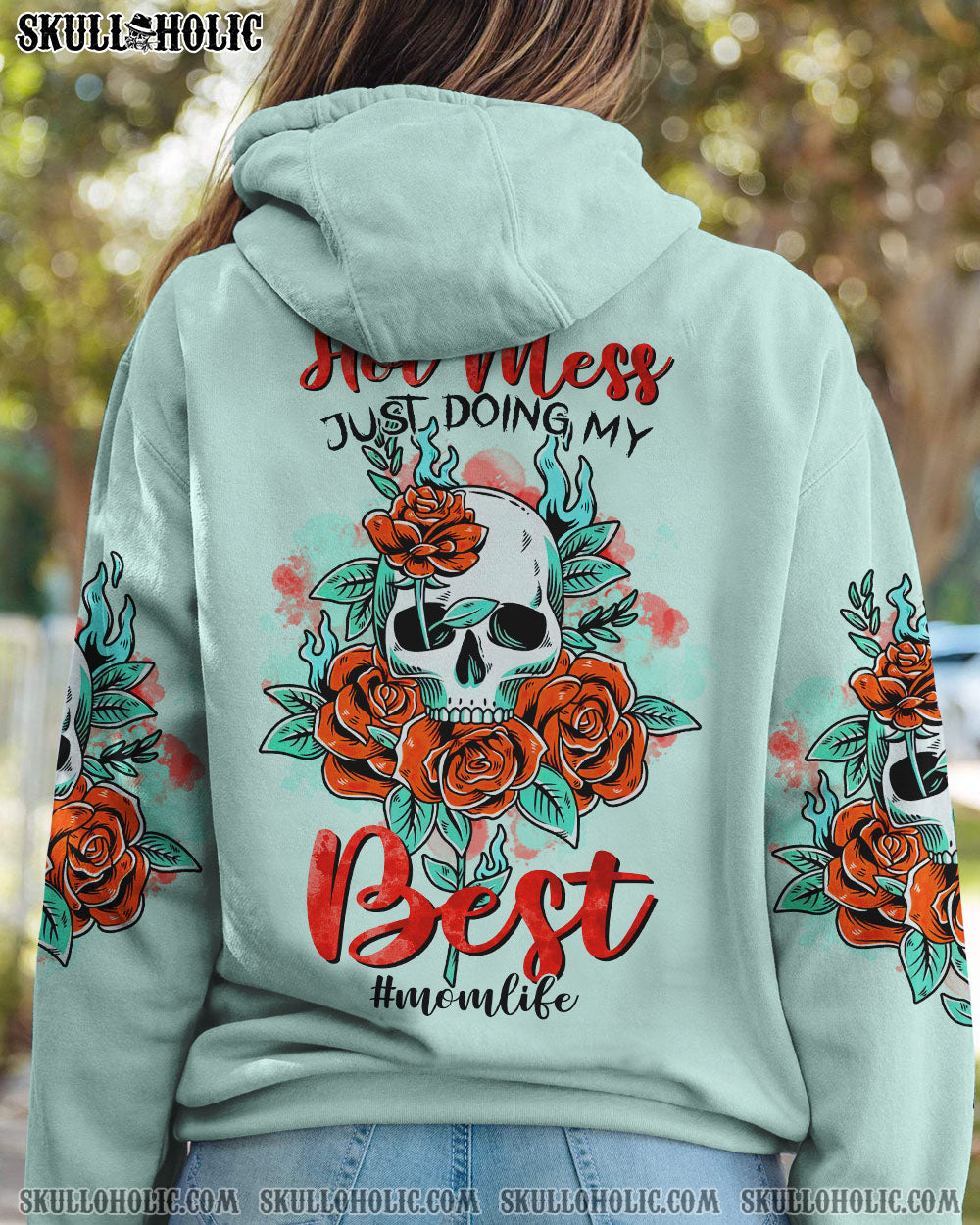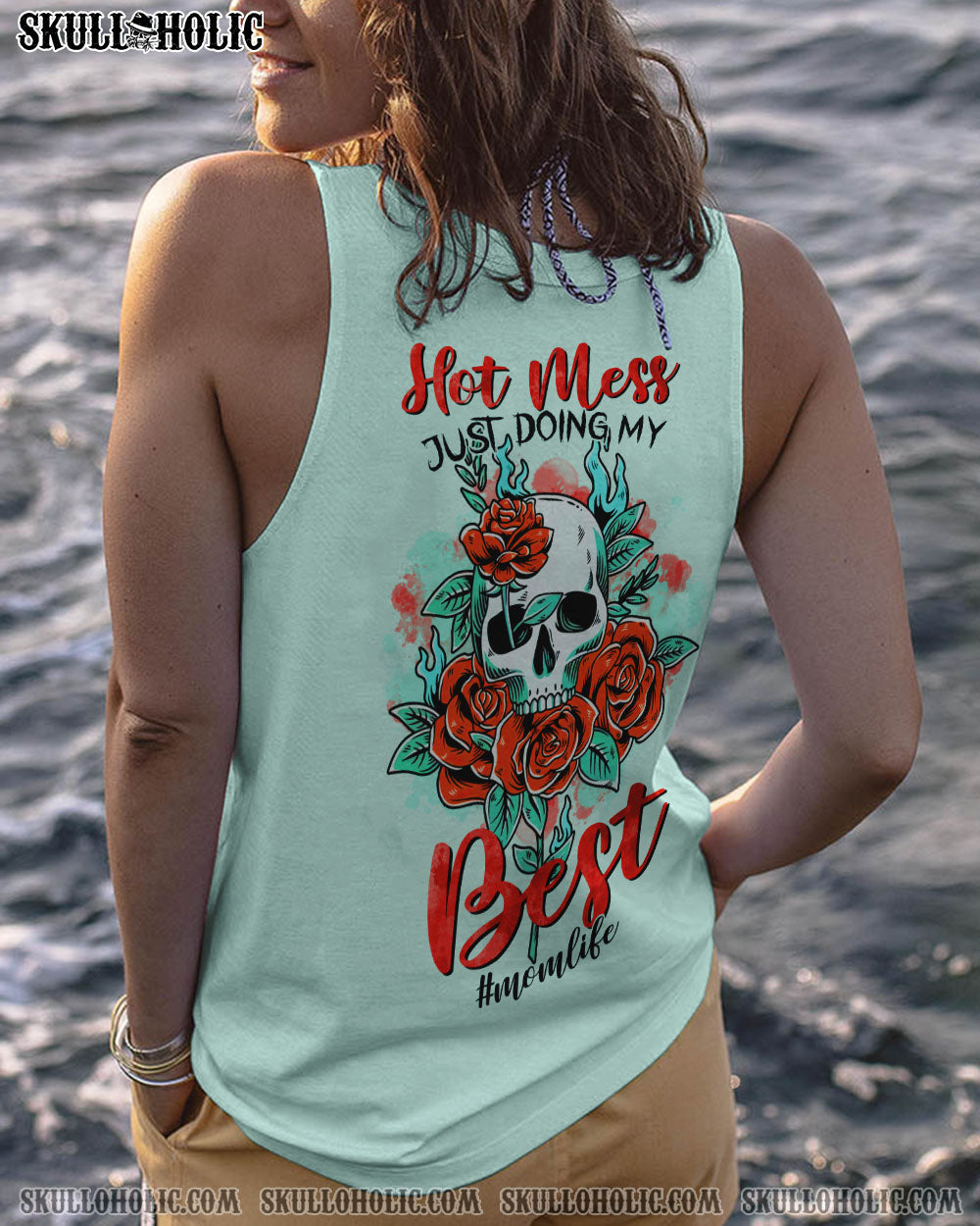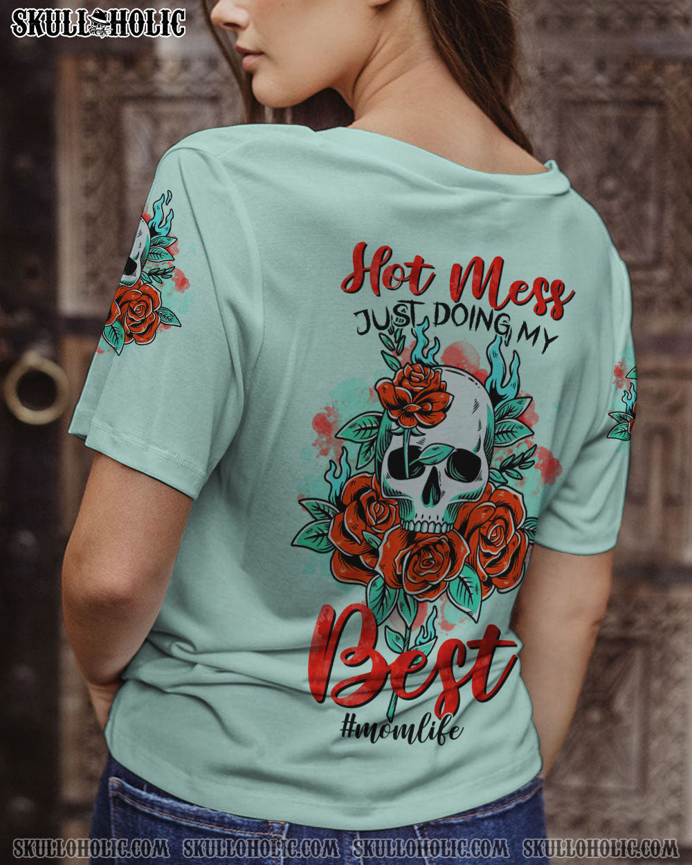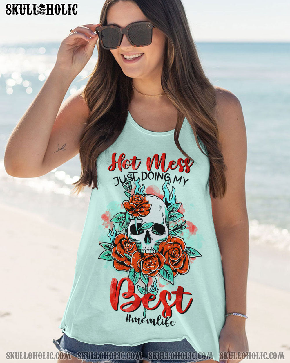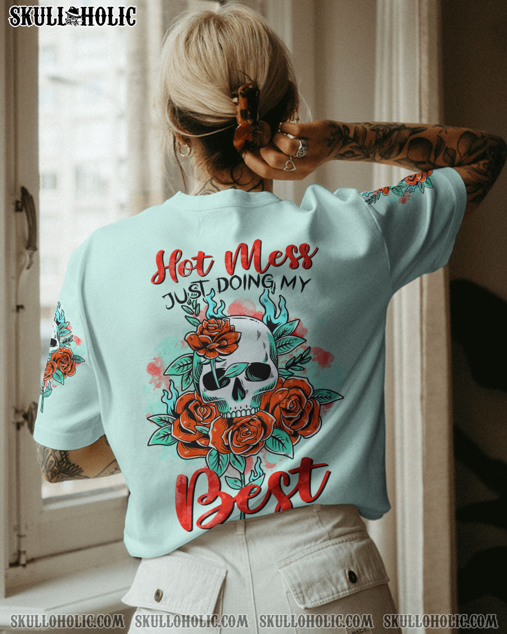 Calling all trendy moms! Elevate your wardrobe with our latest design that blends skulls, roses, and a gentle pastel blue background in a unique way. Don’t miss out on the chance to add a touch of edginess to your style. Featuring the saying “Hot mess just doing my best,” you can proudly showcase the hard work and sacrifices you make as a mother. Don’t hesitate to order now and let the world know that you’re a fierce mama who can rock any look!