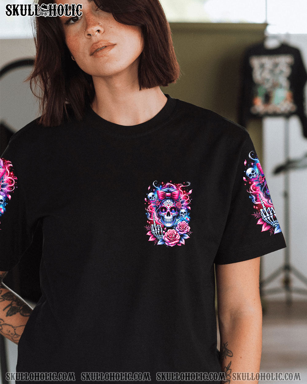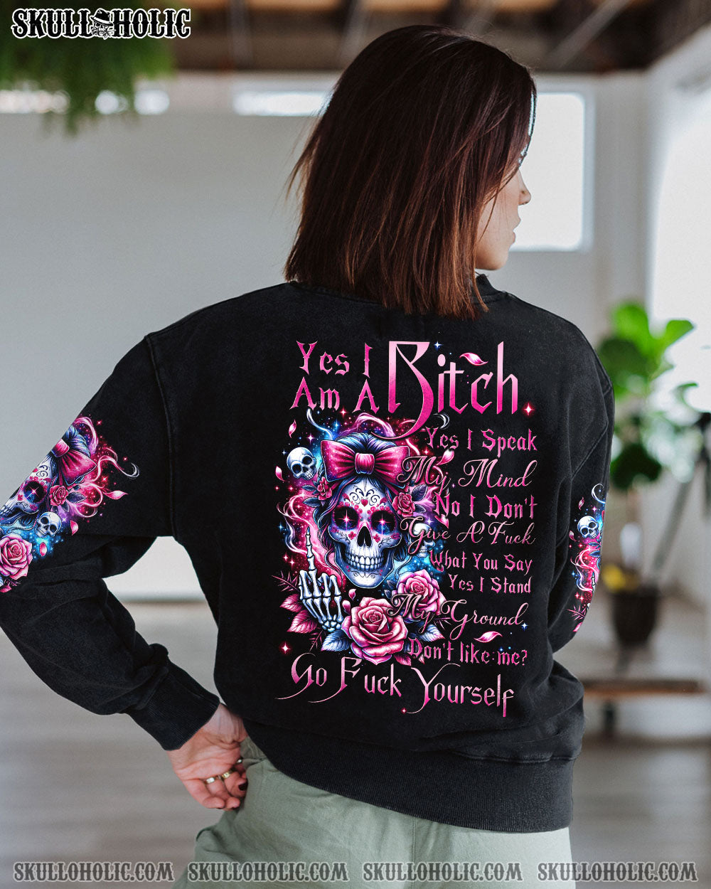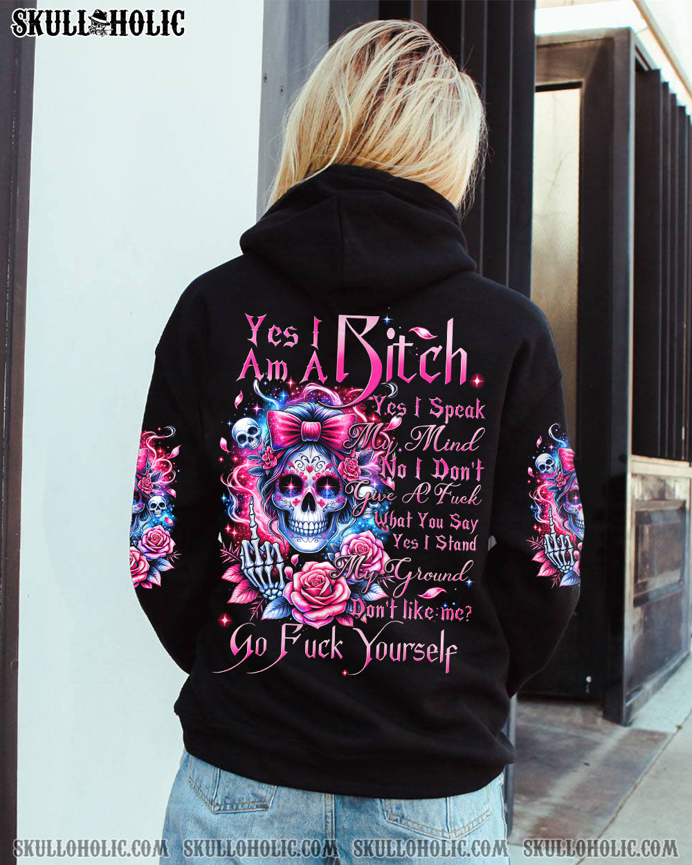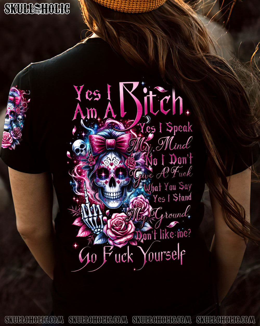 Unleash your unapologetic and fearless spirit with our captivating I AM A B I SPEAK MY MIND ALL OVER PRINT. Featuring a sassy messy bun skull surrounded by vibrant roses, this design celebrates authenticity and individuality. Stand tall and confident against societal judgment with this bold and empowering statement. Embrace your unique self with every glance at this striking and expressive masterpiece.