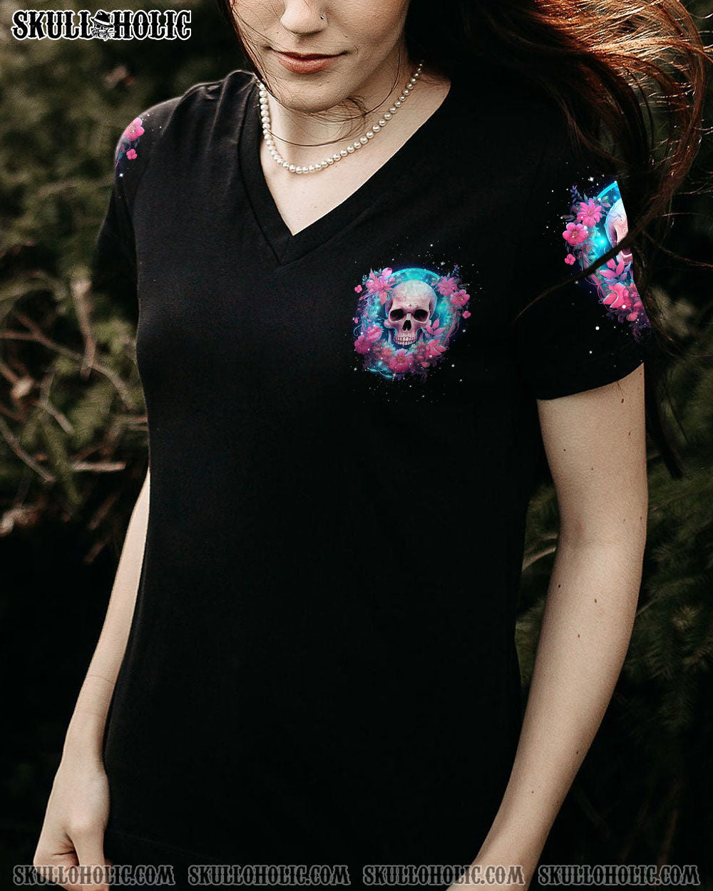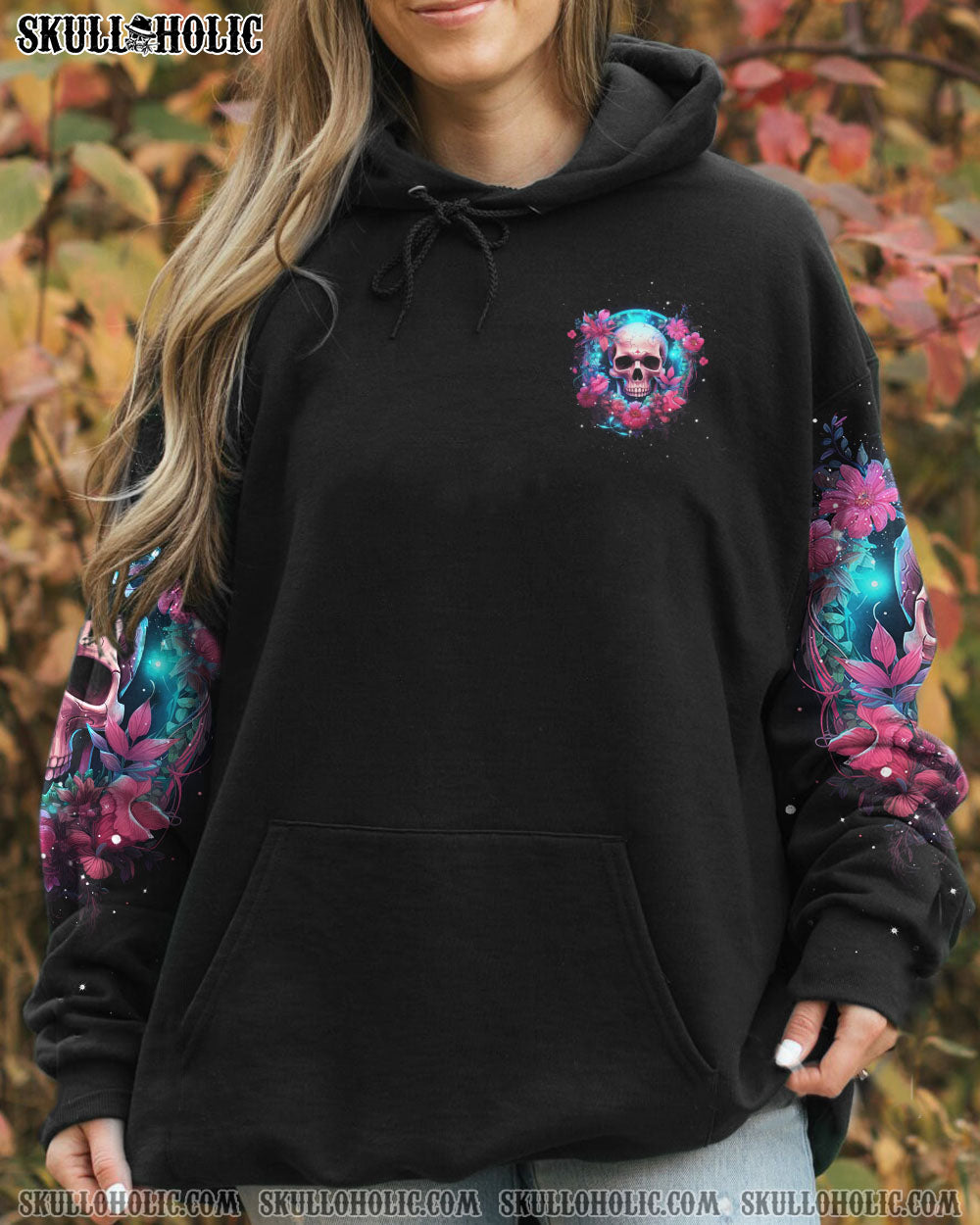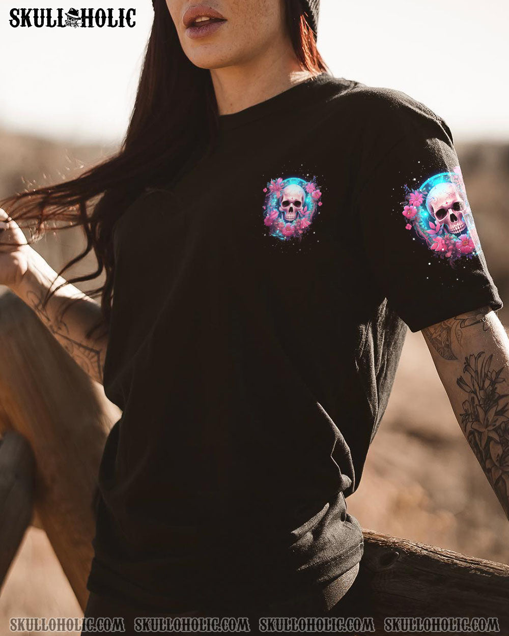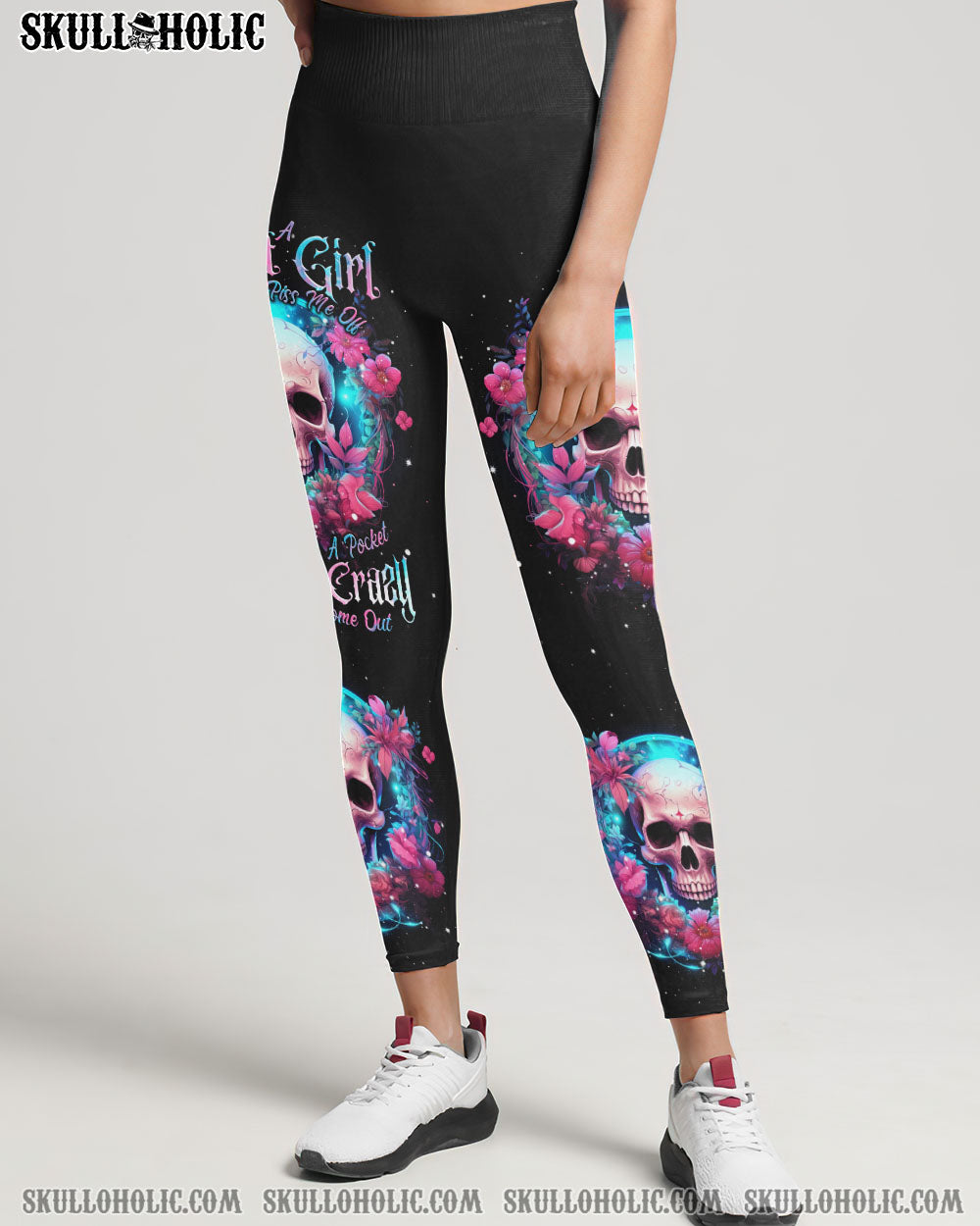 Welcome to our captivating shimmering skull design, embellished with intricate images of flowers and leaves, creating a bold and remarkable statement. The phrase, “I am a sweet girl but if you piss me off, I always have a pocket full of crazy waiting to come out,” playfully highlights the concept of a multi-faceted personality. It signifies that beneath a pleasant and amiable exterior lies the potential for assertiveness and decisive action when provoked, serving as a reminder that one should never underestimate the depth and complexity of an individual’s character.