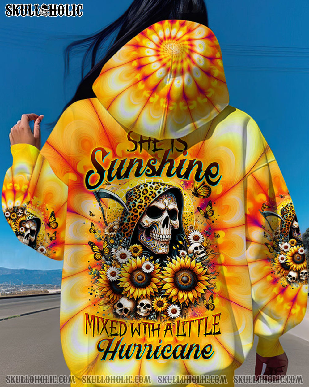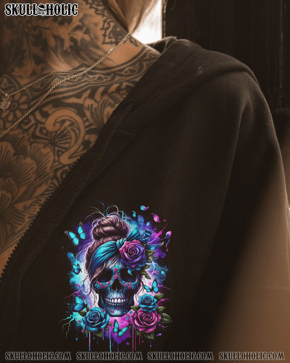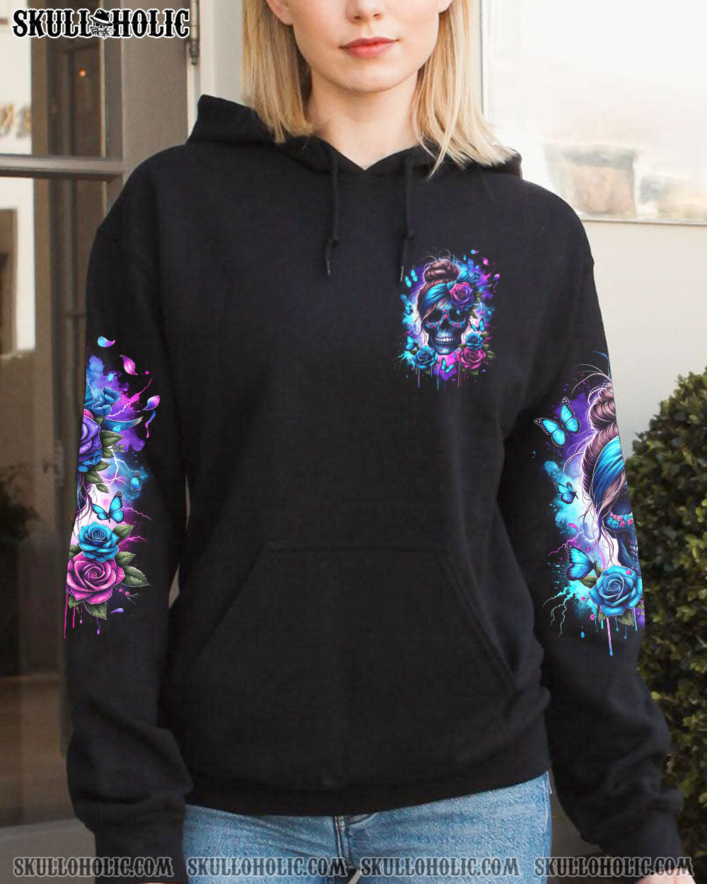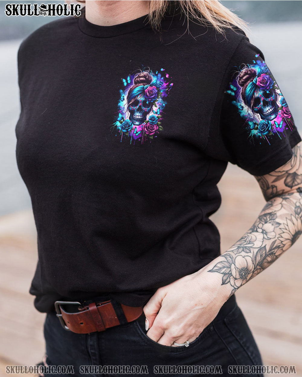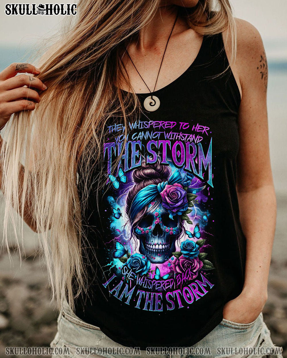 Enter the heart of a stunning storm with our unique design—a skull with a messy bun, adorned by a headband, framed by elegant roses, fluttering butterflies, and the electric energy of thunder. The impactful quote, “They whispered to her, you cannot withstand the storm. She whispered back, I am the storm,” adds a layer of fierce resilience to this striking composition. Beyond an accessory, it’s a declaration of inner strength and a celebration of formidable beauty in the face of challenges. Embrace the storm, make a bold statement with this extraordinary piece.