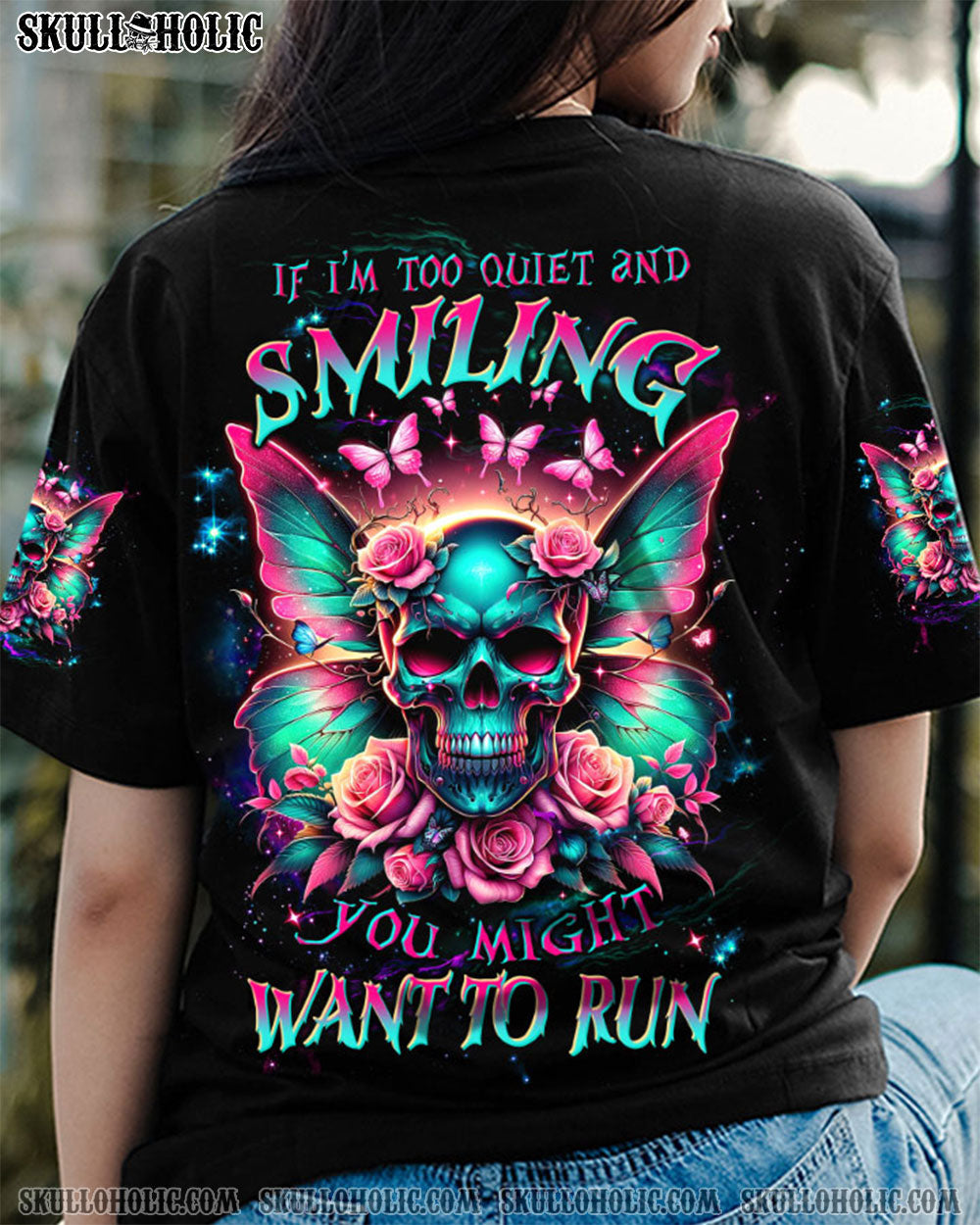 Be fierce and bold in this unique all-over print featuring a stunning skull with fairy wings, intense eyes, and delicate roses. Embody the powerful mantra, “I am the storm” and use your inner strength and resilience to conquer life’s challenges.