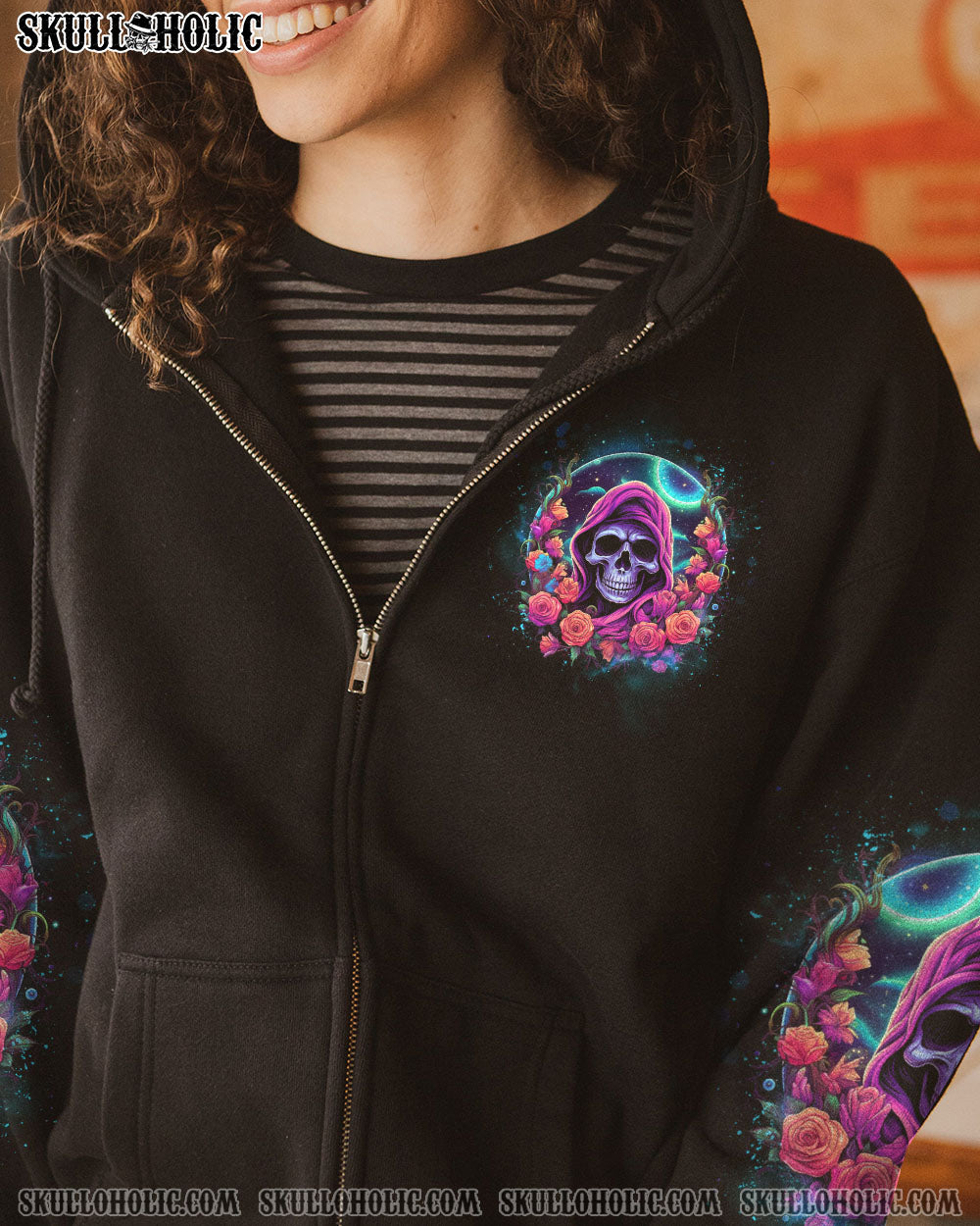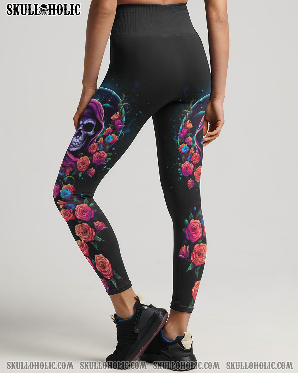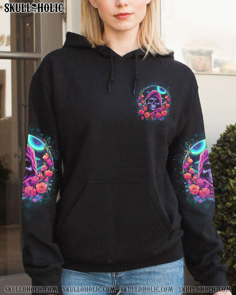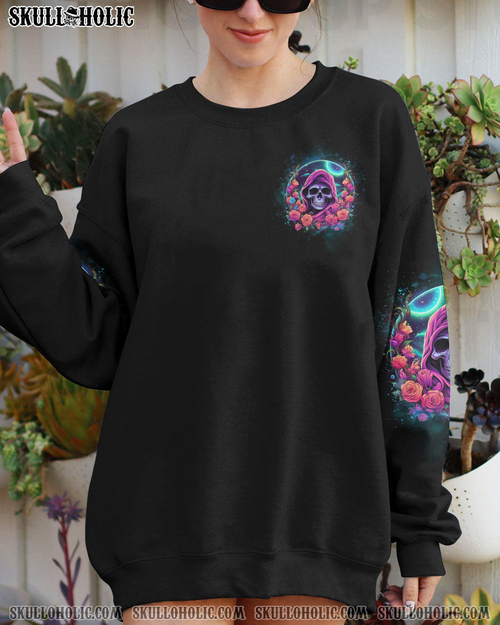 Showcase your inner strength and self-confidence with our shirt. Delight in this powerful design, featuring a reaper face adorned with delicate roses as a reminder to be true to yourself. With this design, inspire others to embrace their own unique identity and free themselves from the need for validation.Â