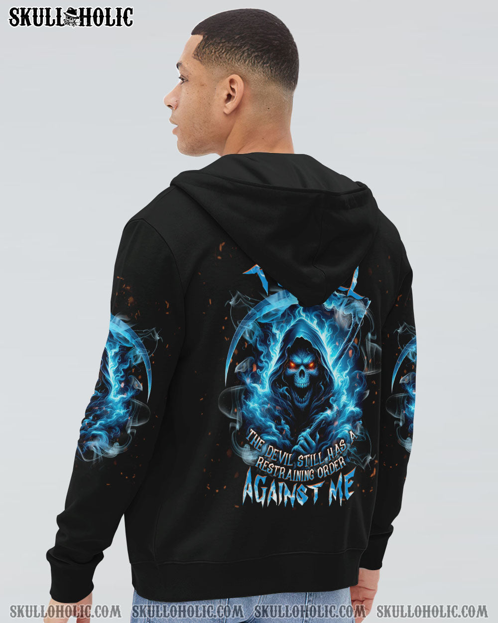 Embrace the haunting allure of our angry skull reaper design, wielding a scythe amidst ghostly smoke. The statement, “I can’t go to hell, the devil still has a restraining order against me,” injects humor into the macabre, suggesting resilience and defiance in the face of darkness.