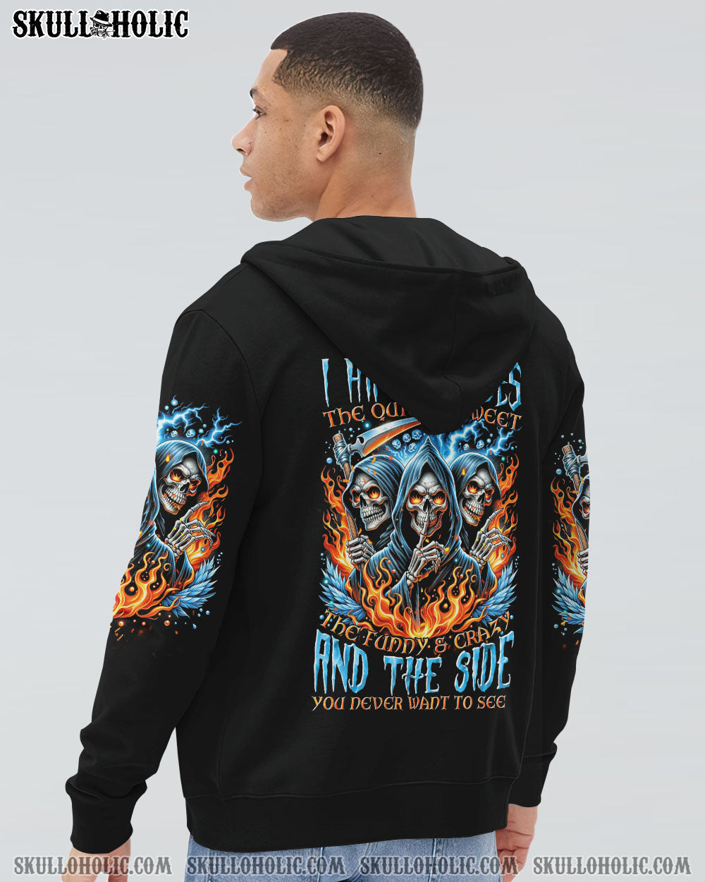 Explore a unique design capturing individuality—Skulls, intense flames, thunderstorms, and the quote, ‘I have three sides, the quiet side, the fun and crazy side, the side you never want to see.’ This artwork boldly delves into the complexity of human nature, making a statement about our diverse layers. Ideal for those who appreciate art delving into human complexity. Explore it now!