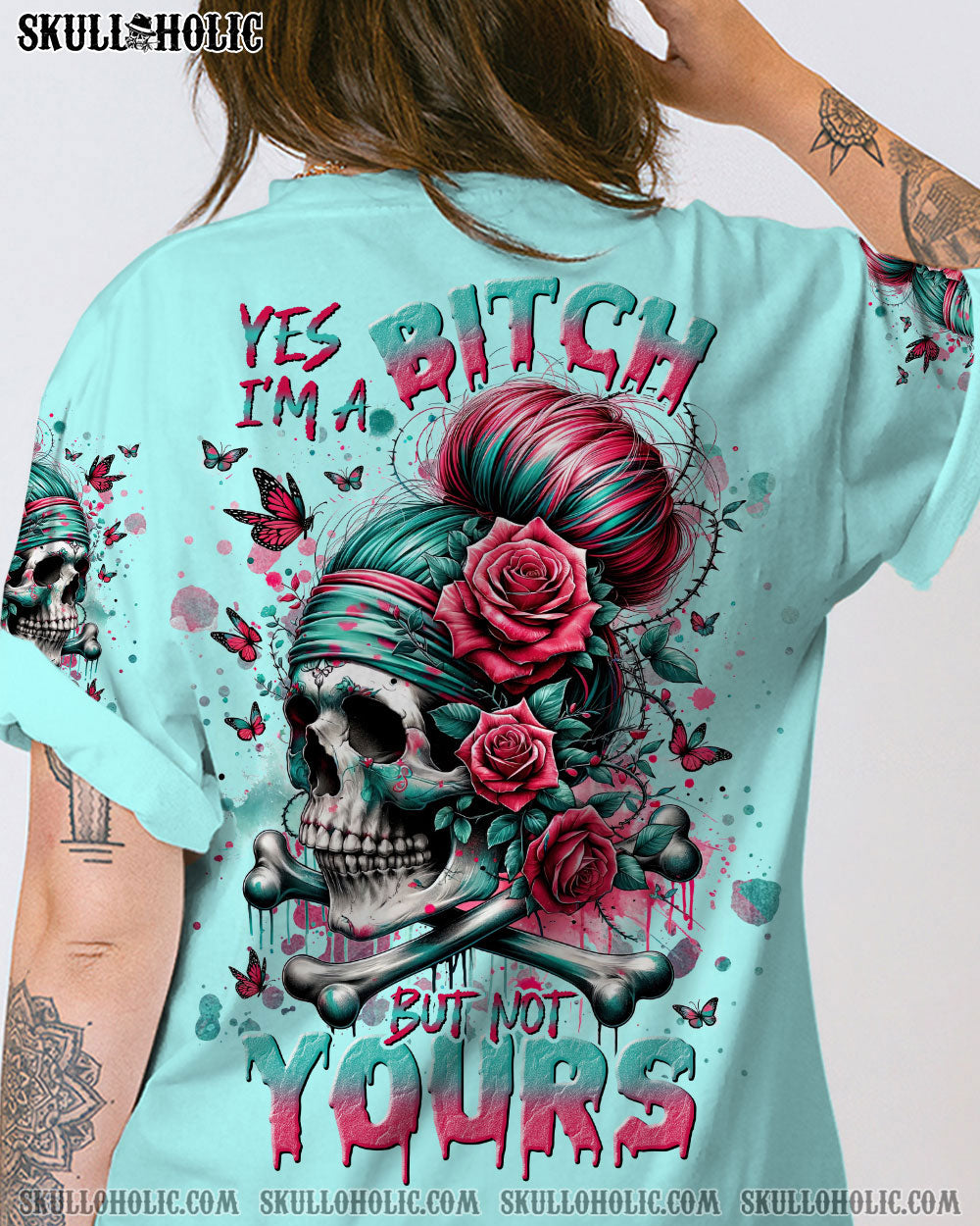For a unique fashion statement, express your individuality with this bold all-over print featuring a watercolor skull adorned with a stylish headband, surrounded by roses and butterflies. This captivating design brings together artistry and nature to create a stunning visual that is sure to stand out. Be creative and showcase your style with I TAKE CARE OF MY PROBLEM MESSY BUN ALL OVER PRINT