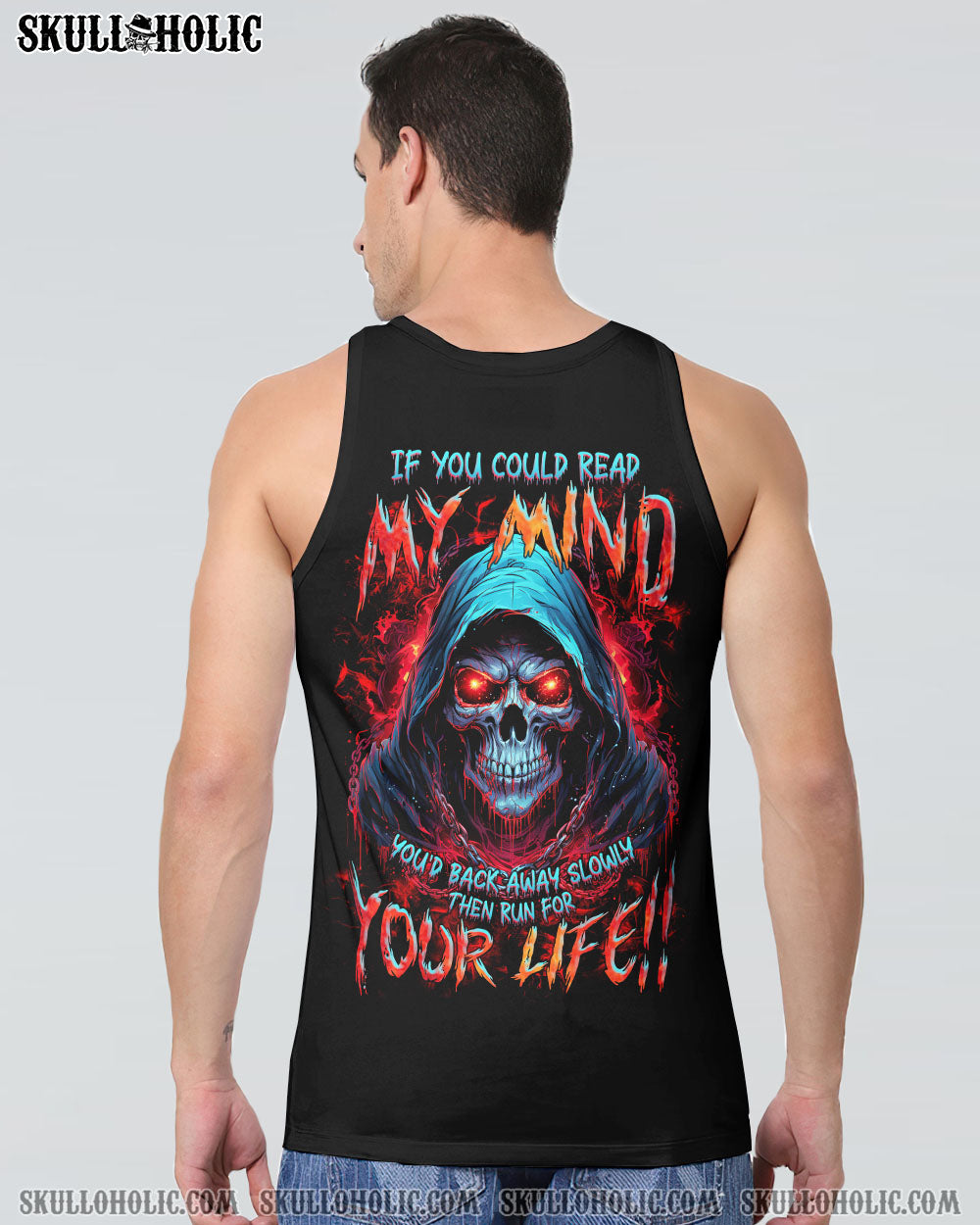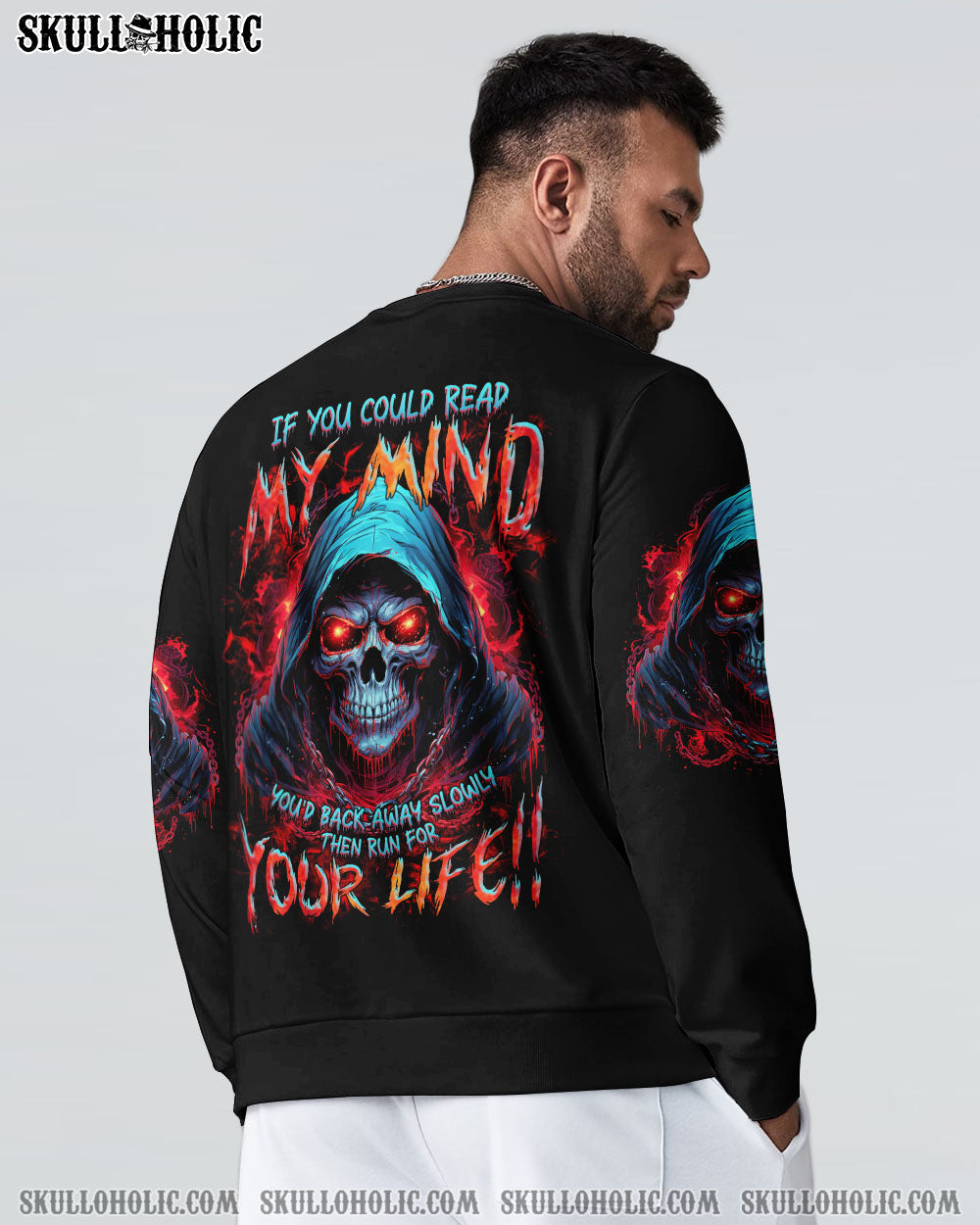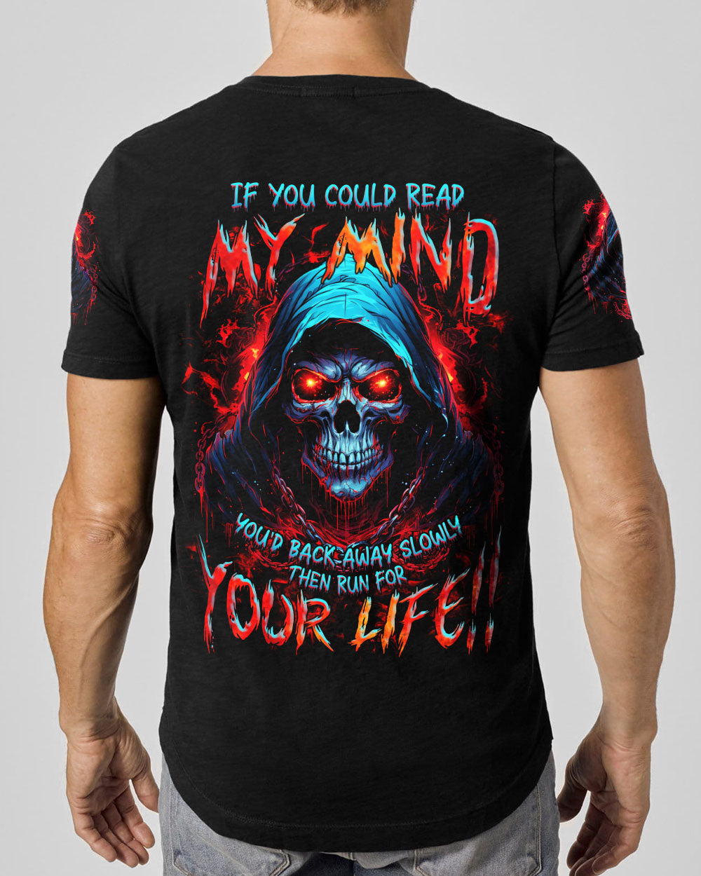 Unleash your inner strength with our IF YOU COULD READ MY MIND REAPER ALL OVER PRINT. A powerful skull reaper design exudes a commanding aura, while the warning “If you can read my mind, you’d back away slowly then run for your life” serves as a reminder of the fierce thoughts and emotions that lie within. Approach with caution and respect.