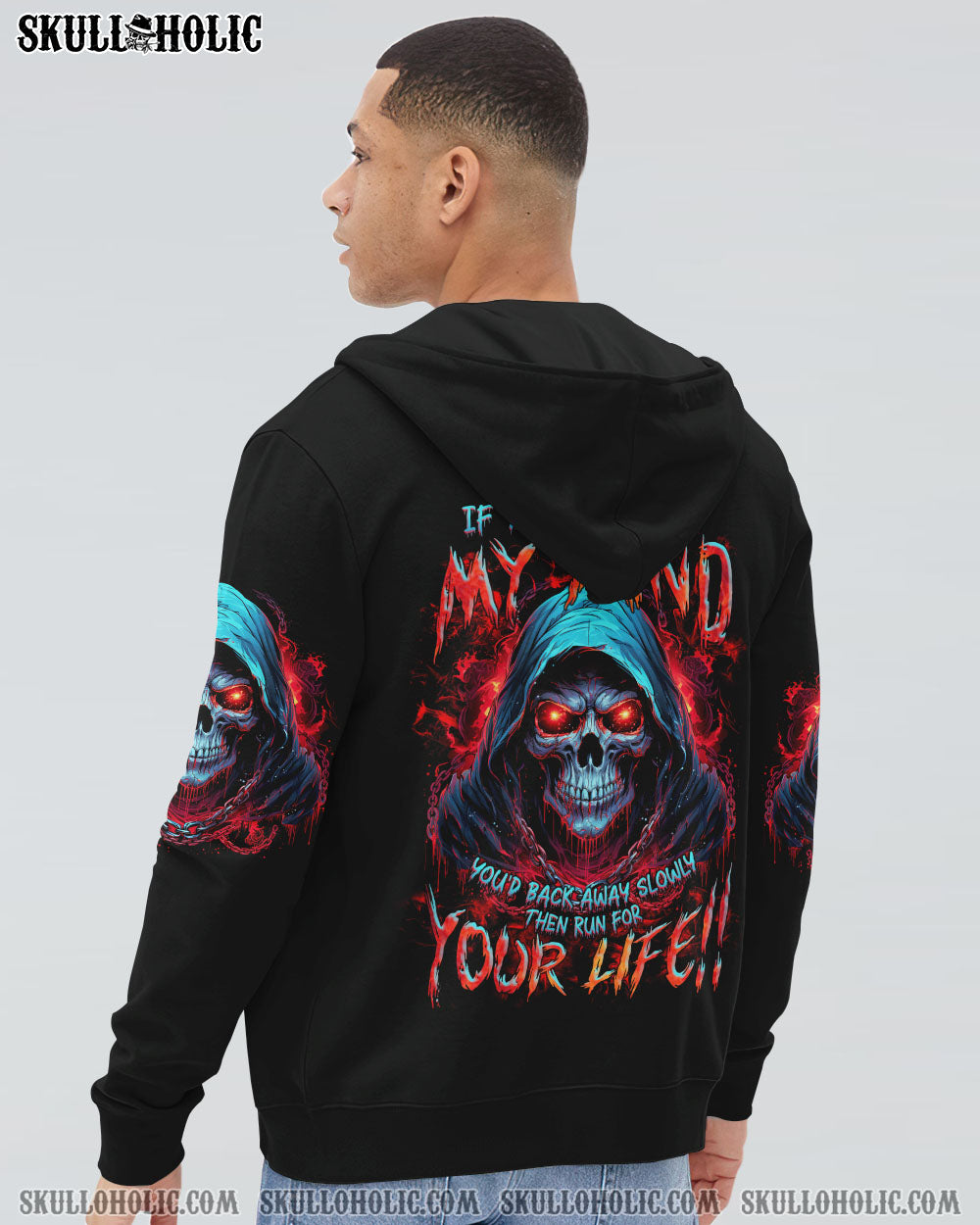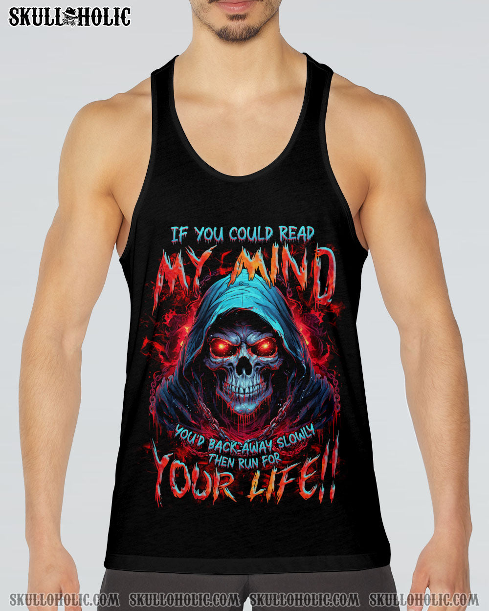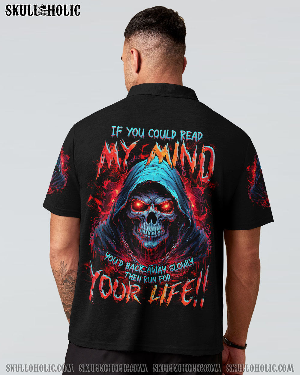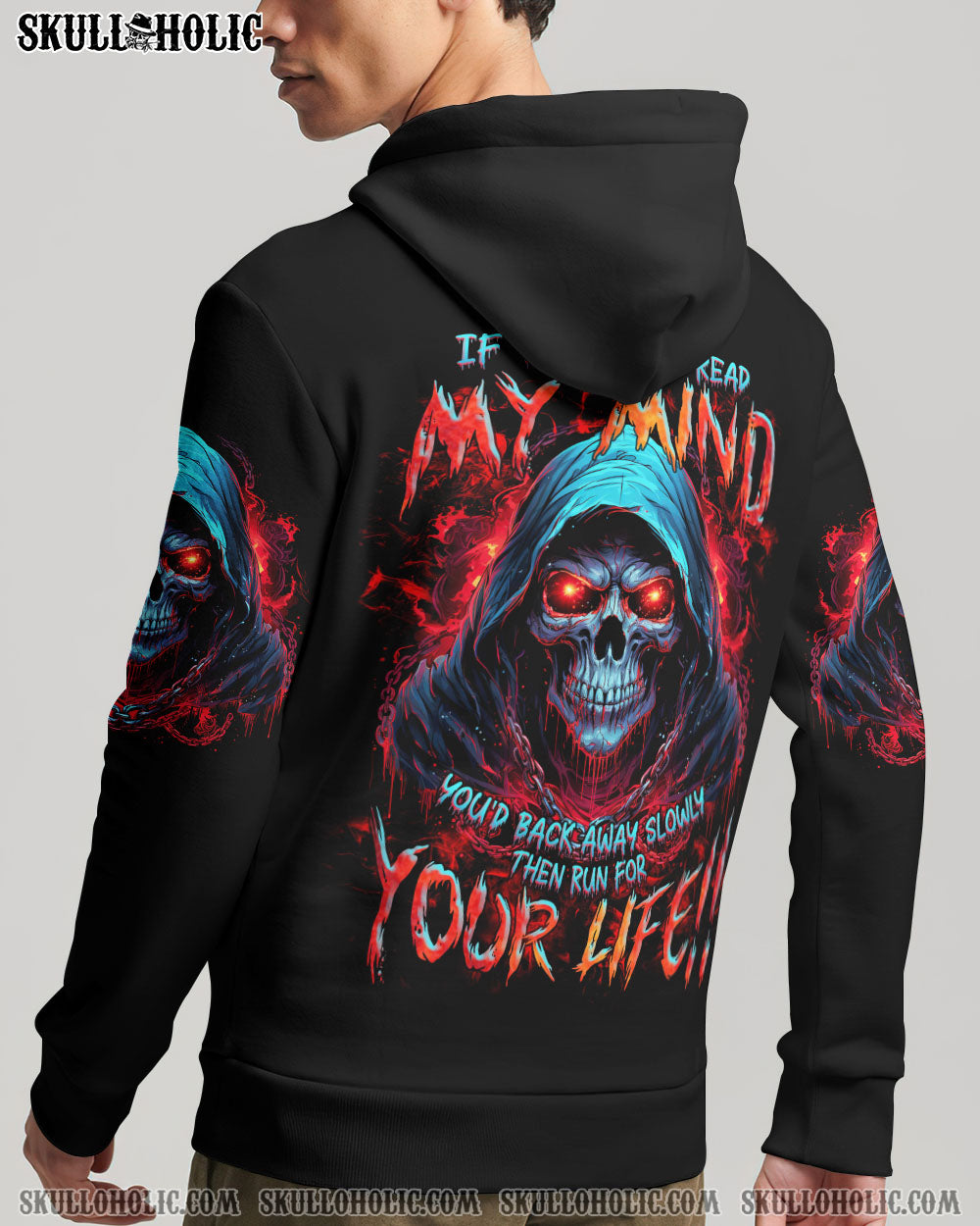 Unleash your inner strength with our IF YOU COULD READ MY MIND REAPER ALL OVER PRINT. A powerful skull reaper design exudes a commanding aura, while the warning “If you can read my mind, you’d back away slowly then run for your life” serves as a reminder of the fierce thoughts and emotions that lie within. Approach with caution and respect.