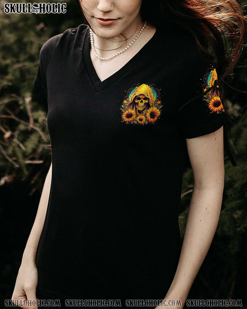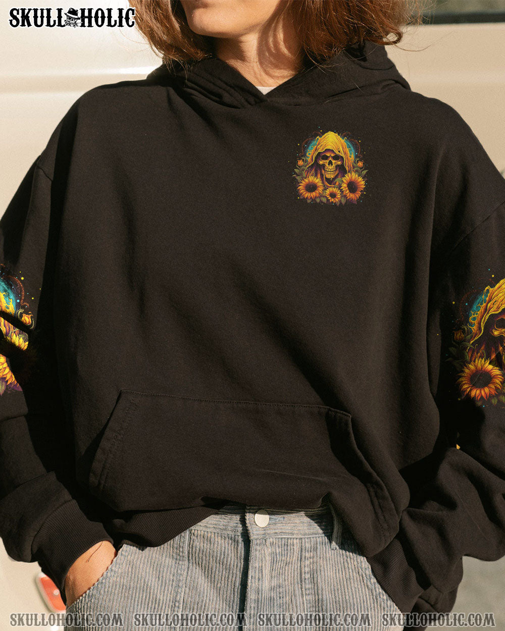 Our IF YOU THINK I’M CRAZY NOW sunflower reaper all-over print is an exclusive design that celebrates resilience and self-assurance. Featuring a bold skull reaper and vibrant sunflowers, the design conveys a powerful message that you can navigate life with a determined mindset. Showcase your strength and courage with this captivating design.