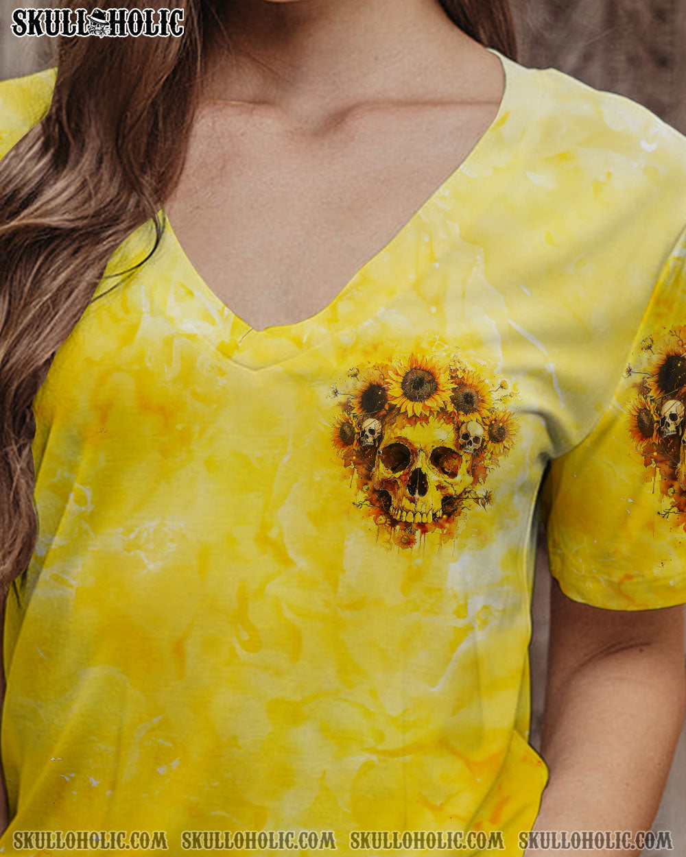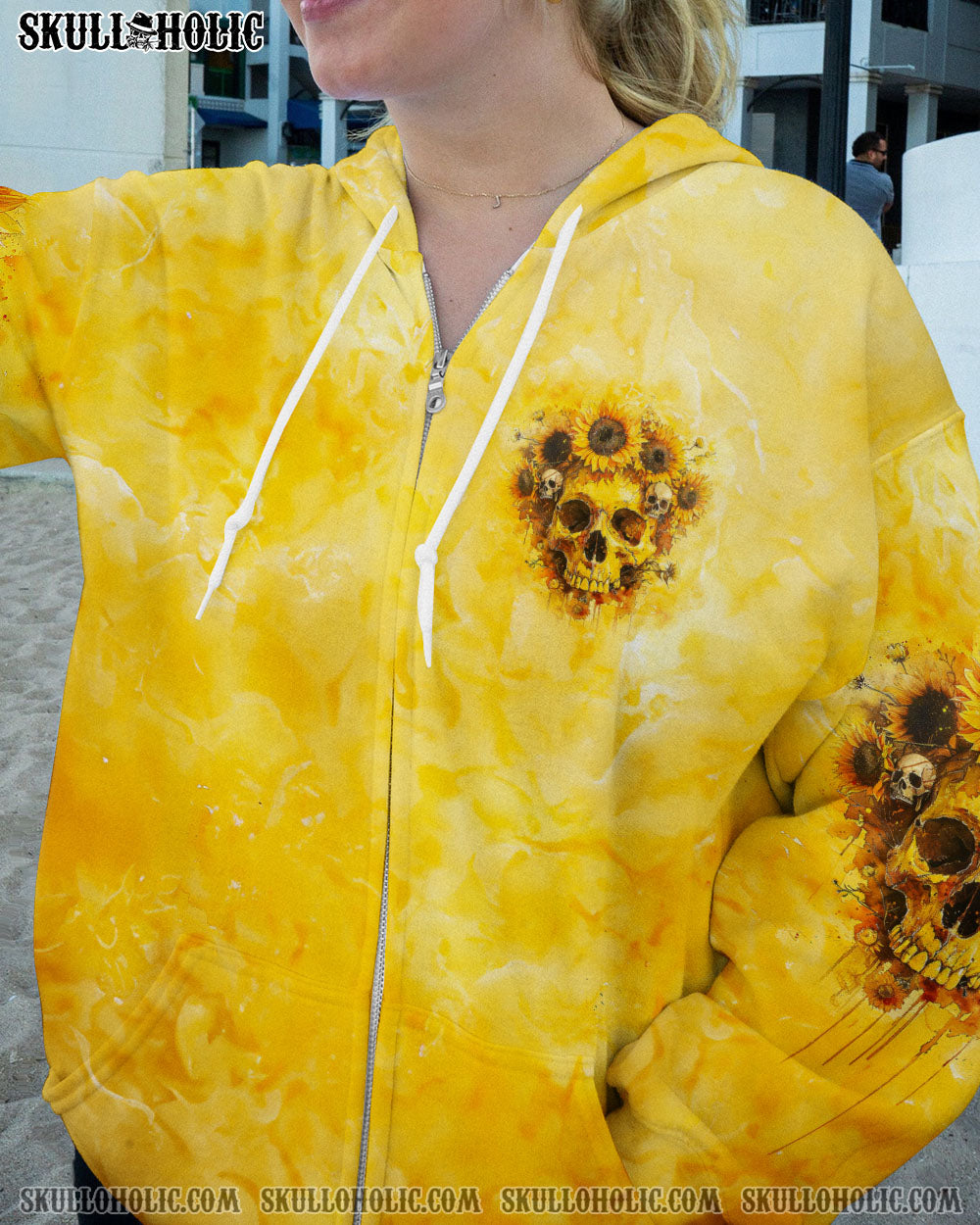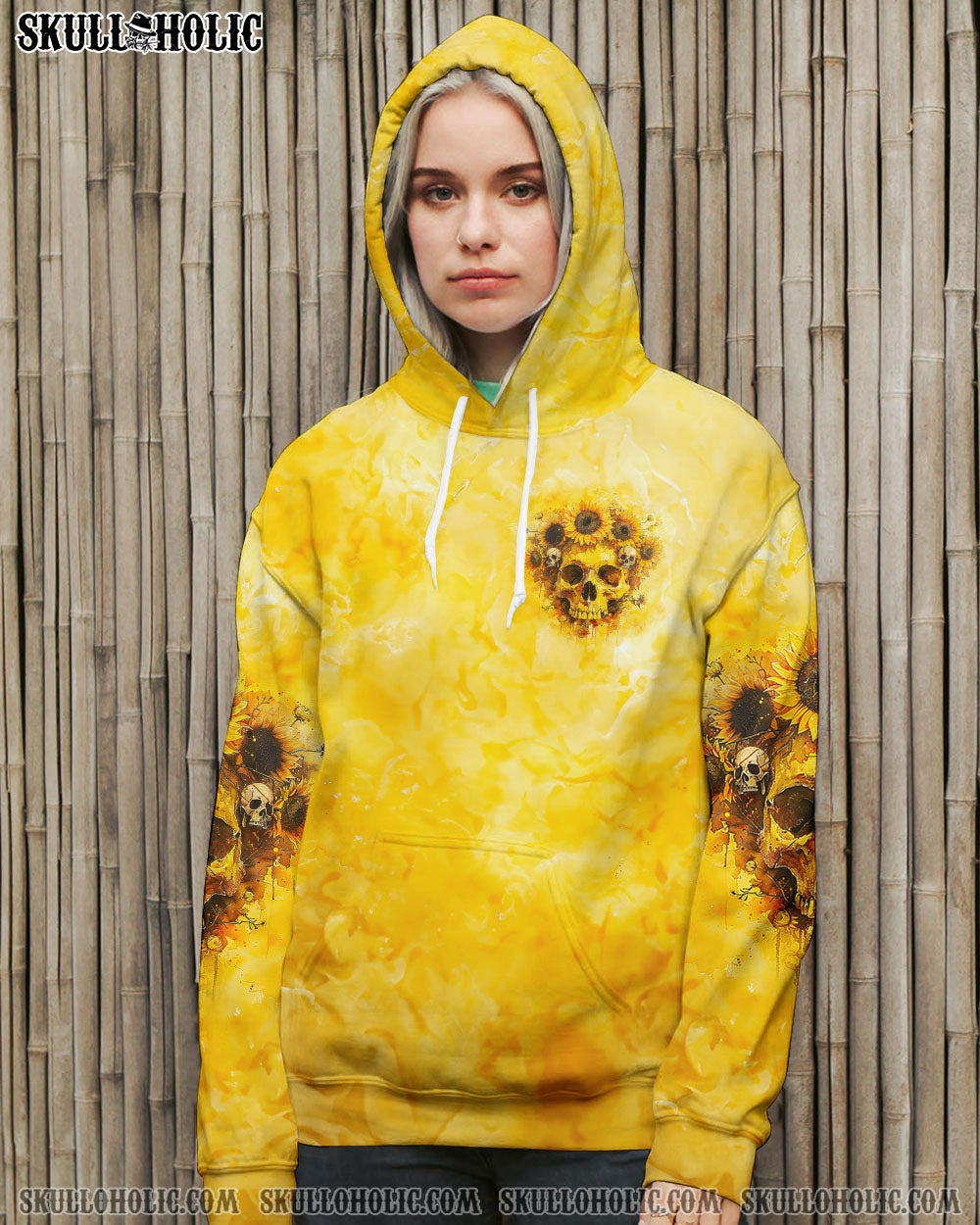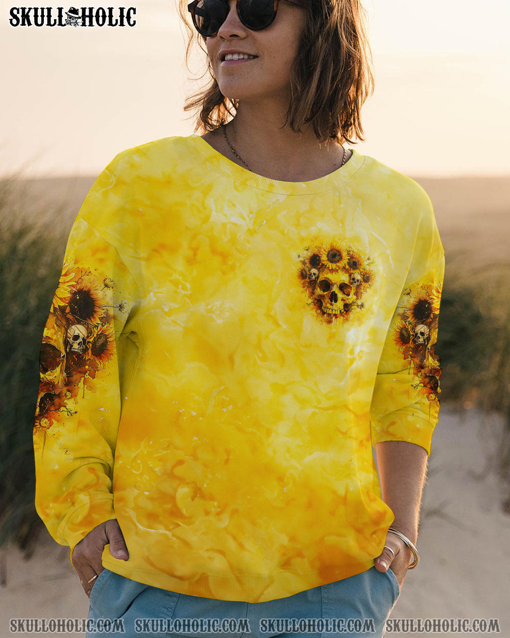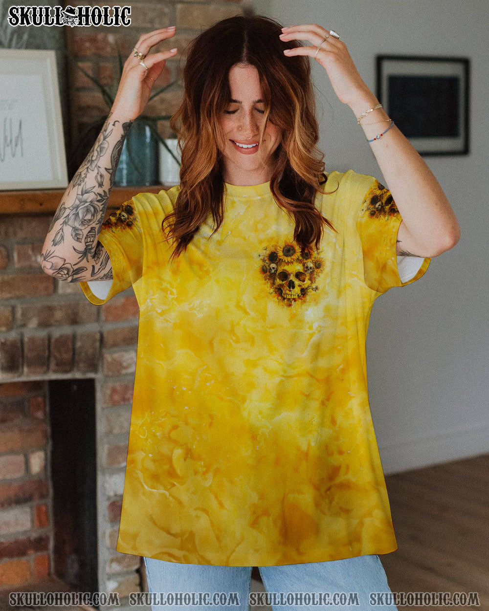 Unleash your fearless spirit with our captivating all-over skull and sunflower print. Embodying resilience and individuality, this design features an empowering quote and bold elements. Stand out from the ordinary and embrace the unique energy of this striking narrative. Let your style be a testament to your strength.