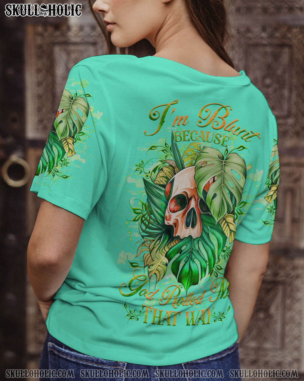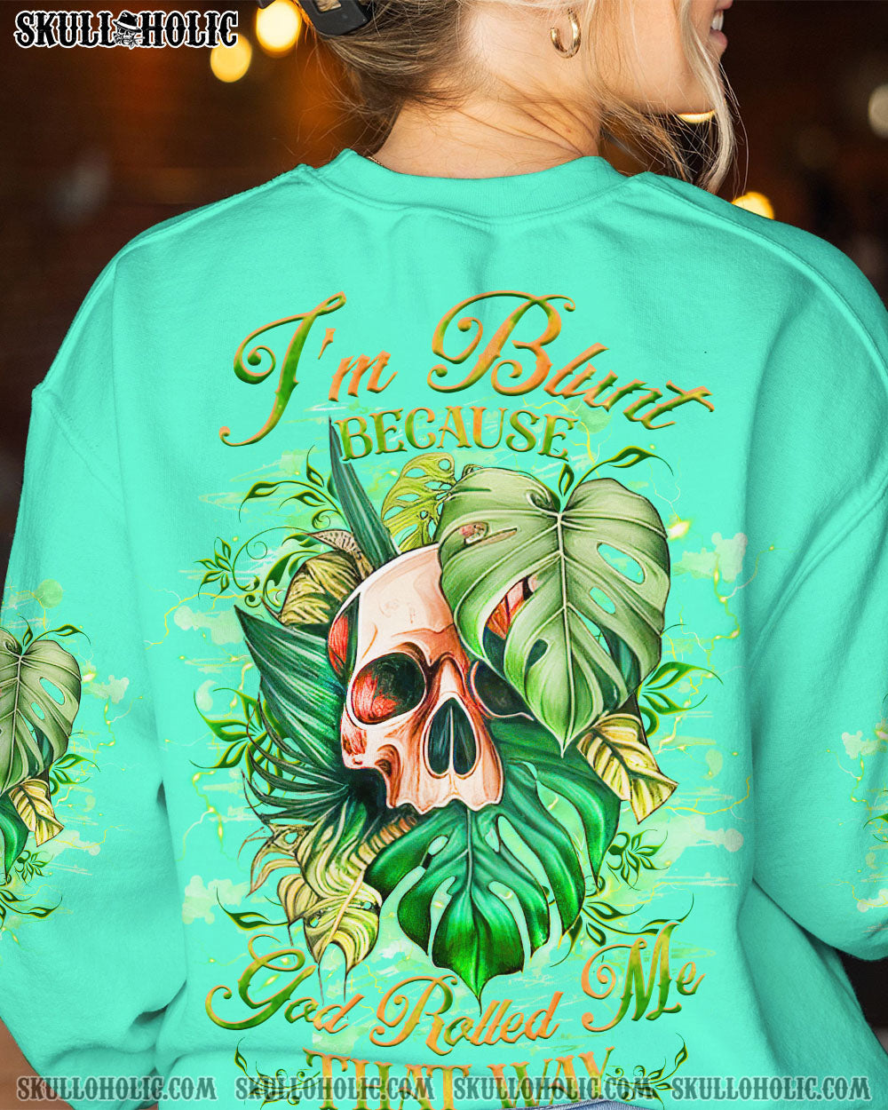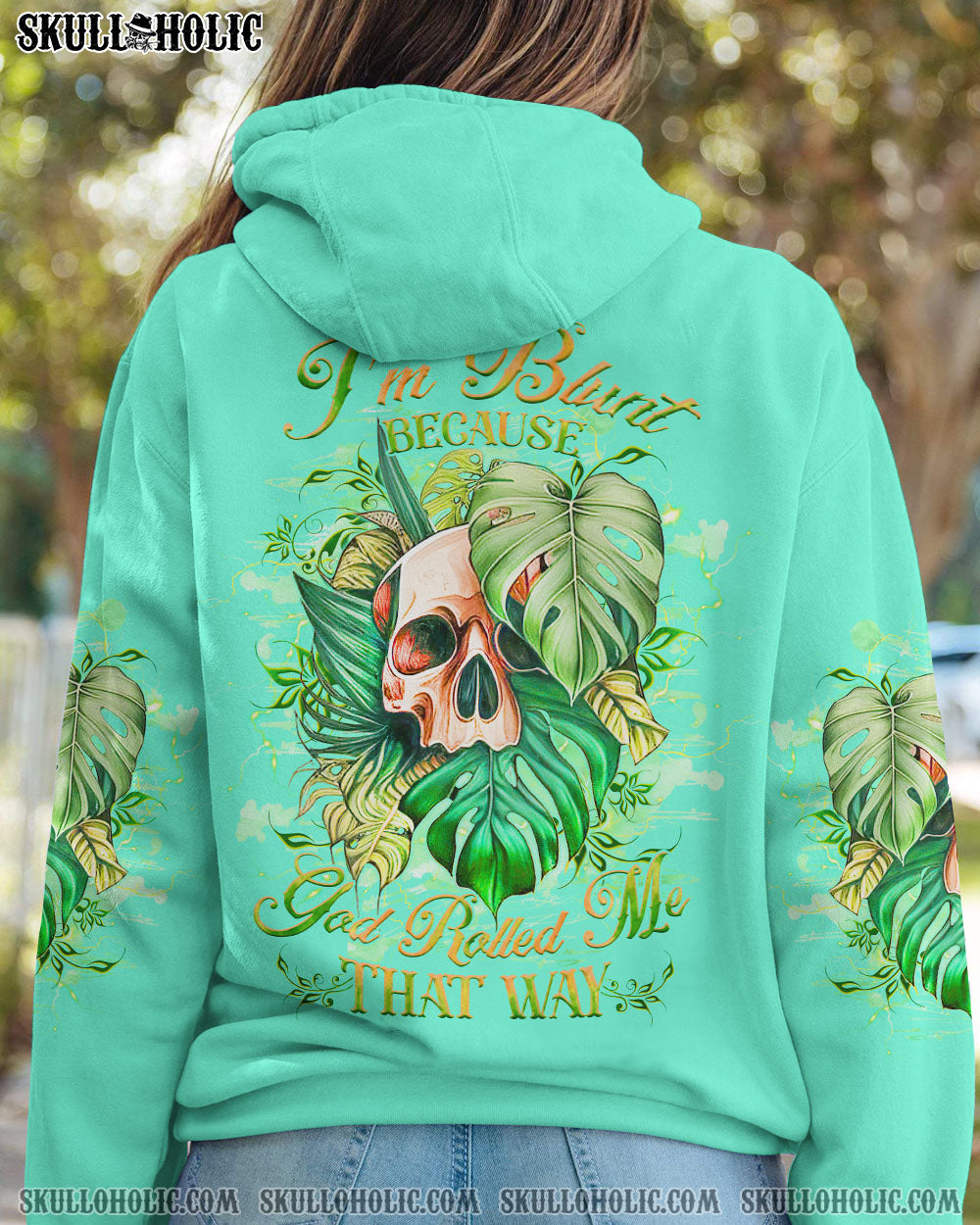 Express your one-of-a-kind humor with our attention-grabbing skull design! Highlighting a watercolor skull cleverly nestled amidst vibrant green leaves, it’s a delightful fusion of nature and wit. The quote, “I’m blunt because god rolled me that way,” infuses a playful charm into this design, encouraging you to embrace your candid and unapologetic self. Wear it proudly as a symbol of your bold personality and humor. Secure yours today and confidently showcase your unique style!