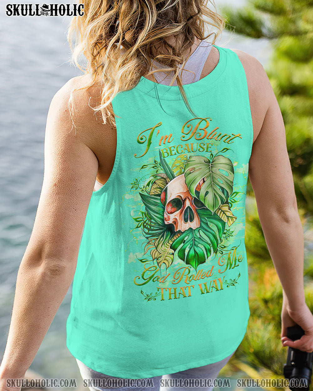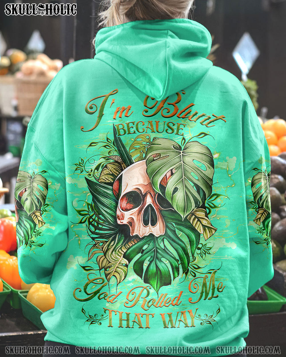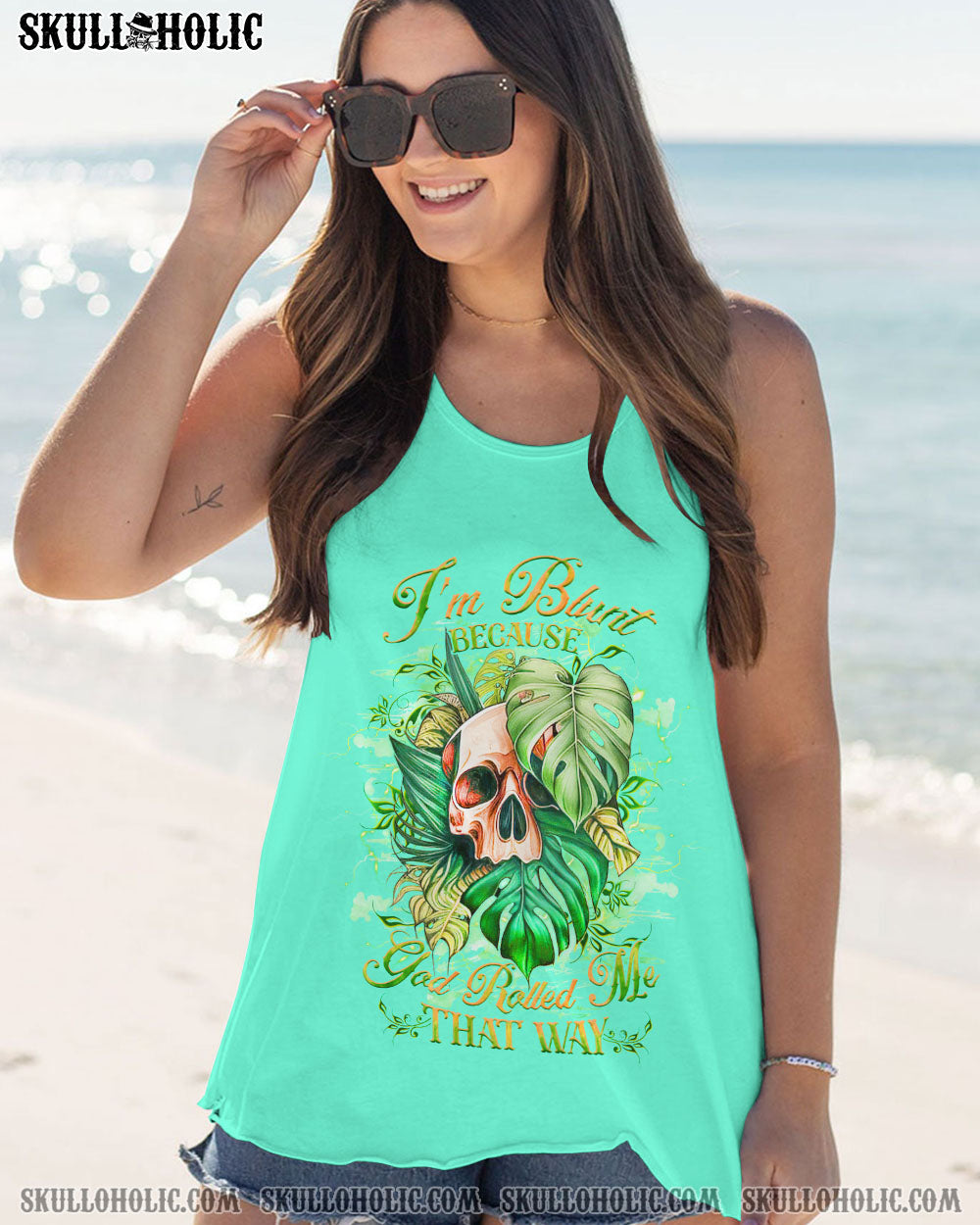 Express your one-of-a-kind humor with our attention-grabbing skull design! Highlighting a watercolor skull cleverly nestled amidst vibrant green leaves, it’s a delightful fusion of nature and wit. The quote, “I’m blunt because god rolled me that way,” infuses a playful charm into this design, encouraging you to embrace your candid and unapologetic self. Wear it proudly as a symbol of your bold personality and humor. Secure yours today and confidently showcase your unique style!
