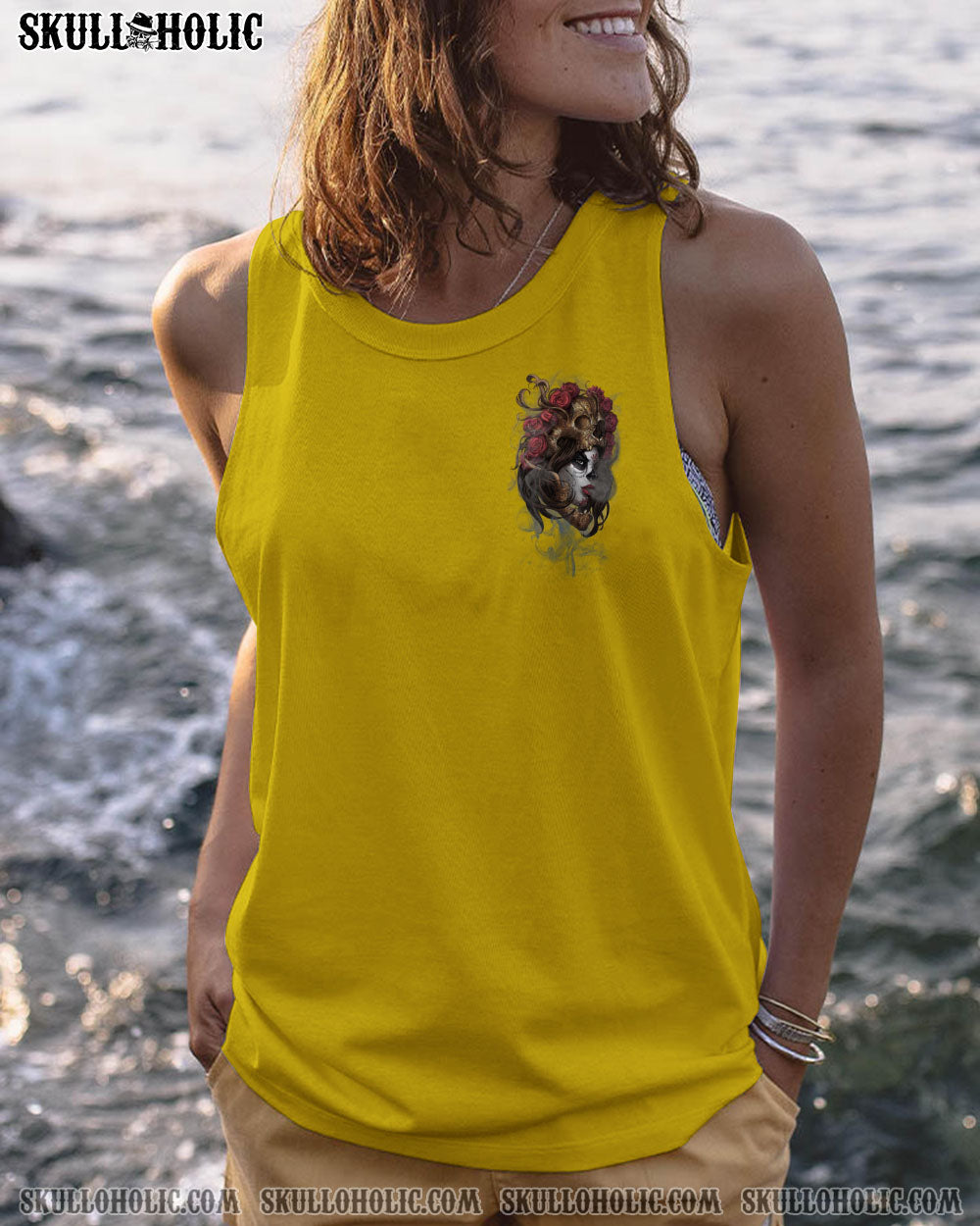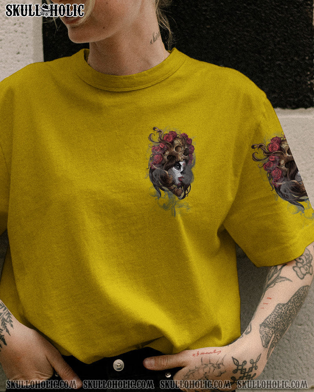 Unleash your inner rebel with our striking sugar skull girl design, crafted especially for fierce and determined mothers with a passion for tattoos. Our design showcases a vibrant yellow backdrop and daring red roses, making a bold and unforgettable statement.