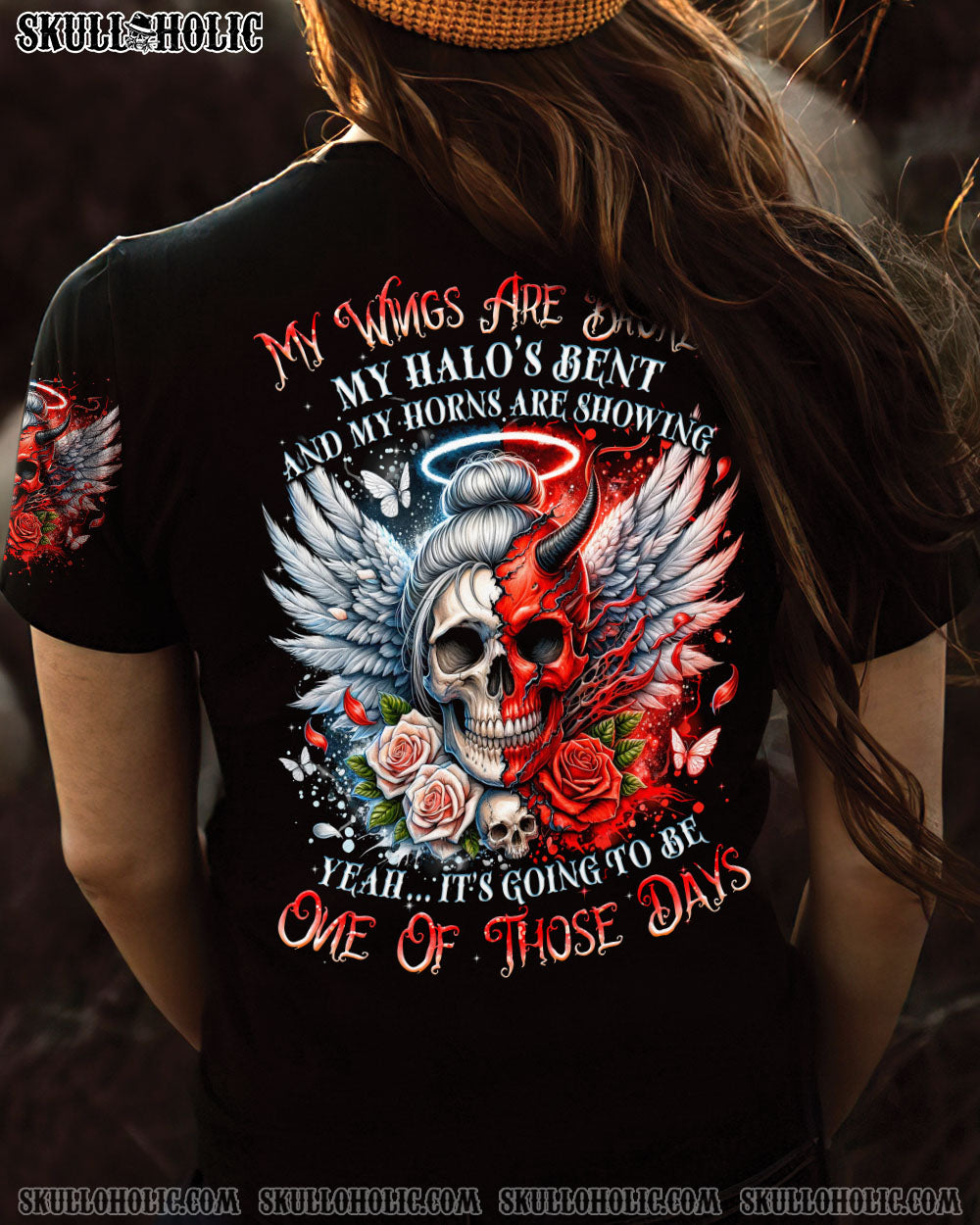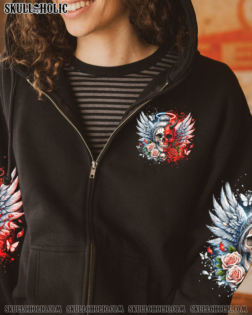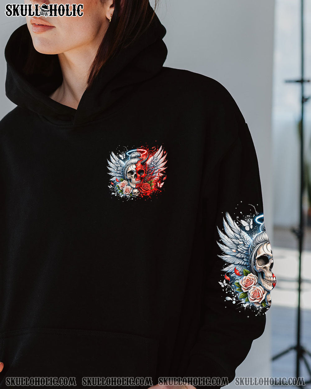 Embrace your complex identity with our striking design featuring a half-angel, half-demon skull. This fusion symbolizes the duality within us all – the struggle between light and darkness, good and evil. The broken wings and bent halo represent our imperfections, while the revealing horns signify our raw, unfiltered selves. Wear this design as a reminder to embrace all aspects of your personality, even on “one of those days.” Let your true colors shine. 💀🔥💀