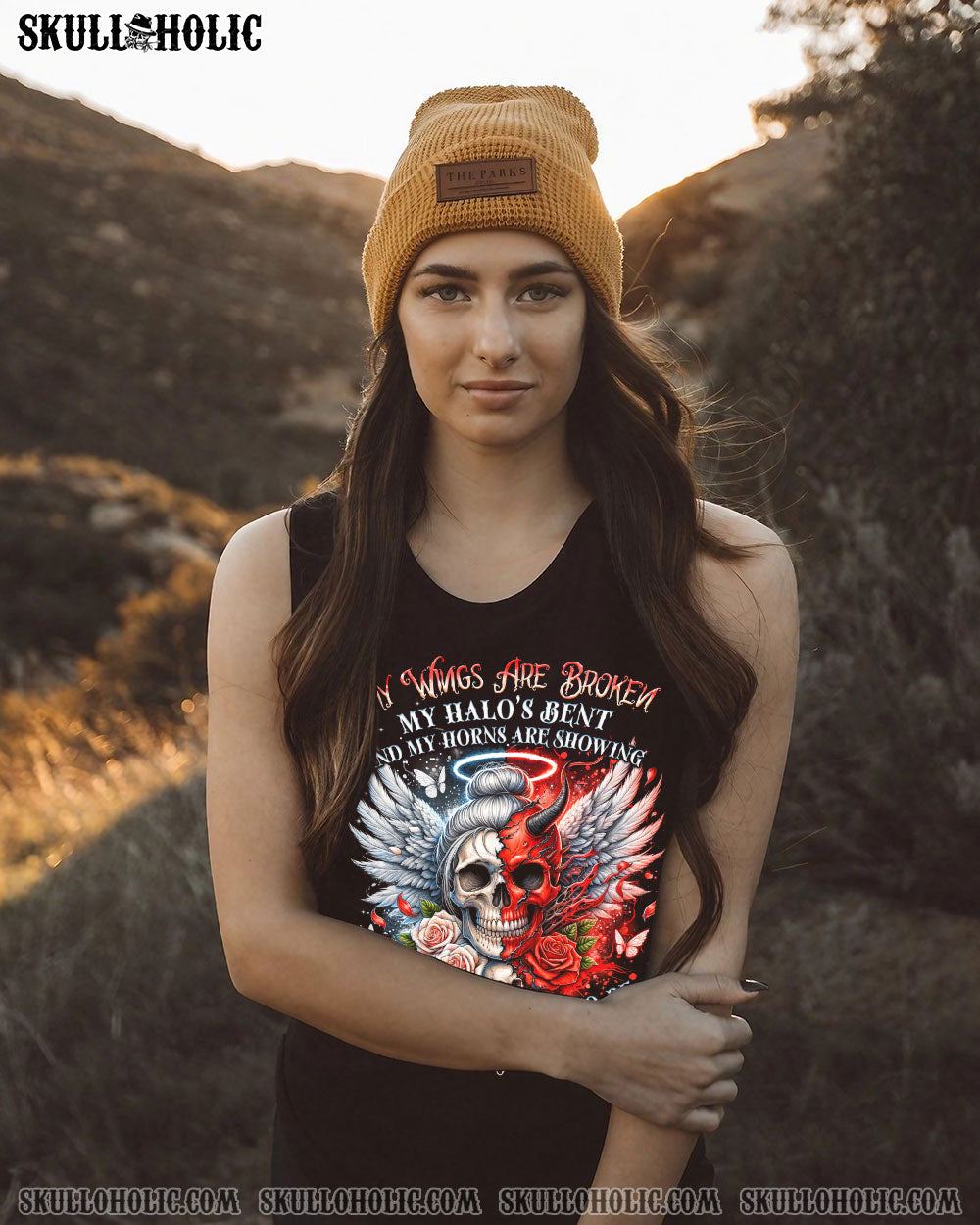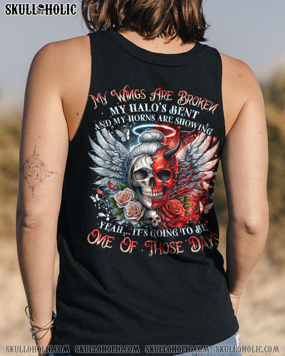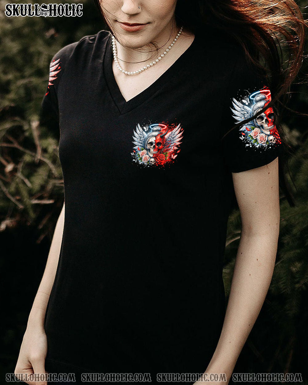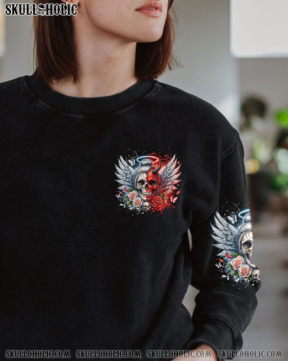 Embrace your complex identity with our striking design featuring a half-angel, half-demon skull. This fusion symbolizes the duality within us all – the struggle between light and darkness, good and evil. The broken wings and bent halo represent our imperfections, while the revealing horns signify our raw, unfiltered selves. Wear this design as a reminder to embrace all aspects of your personality, even on “one of those days.” Let your true colors shine. 💀🔥💀