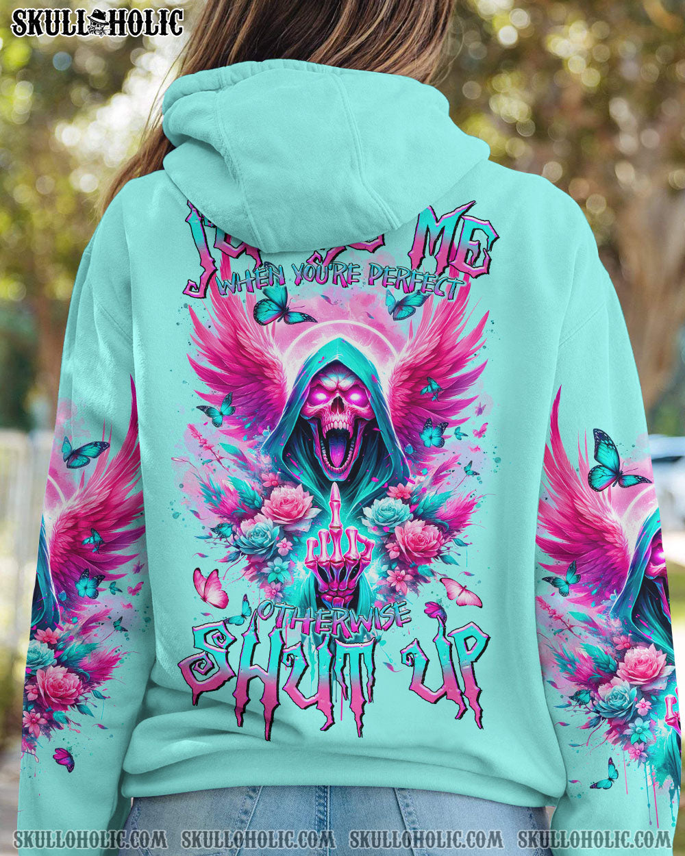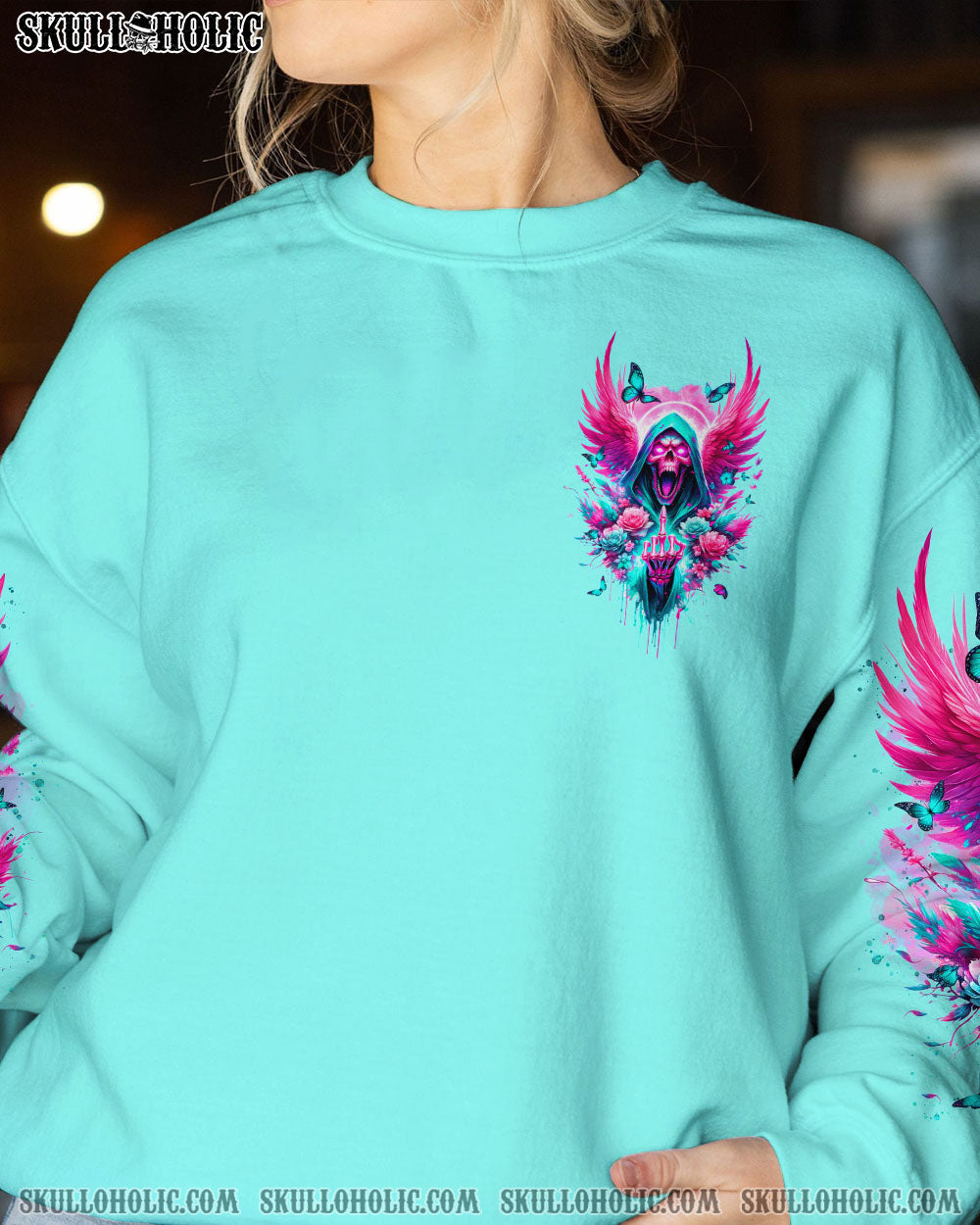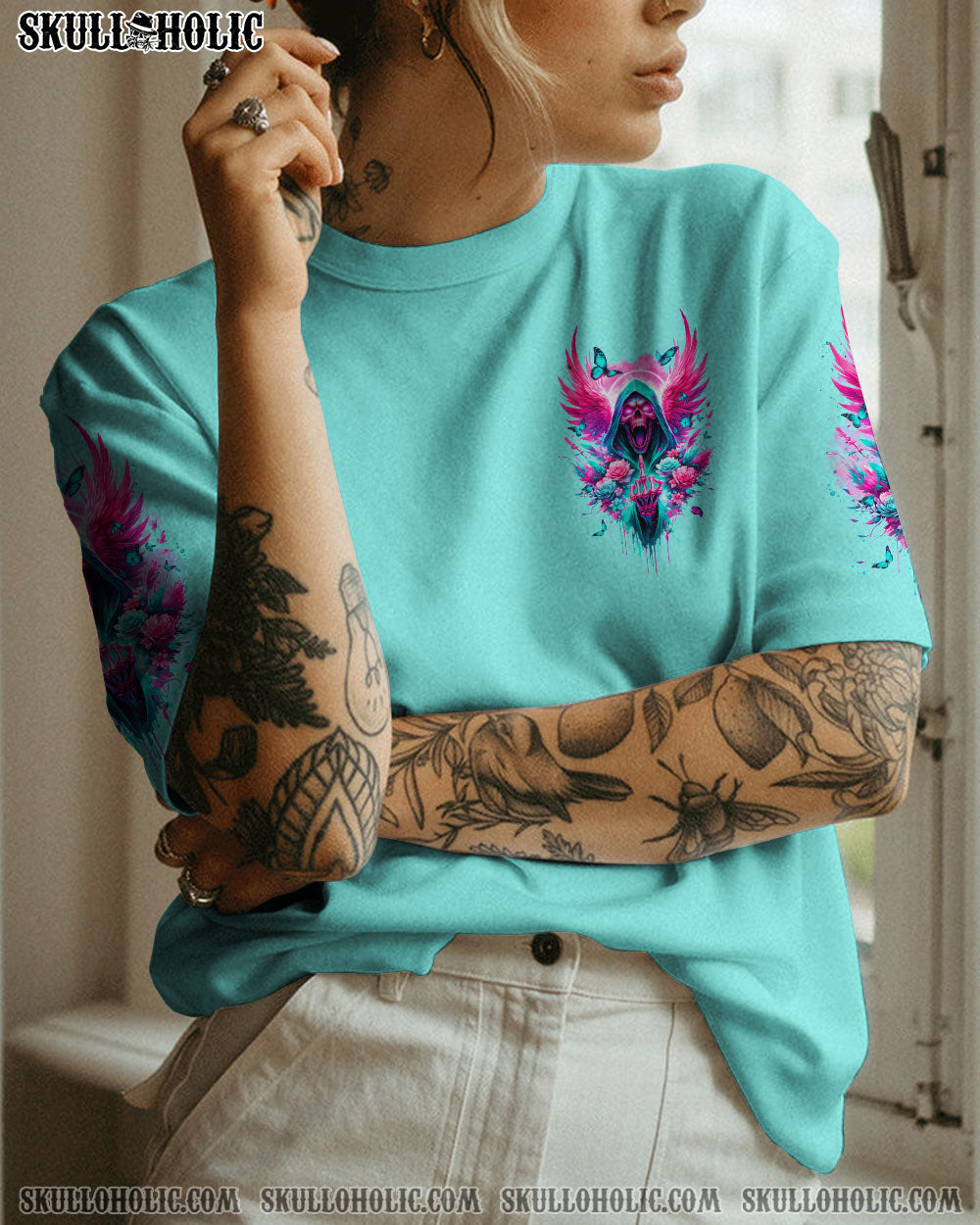 Introducing the JUDGE ME WHEN REAPER WINGS ALL OVER PRINT. Our formidable design features a skull reaper with powerful ghostly wings, surrounded by striking flowers and leaves. Its accompanying message encapsulates the spirit of resilience, conveying strength to overcome challenges and thrive in the face of adversity.