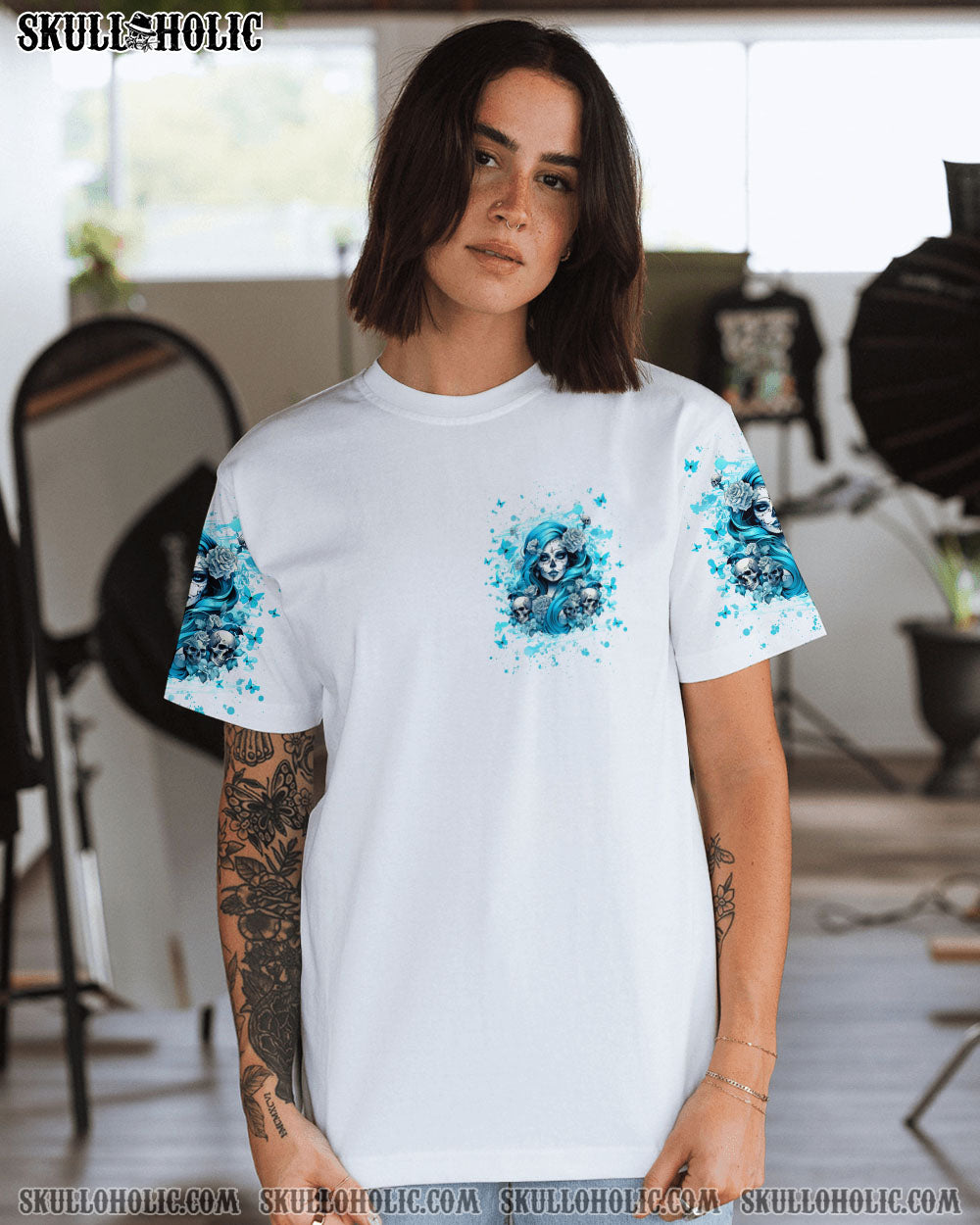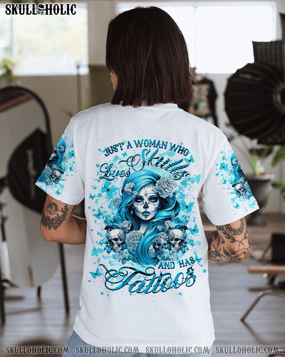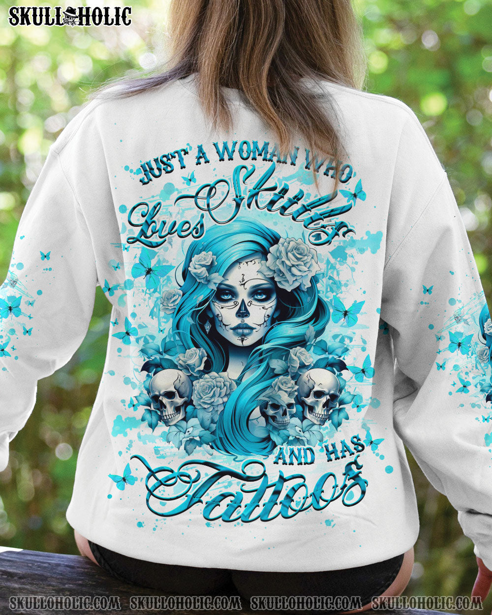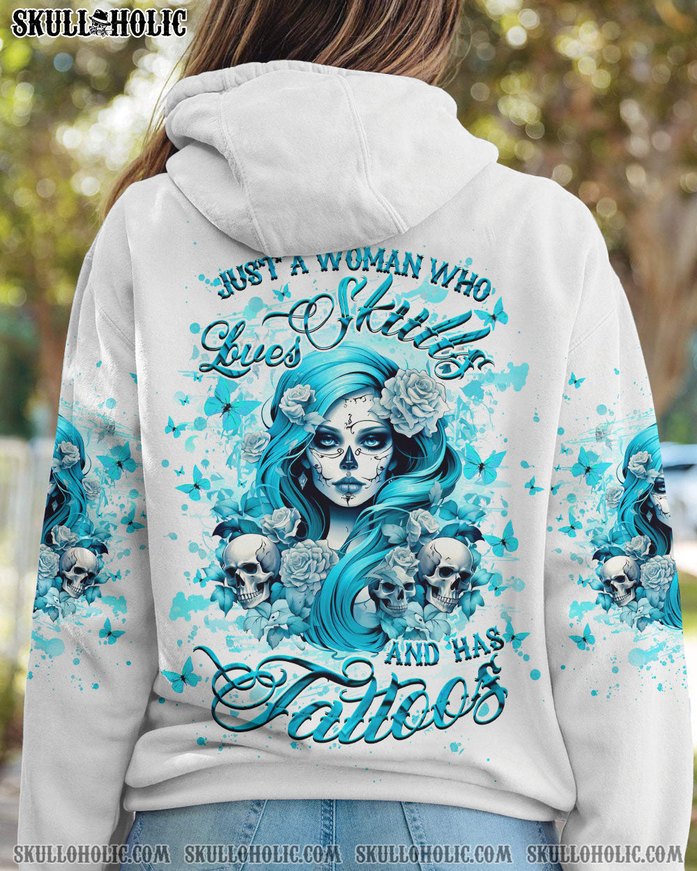 JUST A WOMAN WHO LOVES SKULL AND HAS TATTOOS ALL OVER PRINT – YHHG2507242