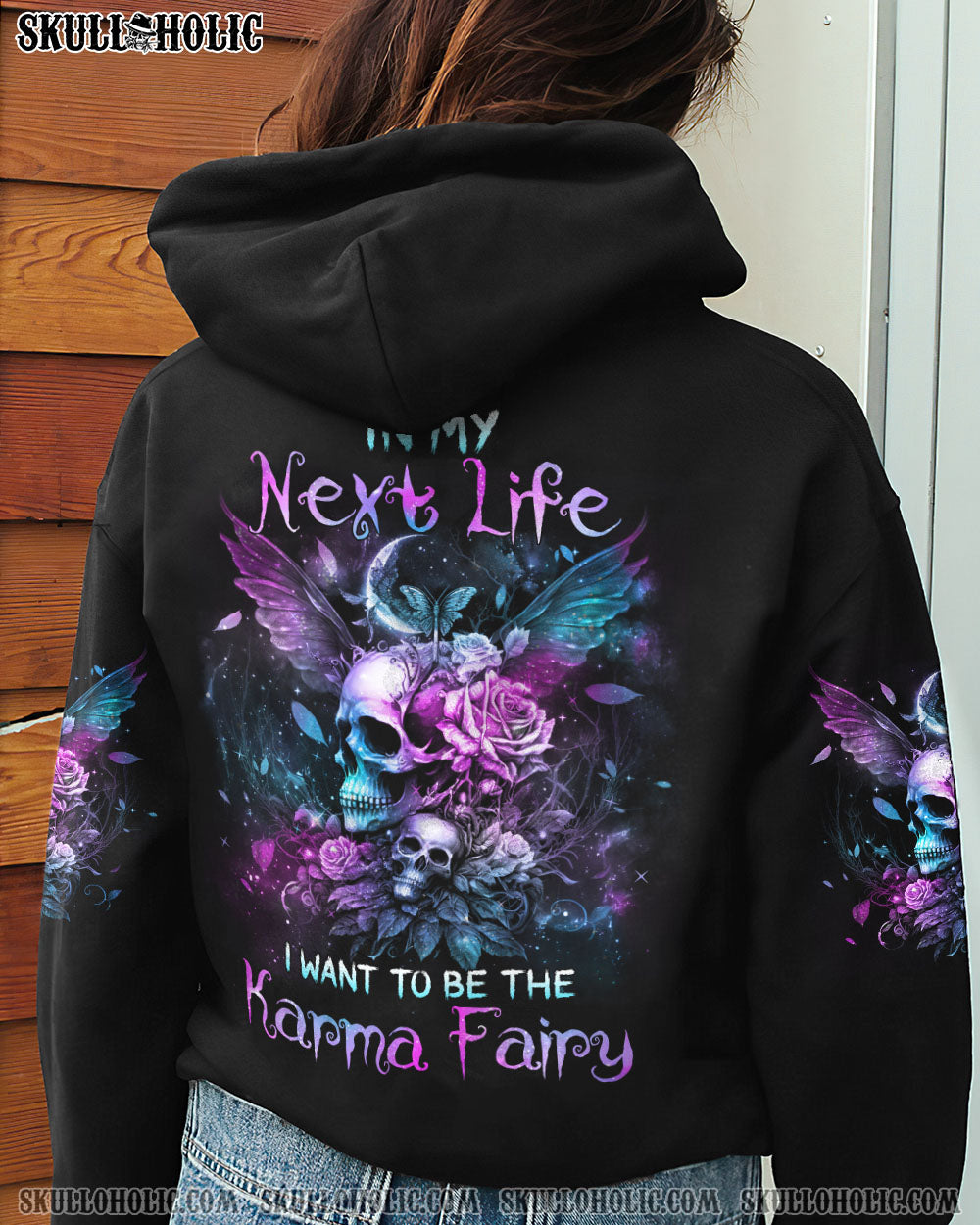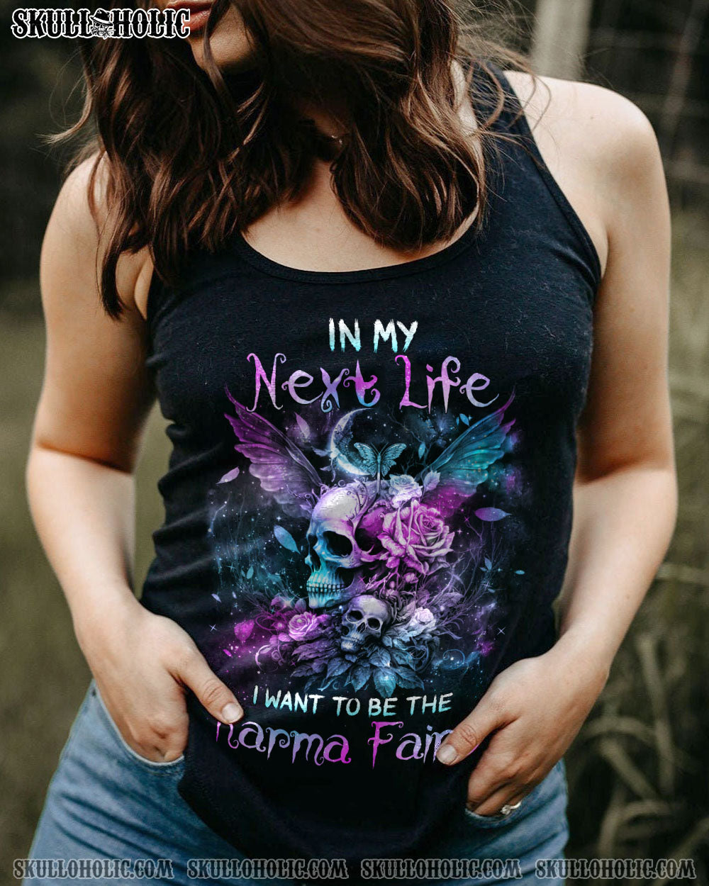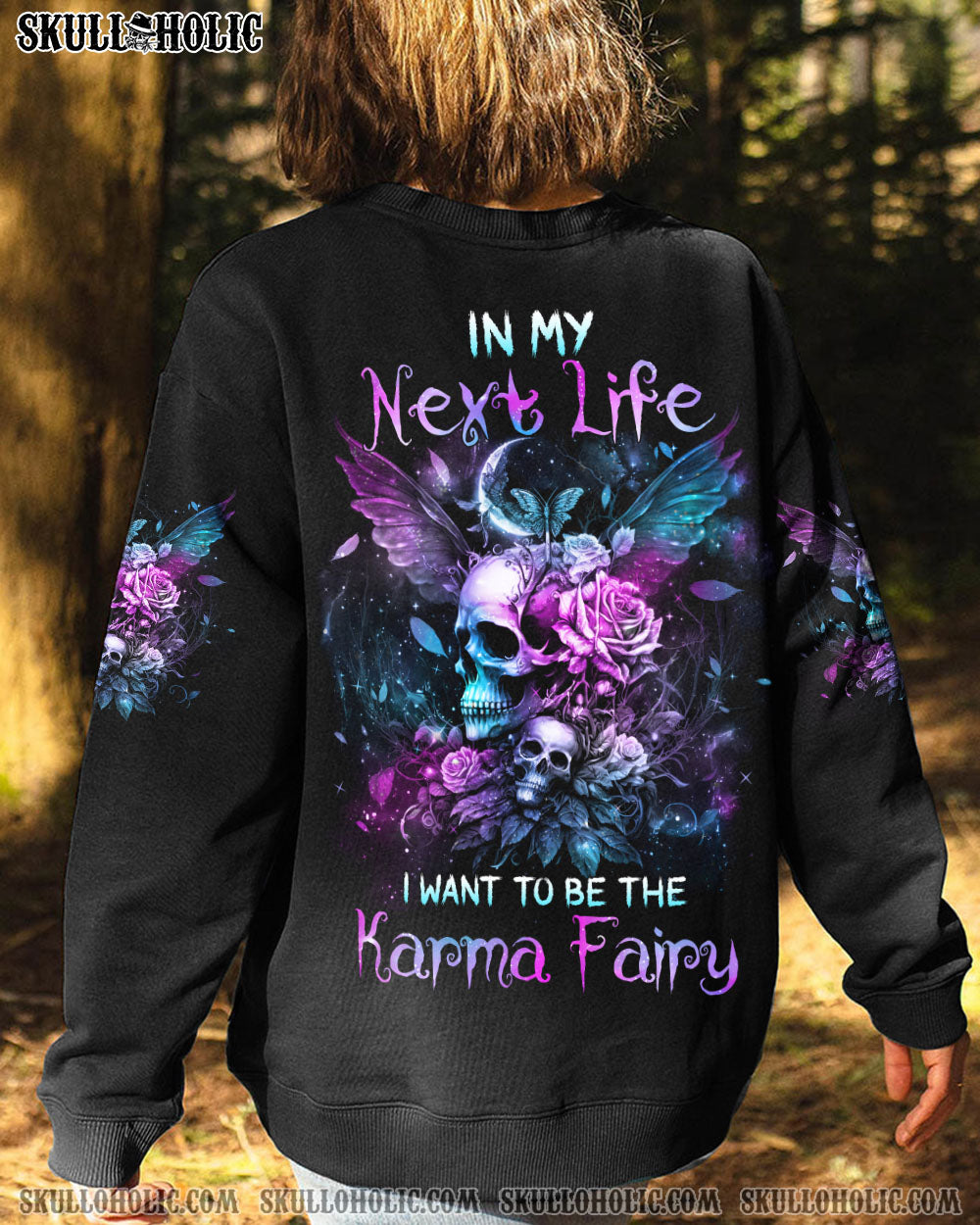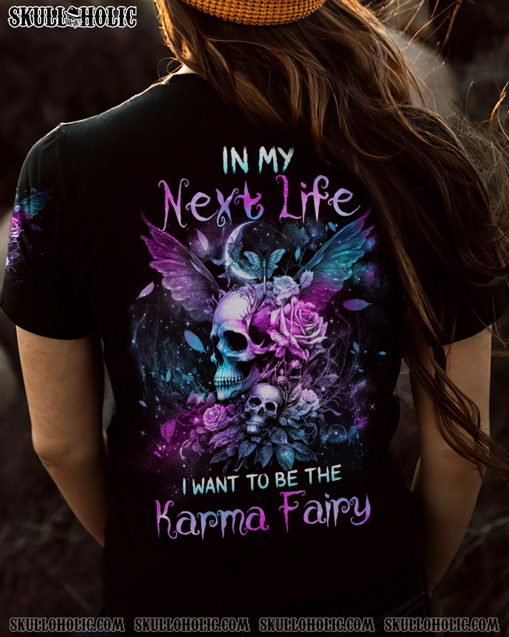 Add a touch of enchantment to your wardrobe with this sparkling teal and purple design that captures the magic of the galaxy. The inspiring quote “In my next life, I want to be the karma fairy” boldly proclaims your commitment to justice and fairness.