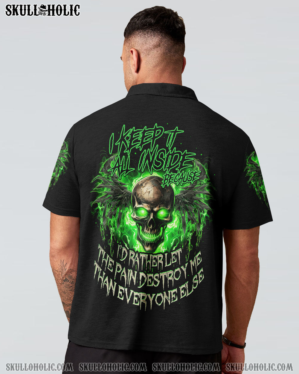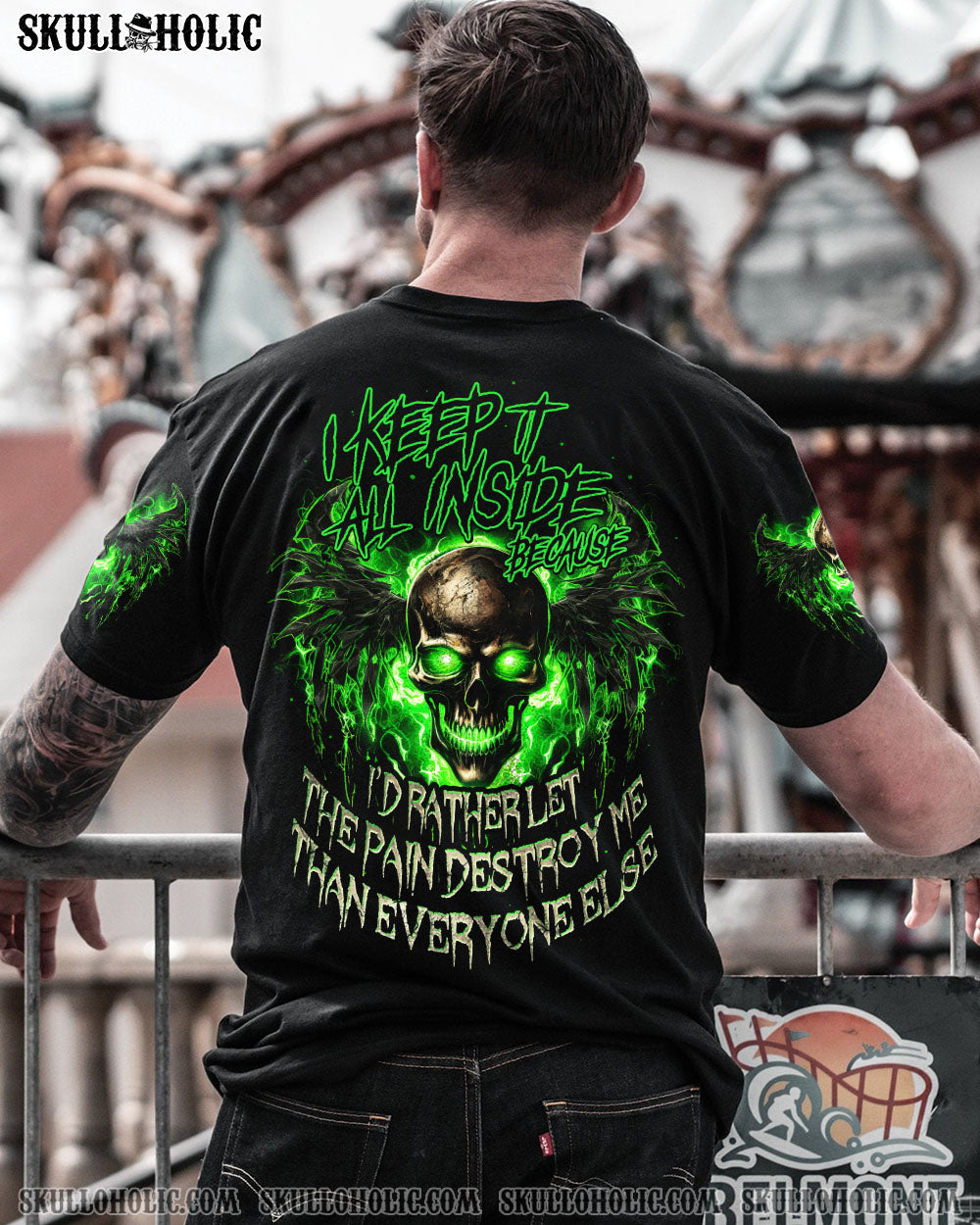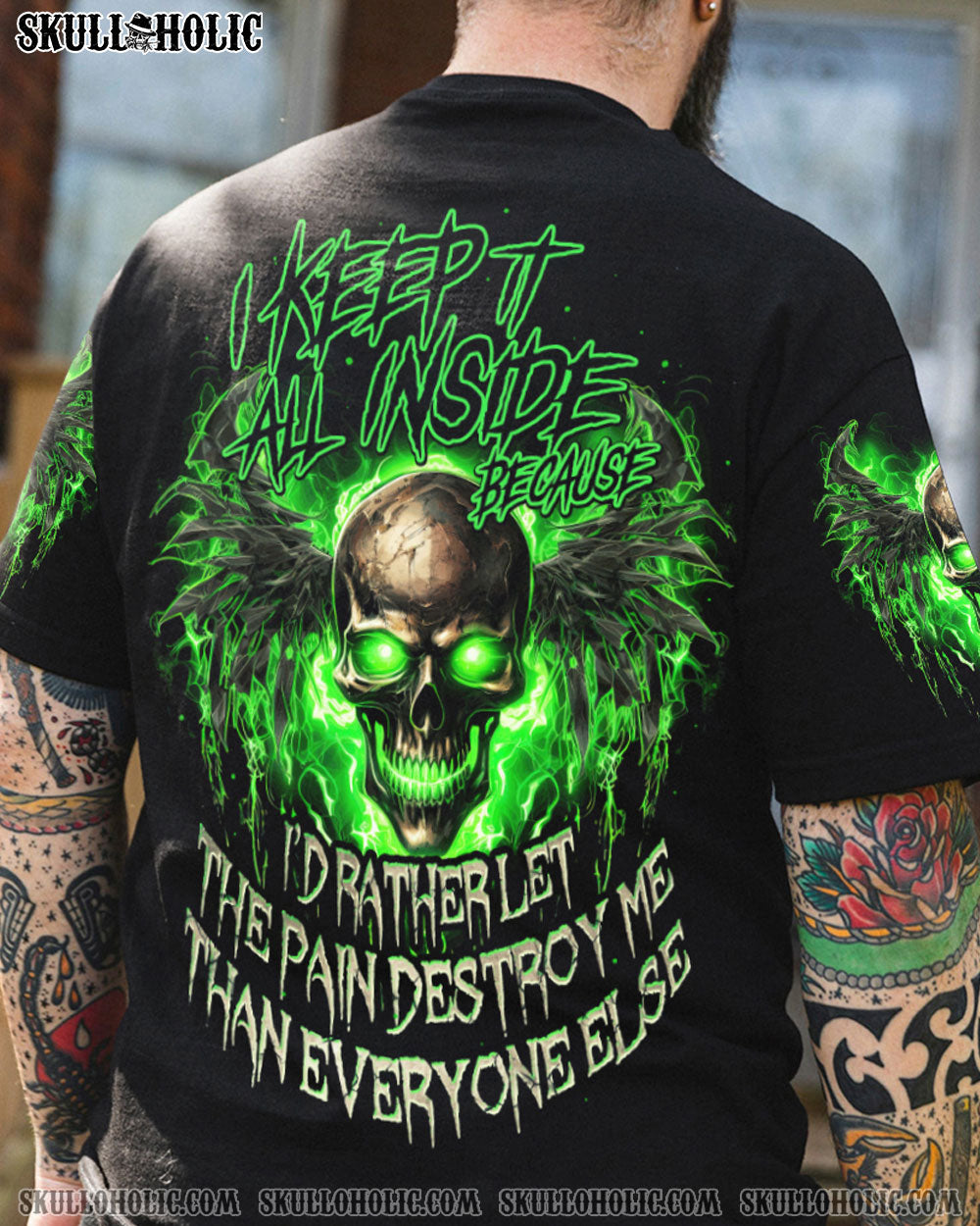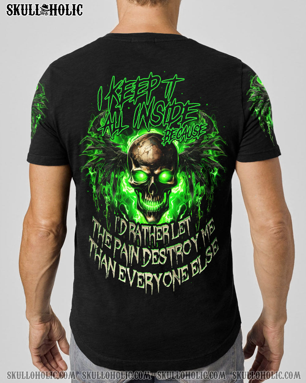 Dive into the realm of emotions with our extraordinary design! This captivating masterpiece features a striking skull, majestic wings, vibrant highlights, and the poignant quote, ‘I keep it all inside because I’d rather let the pain destroy me than everyone else.’ Together, they create a visually striking and powerful composition that captures the intricate tapestry of human emotions and inner struggles we often endure. The vivid colors amplify the depth of feeling, making it a profoundly impactful piece of art. Embrace this artwork as a reflection of your inner journey, a symbol of resilience in the face of adversity.