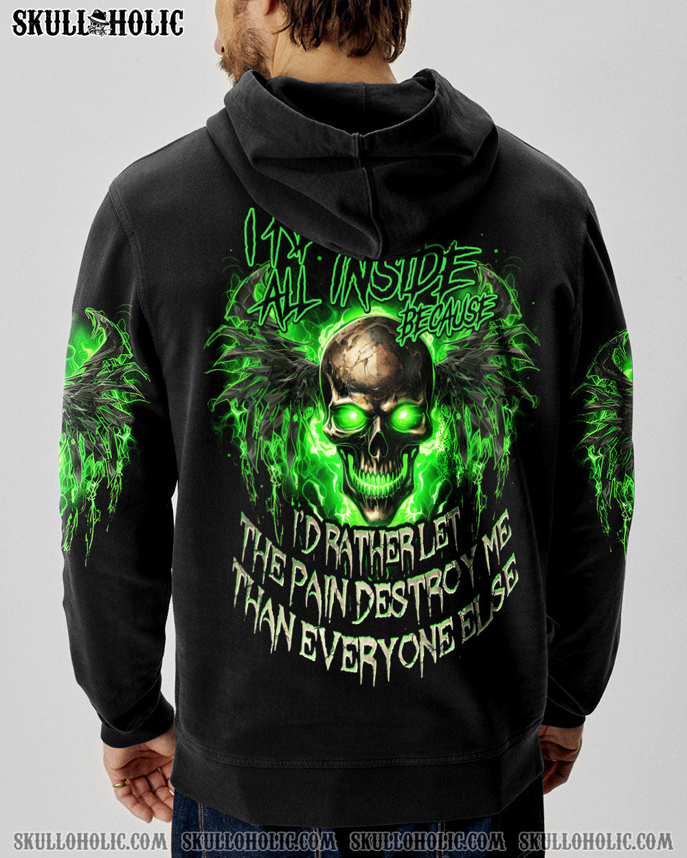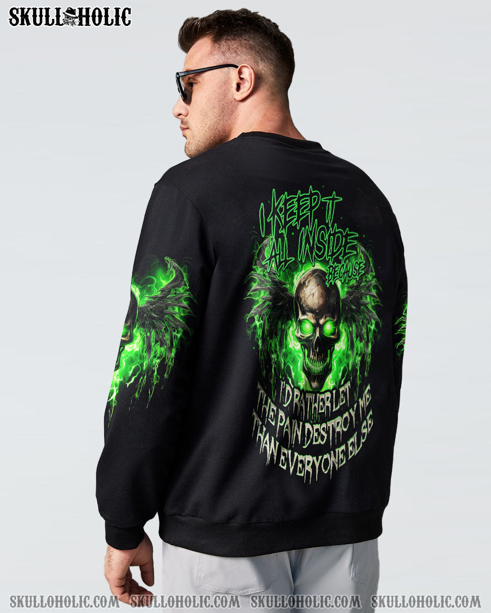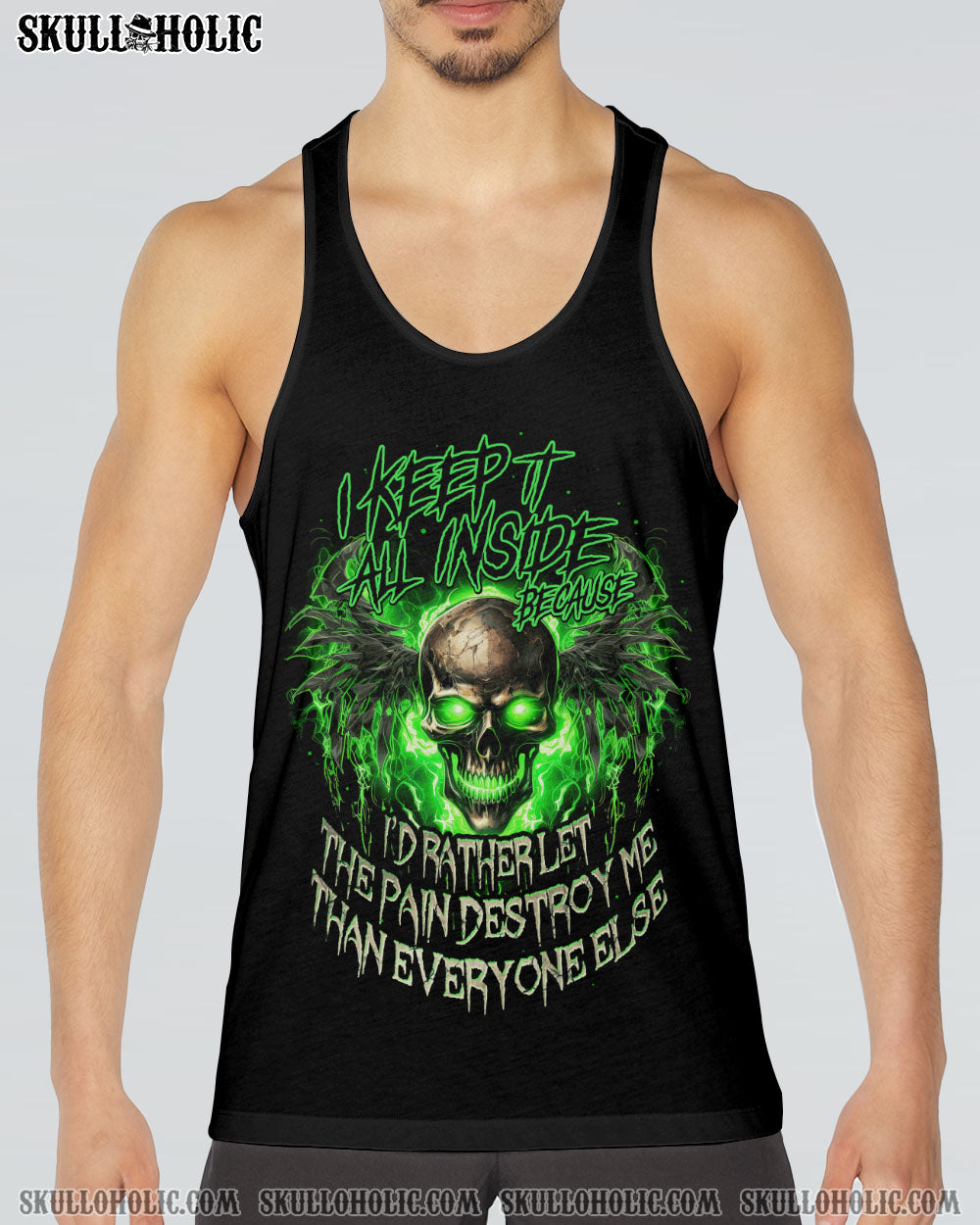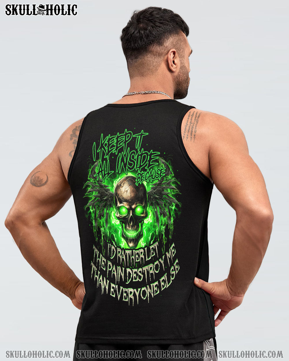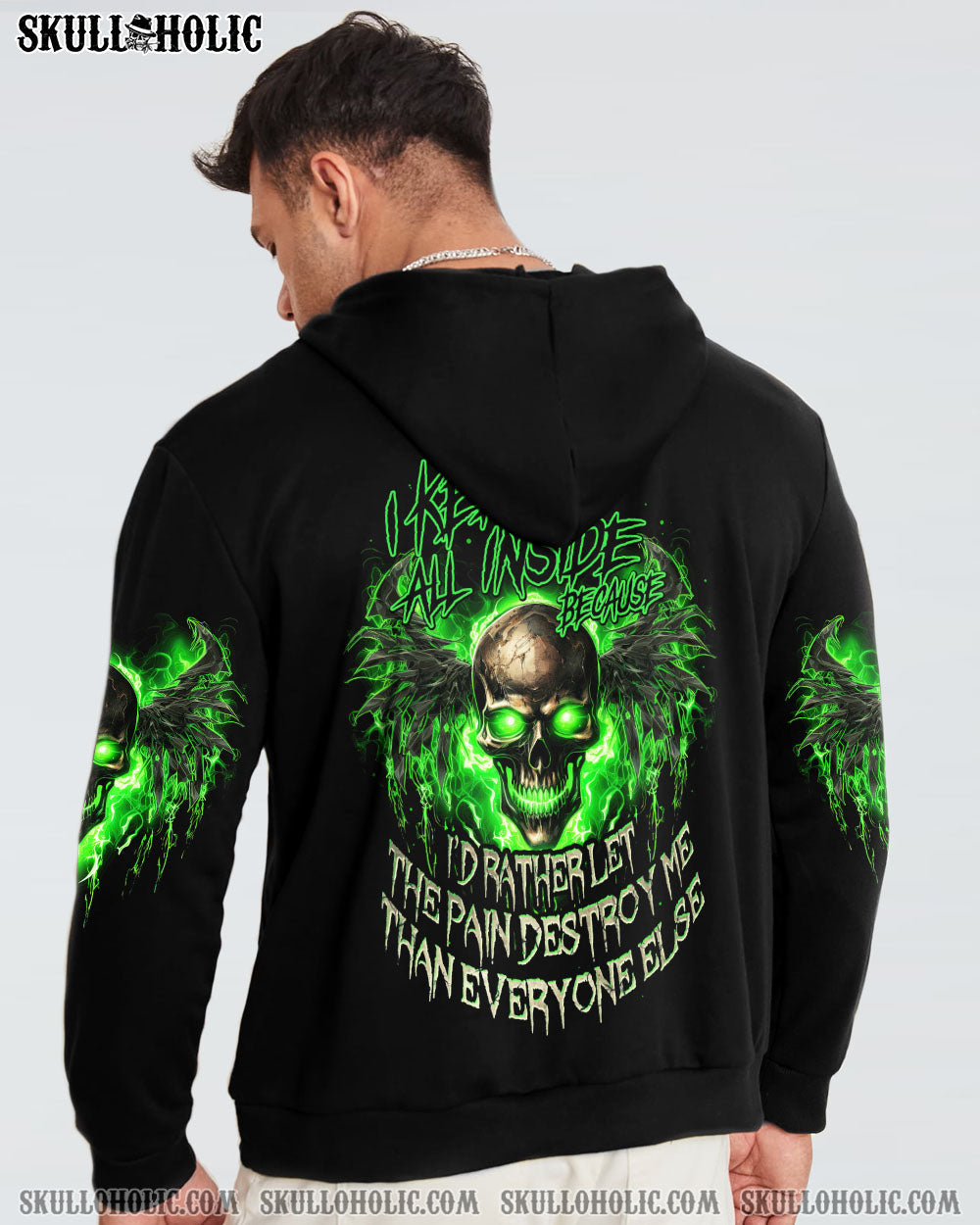 Dive into the realm of emotions with our extraordinary design! This captivating masterpiece features a striking skull, majestic wings, vibrant highlights, and the poignant quote, ‘I keep it all inside because I’d rather let the pain destroy me than everyone else.’ Together, they create a visually striking and powerful composition that captures the intricate tapestry of human emotions and inner struggles we often endure. The vivid colors amplify the depth of feeling, making it a profoundly impactful piece of art. Embrace this artwork as a reflection of your inner journey, a symbol of resilience in the face of adversity.