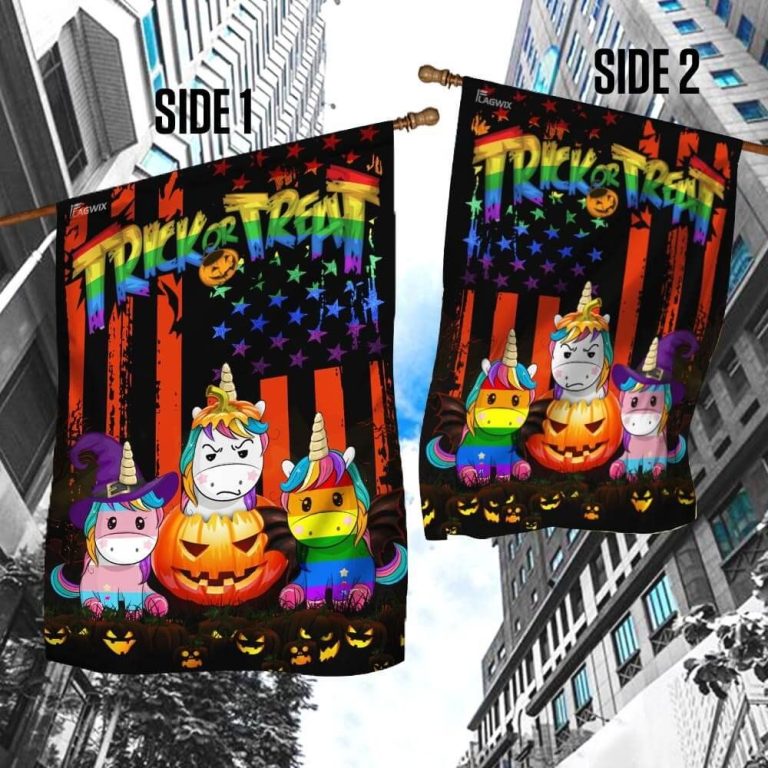 LGBT UNICORN HALLOWEEN TRICK OR TREAT HOUSE FLAG GARDEN FLAG – HOTHOT