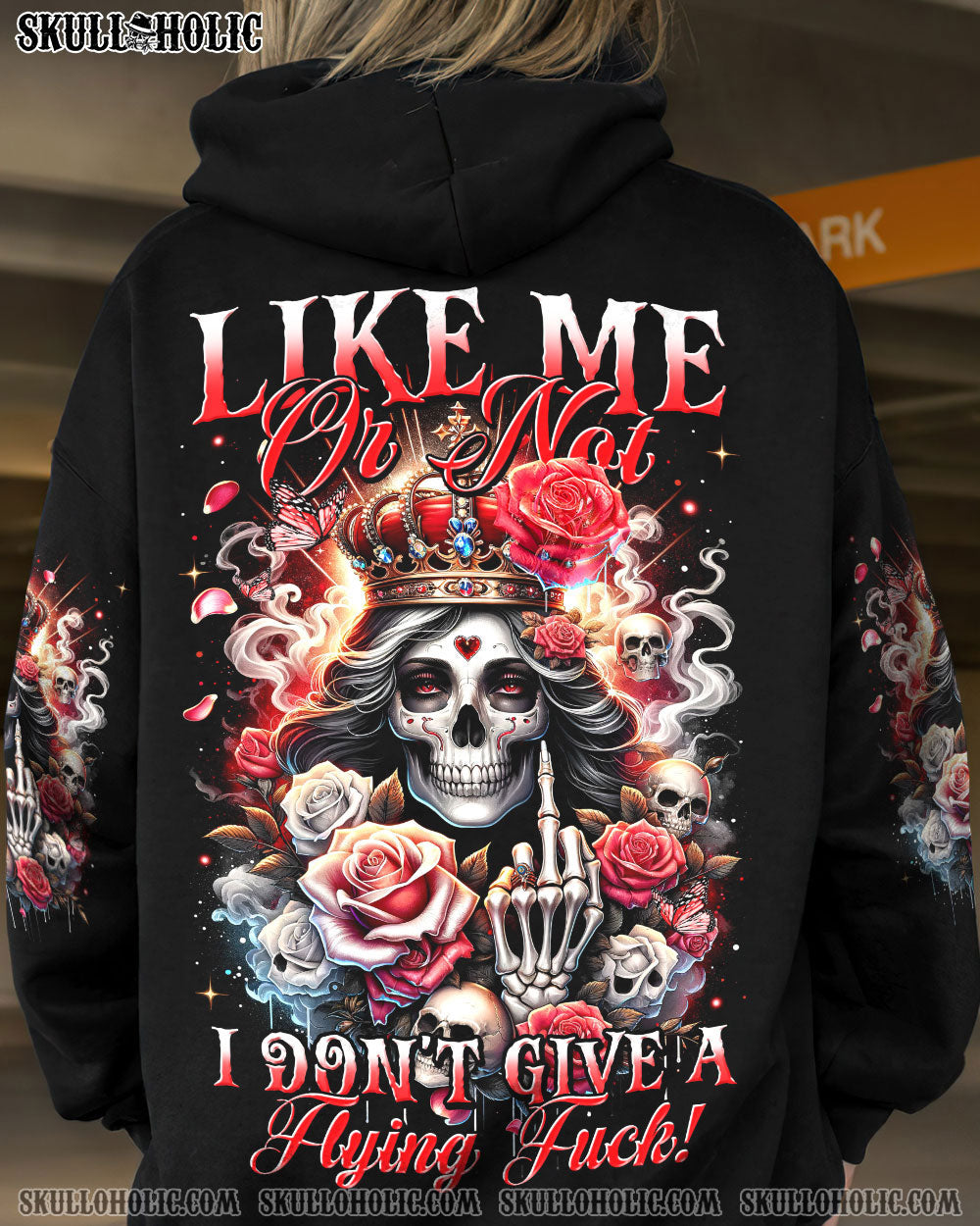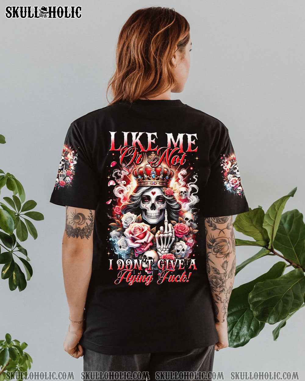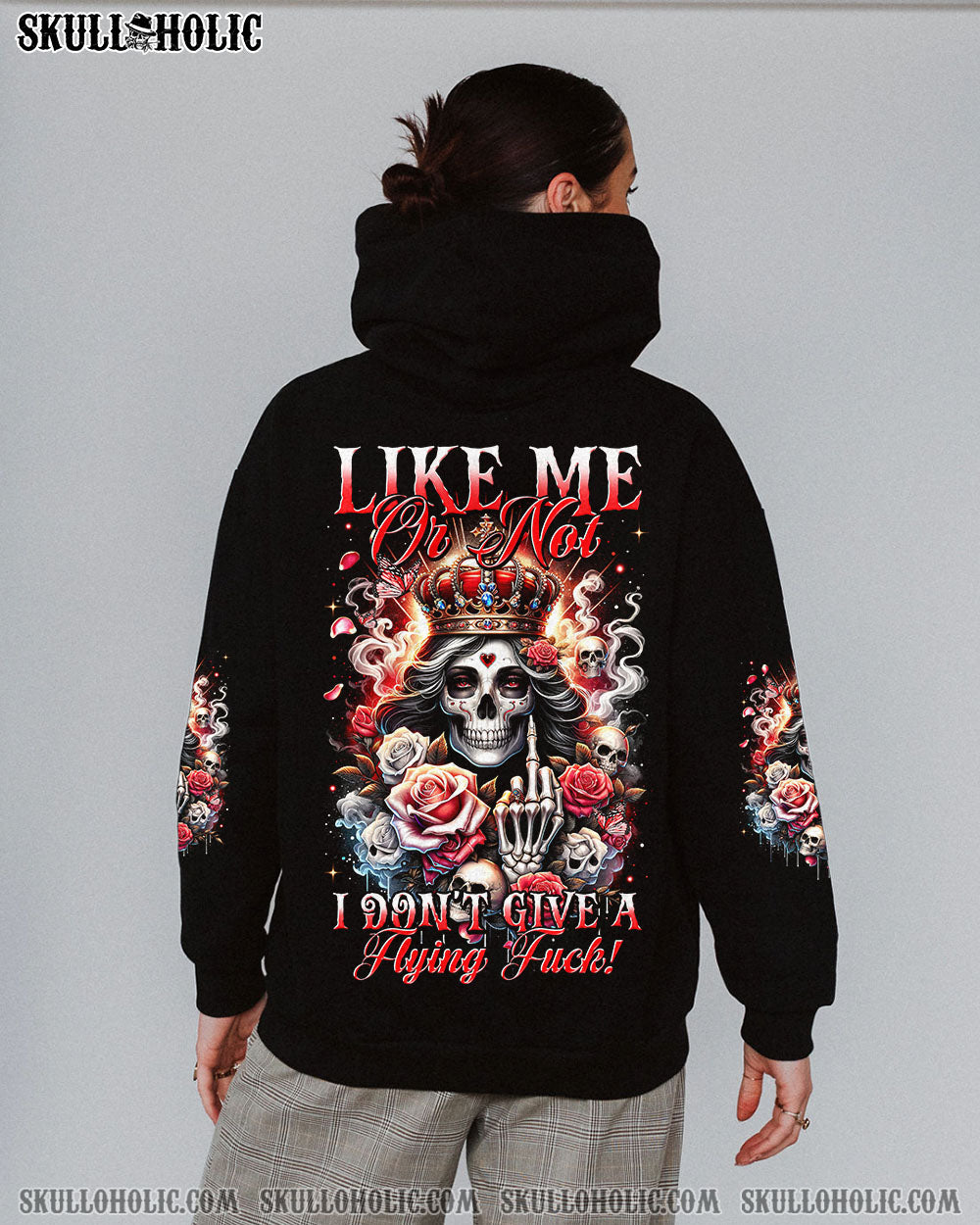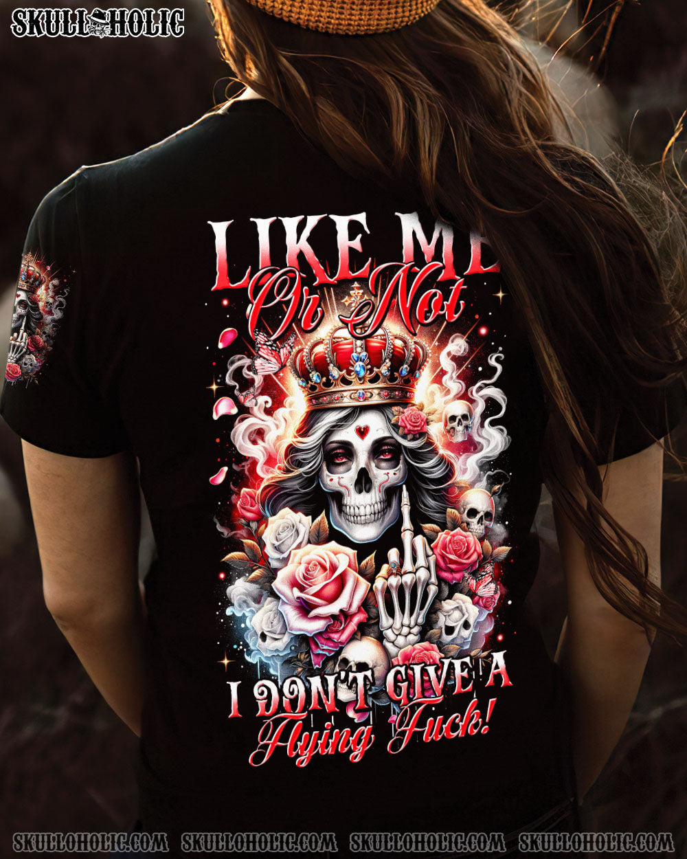 Embrace your unapologetic attitude with our LIKE ME OR NOT ALL OVER PRINT shirt. The crowned skull surrounded by fiery roses, smoke, and flames boldly declares independence. Fearless elegance meets delicate beauty in this outstanding design that celebrates individuality. Confidence reigns supreme in a world free of boundaries.