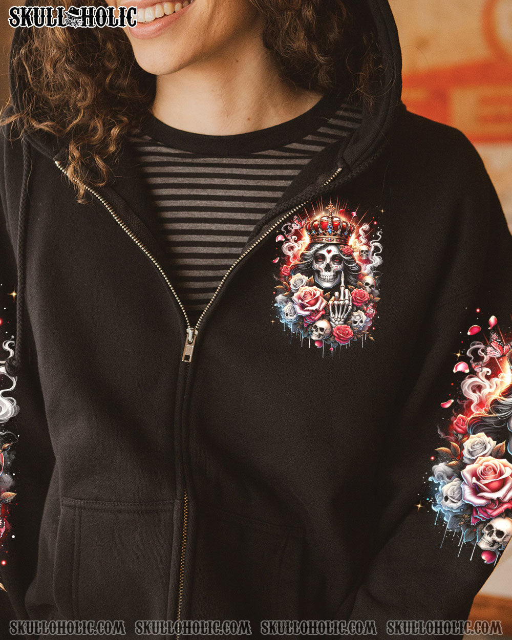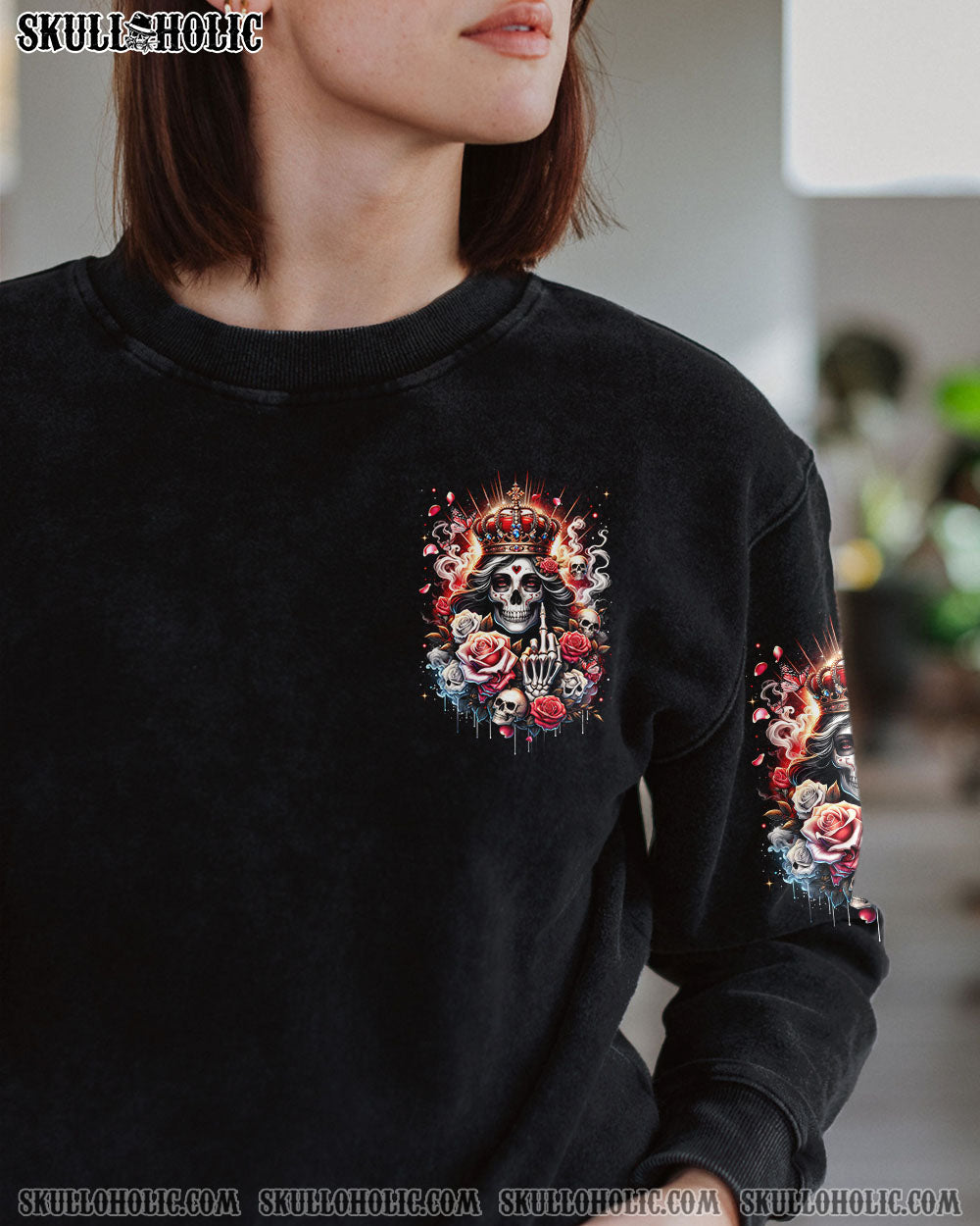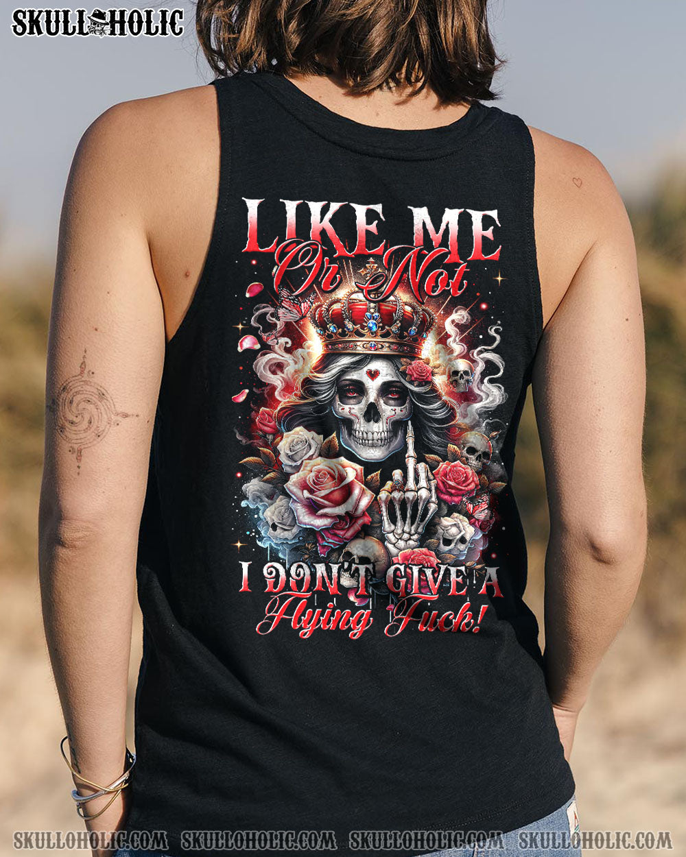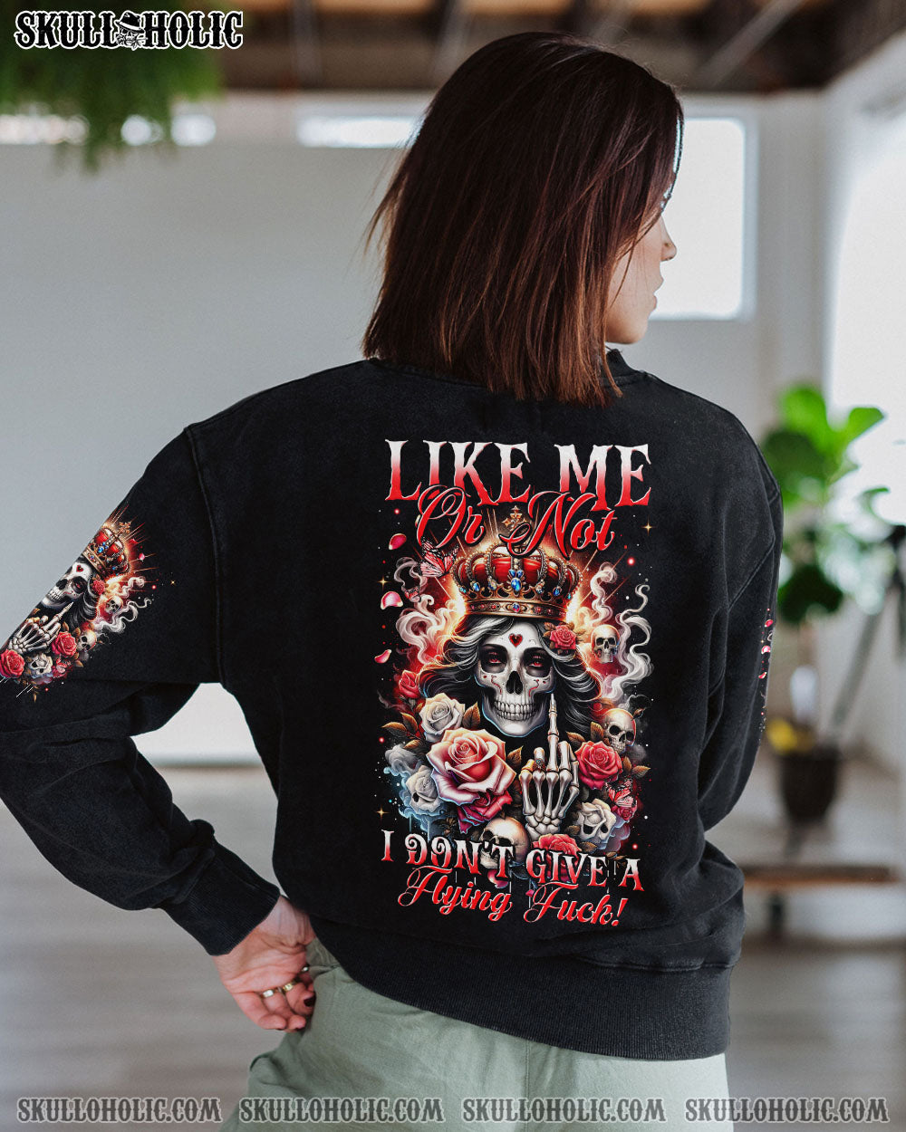 Embrace your unapologetic attitude with our LIKE ME OR NOT ALL OVER PRINT shirt. The crowned skull surrounded by fiery roses, smoke, and flames boldly declares independence. Fearless elegance meets delicate beauty in this outstanding design that celebrates individuality. Confidence reigns supreme in a world free of boundaries.