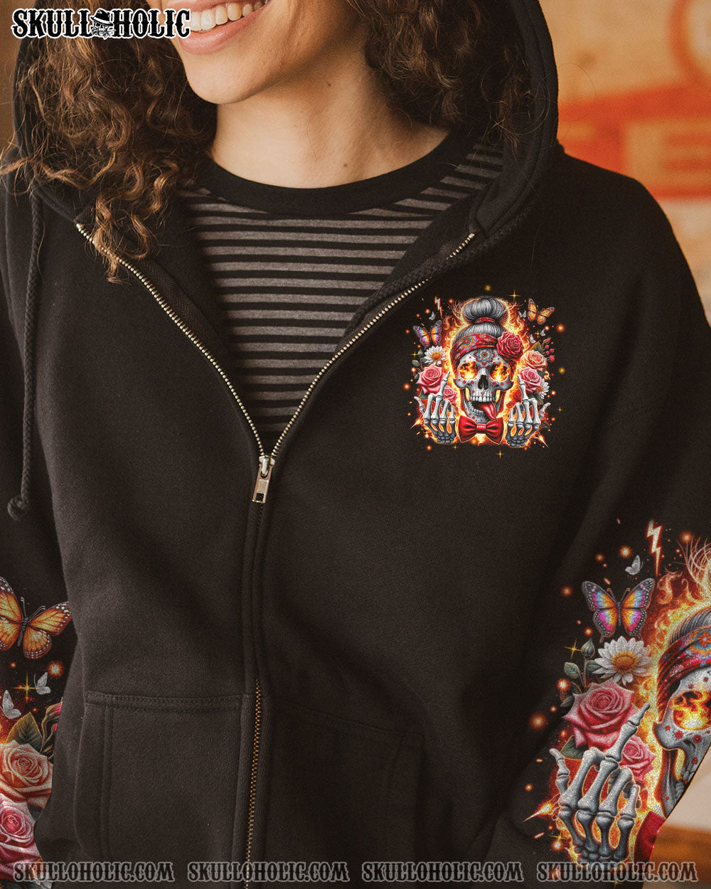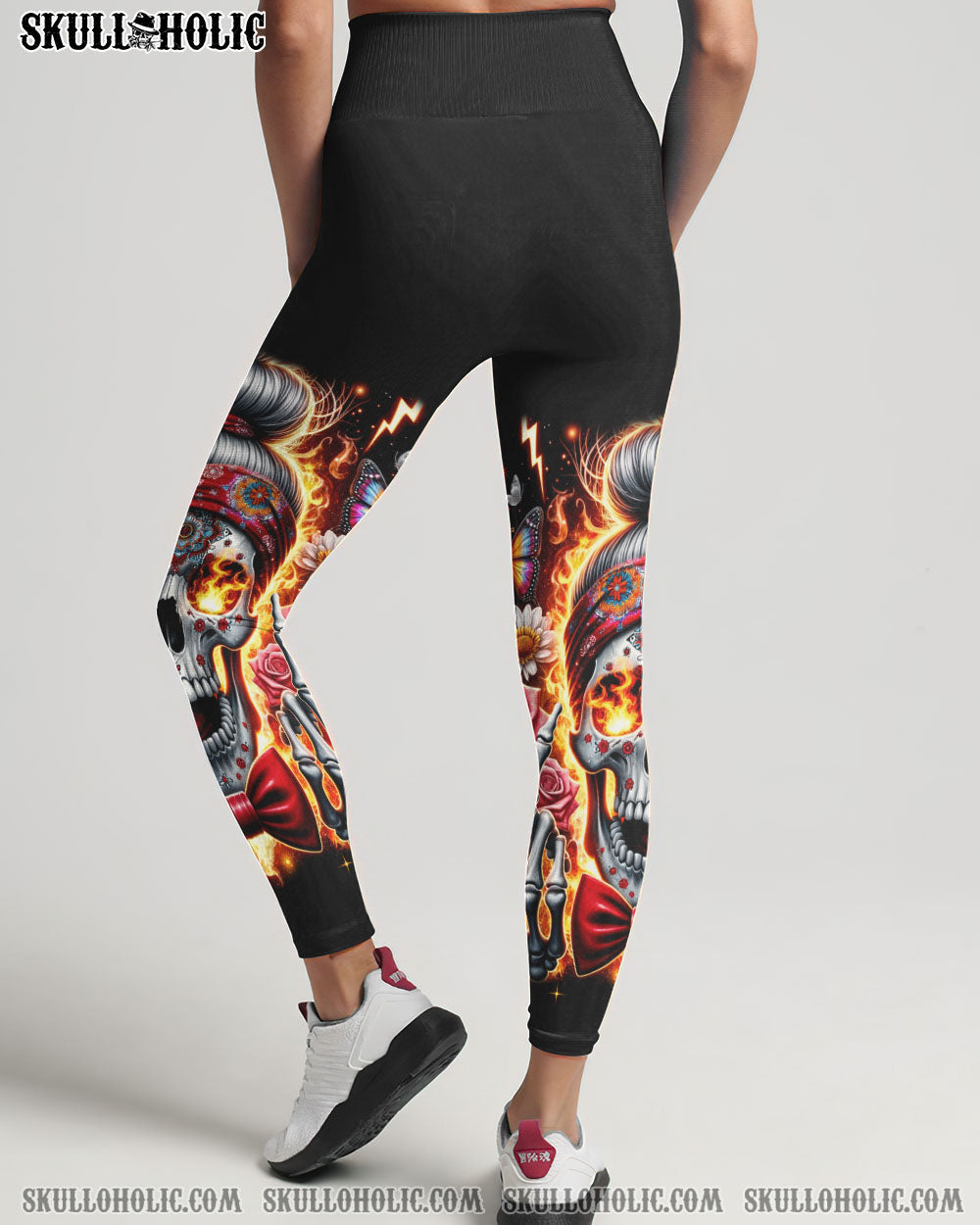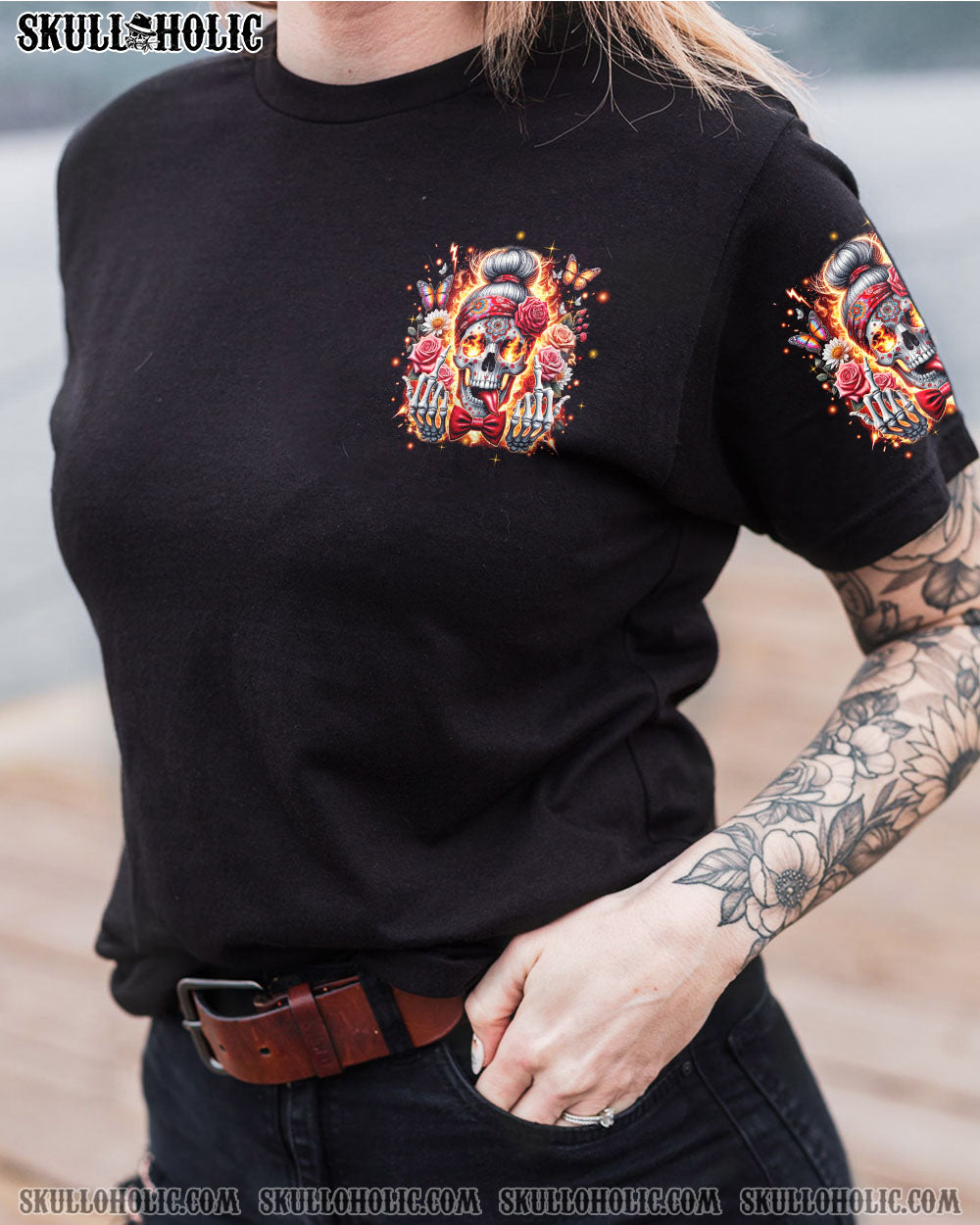 Step out of the ordinary and feel extraordinary with this unique, all-over-print design. Crafted with vibrant colors, it features a skull messy bun, headband, flowers, butterflies, and flames, all wrapped up in an inspiring quote. This captivating amalgamation symbolizes the harmonious coexistence of life’s diverse facets, perfect for expressing your unique style with strength and delicacy.