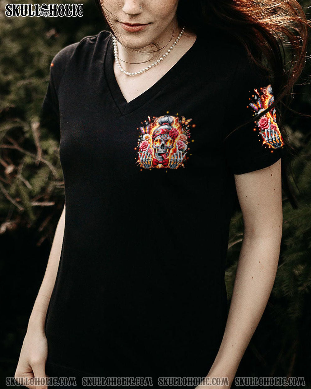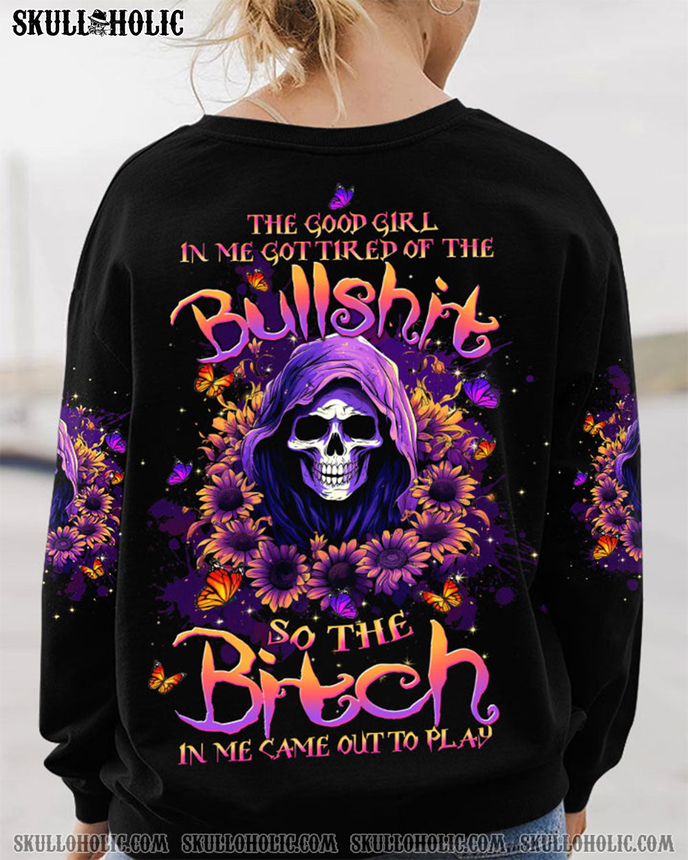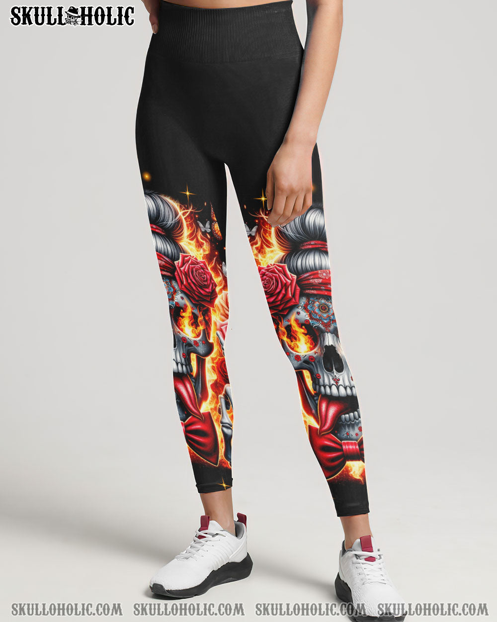 Step out of the ordinary and feel extraordinary with this unique, all-over-print design. Crafted with vibrant colors, it features a skull messy bun, headband, flowers, butterflies, and flames, all wrapped up in an inspiring quote. This captivating amalgamation symbolizes the harmonious coexistence of life’s diverse facets, perfect for expressing your unique style with strength and delicacy.