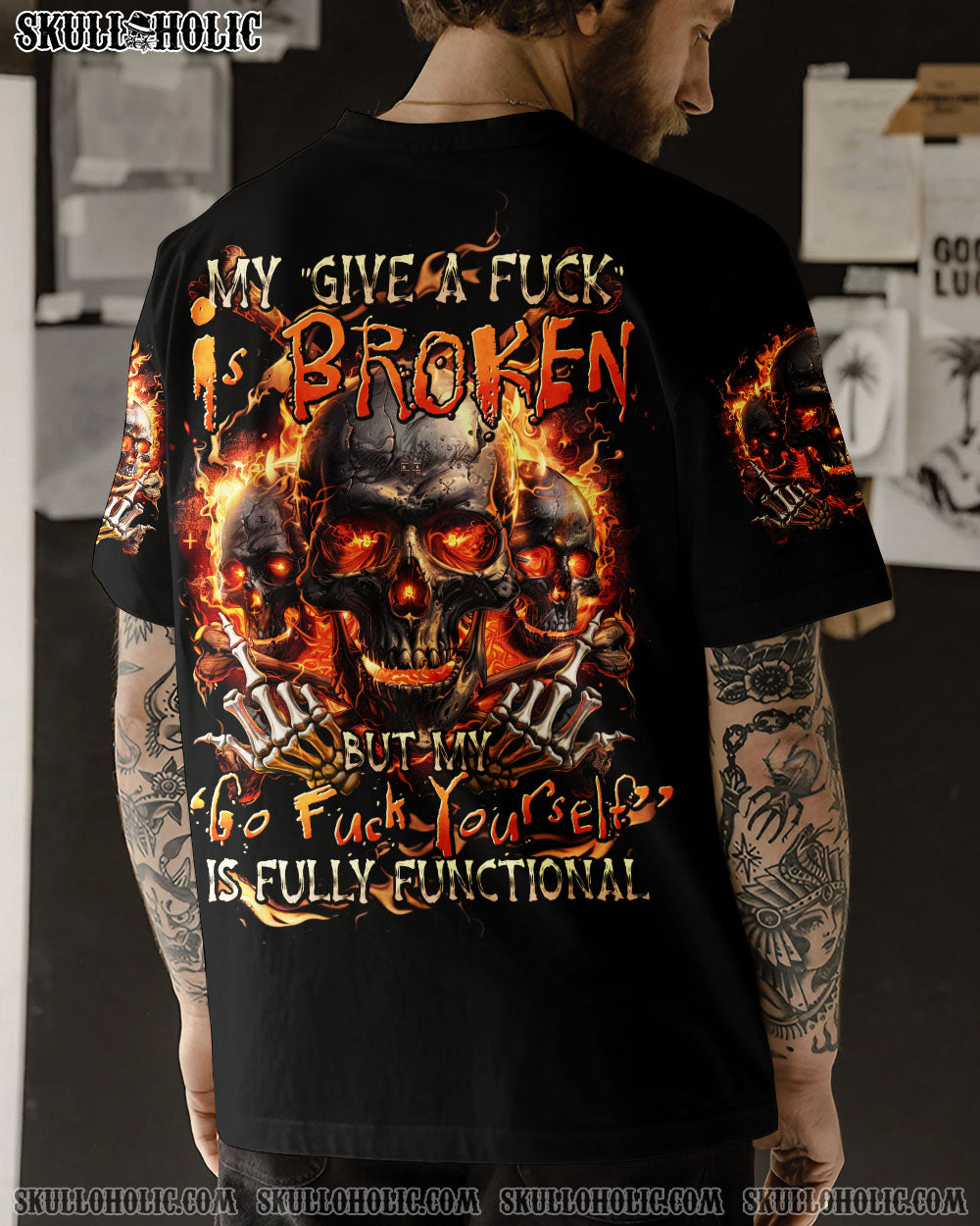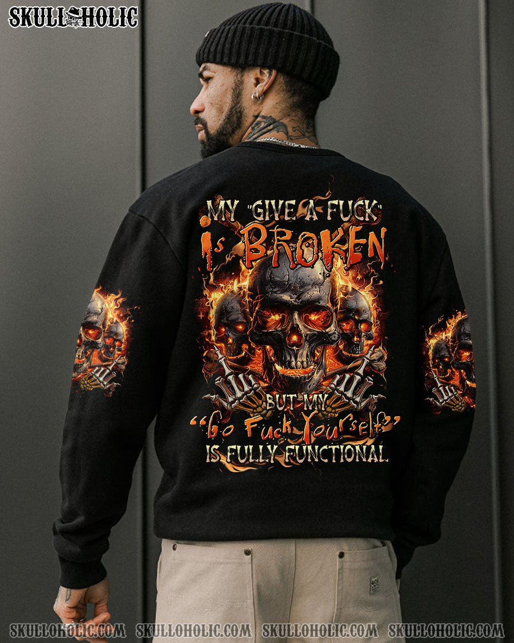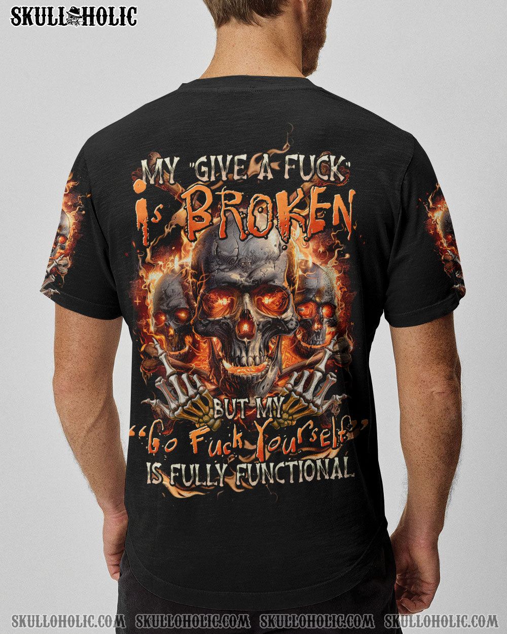 Embrace the bold energy of our MY GIVE A F IS BROKEN ALL OVER PRINT. Adorned with skulls, flames, and a powerful quote, this design symbolizes resilience and determination in the face of adversity. Let it inspire you to face challenges with courage and embrace your inner strength.