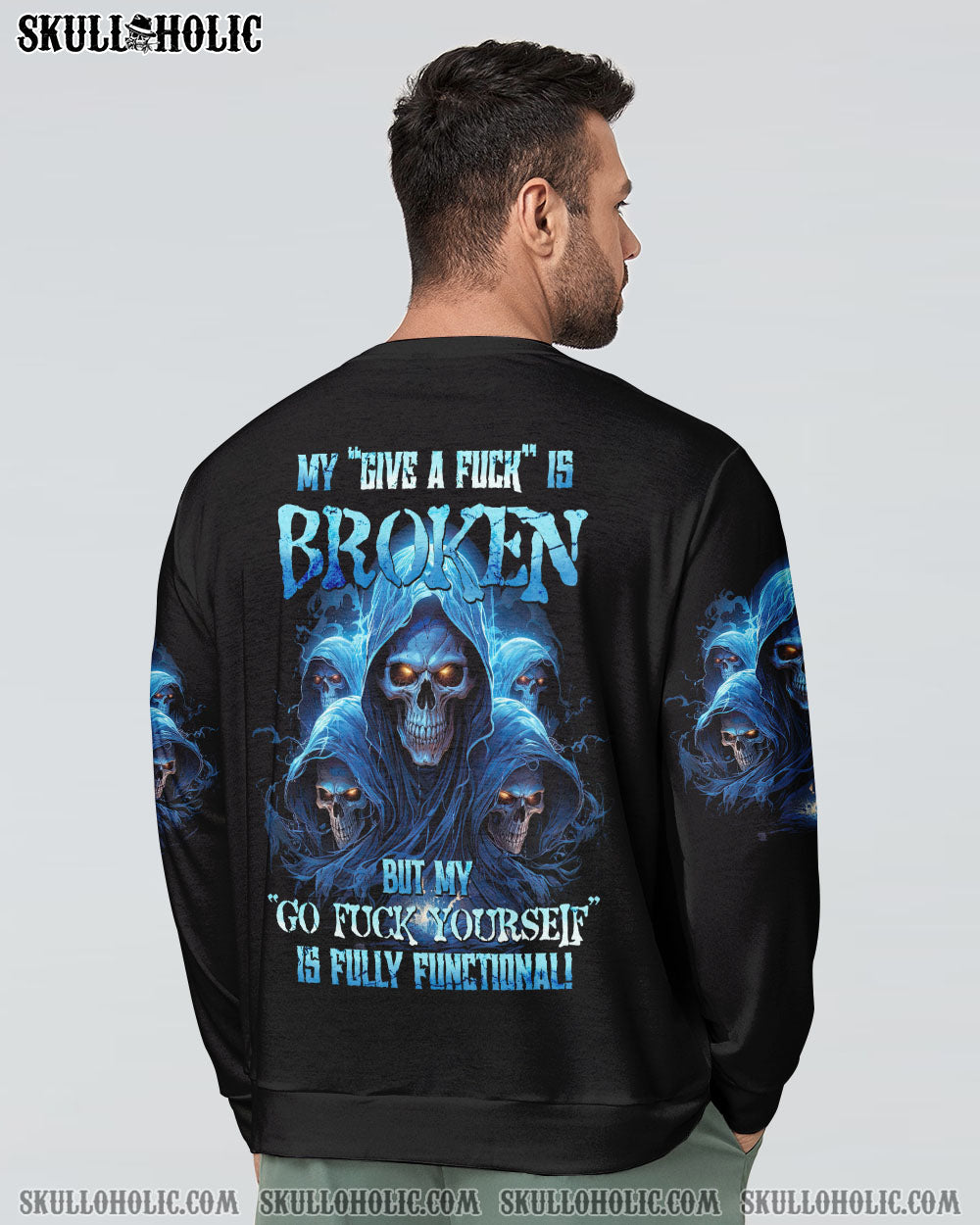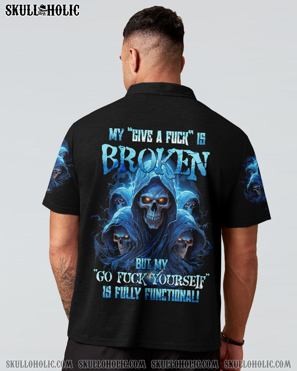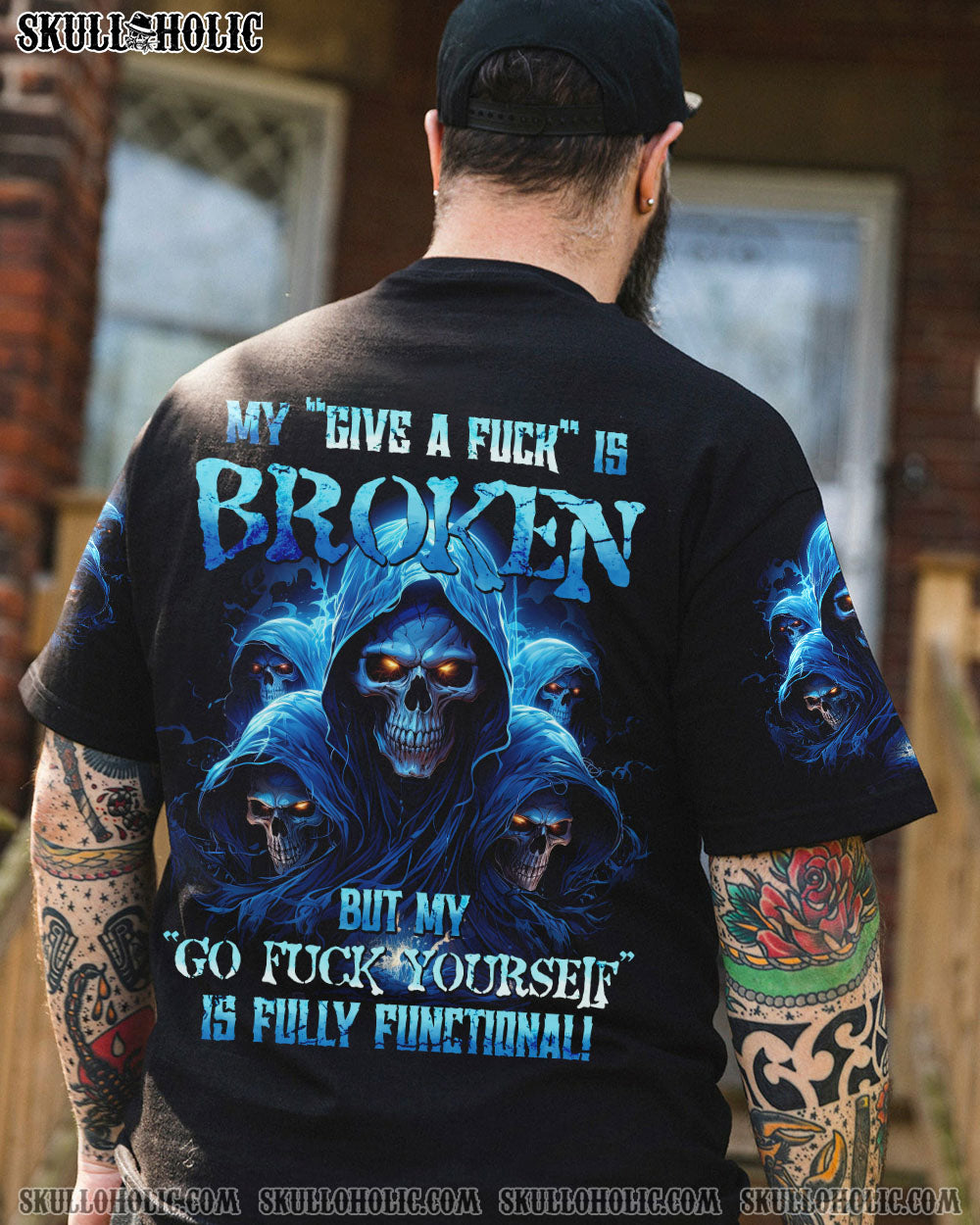 Unleash your fearless self-expression with our MY GIVE A F IS BROKEN ALL OVER PRINT shirt. Featuring a fierce design of a skull engulfed in flames and a bold declaration, this shirt is a bold statement of authenticity. Embrace your individuality and make a lasting impression wherever you go. Dare to be different.