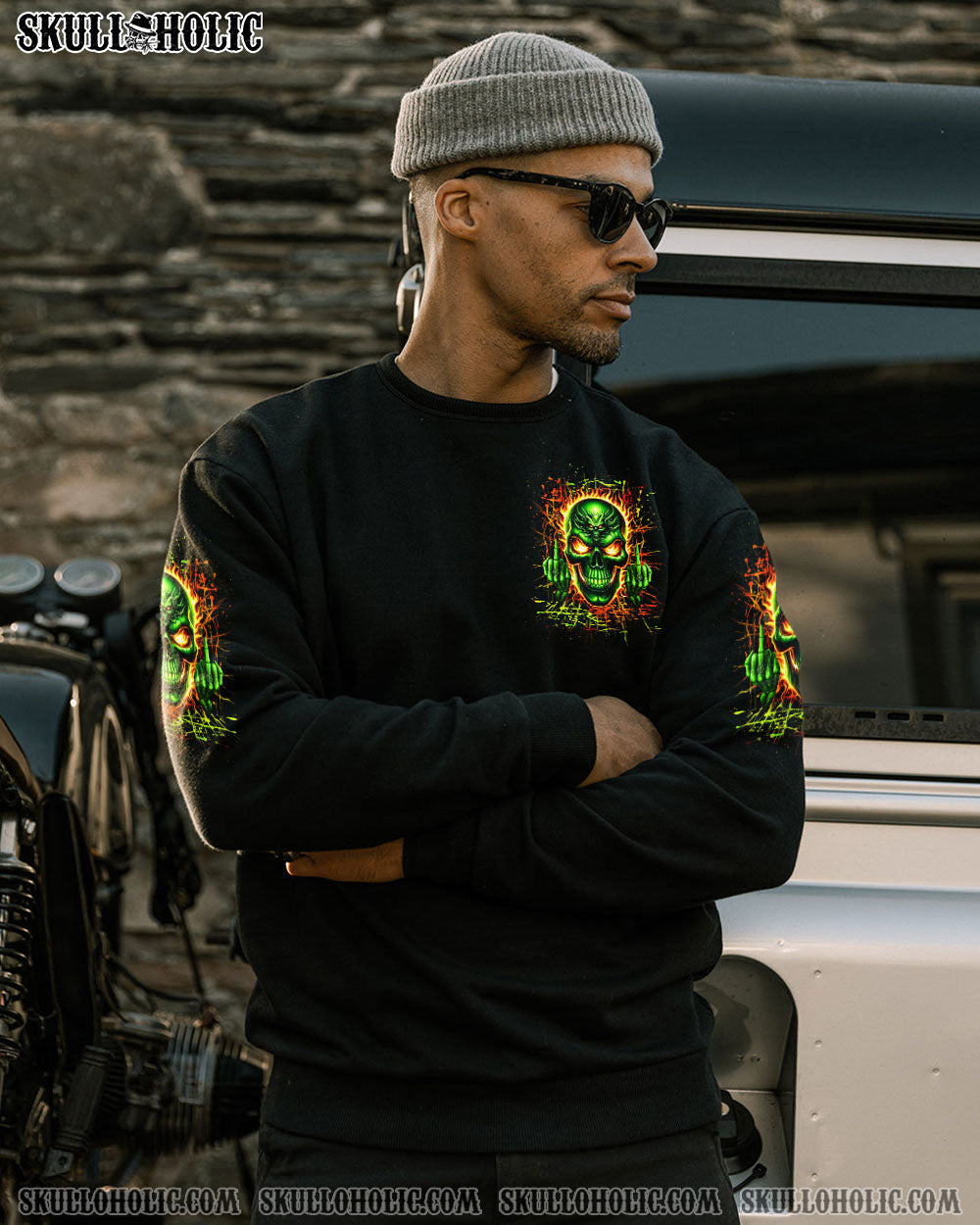 Embrace fearless spirit with our design—a menacing Skull with fiery eyes, defiantly raising two fingers amidst crackling lightning. This statement embodies resilience and unapologetic defiance, empowering you to confront life head-on. Stand tall, unyielding against obstacles, and embrace your authentic self.