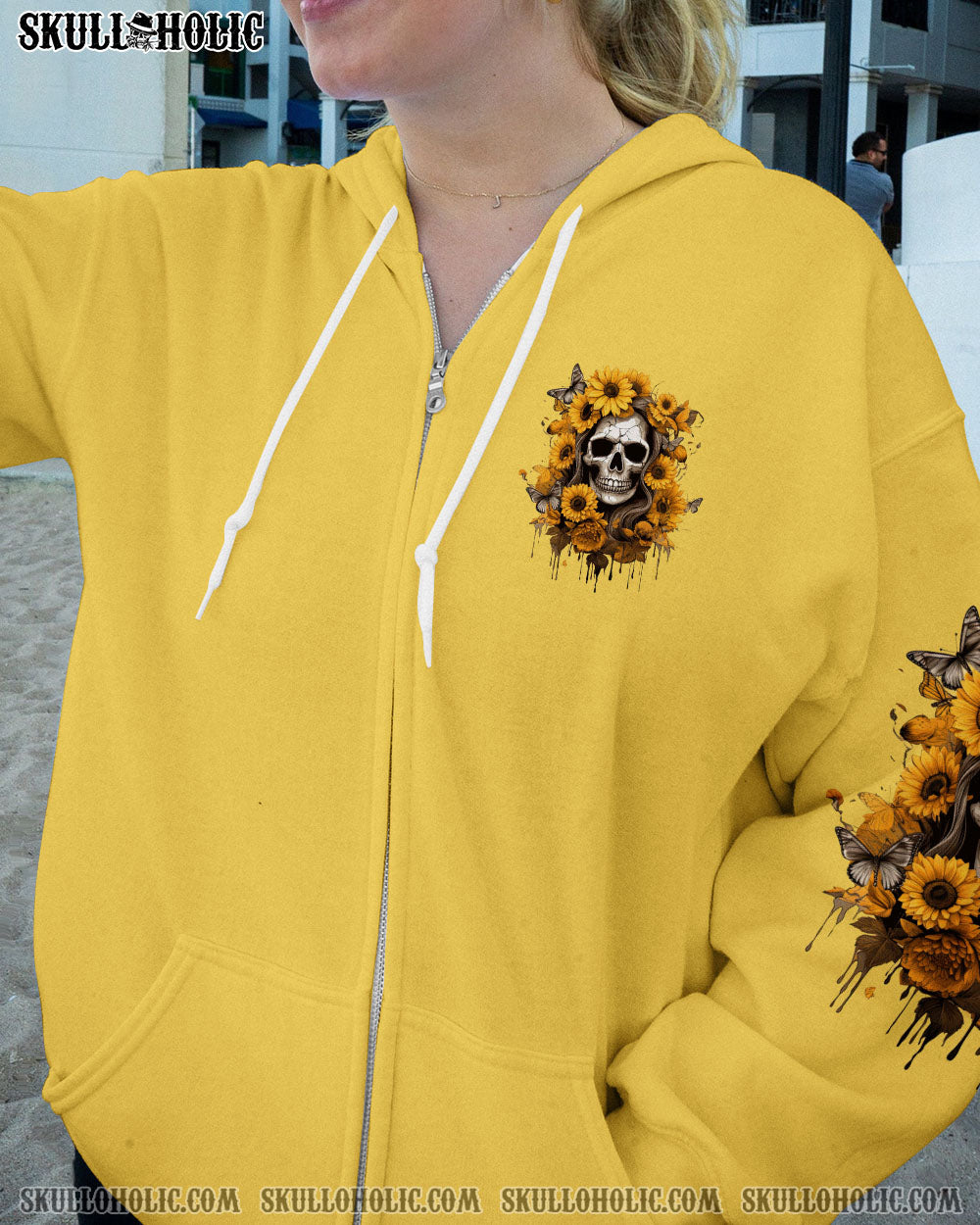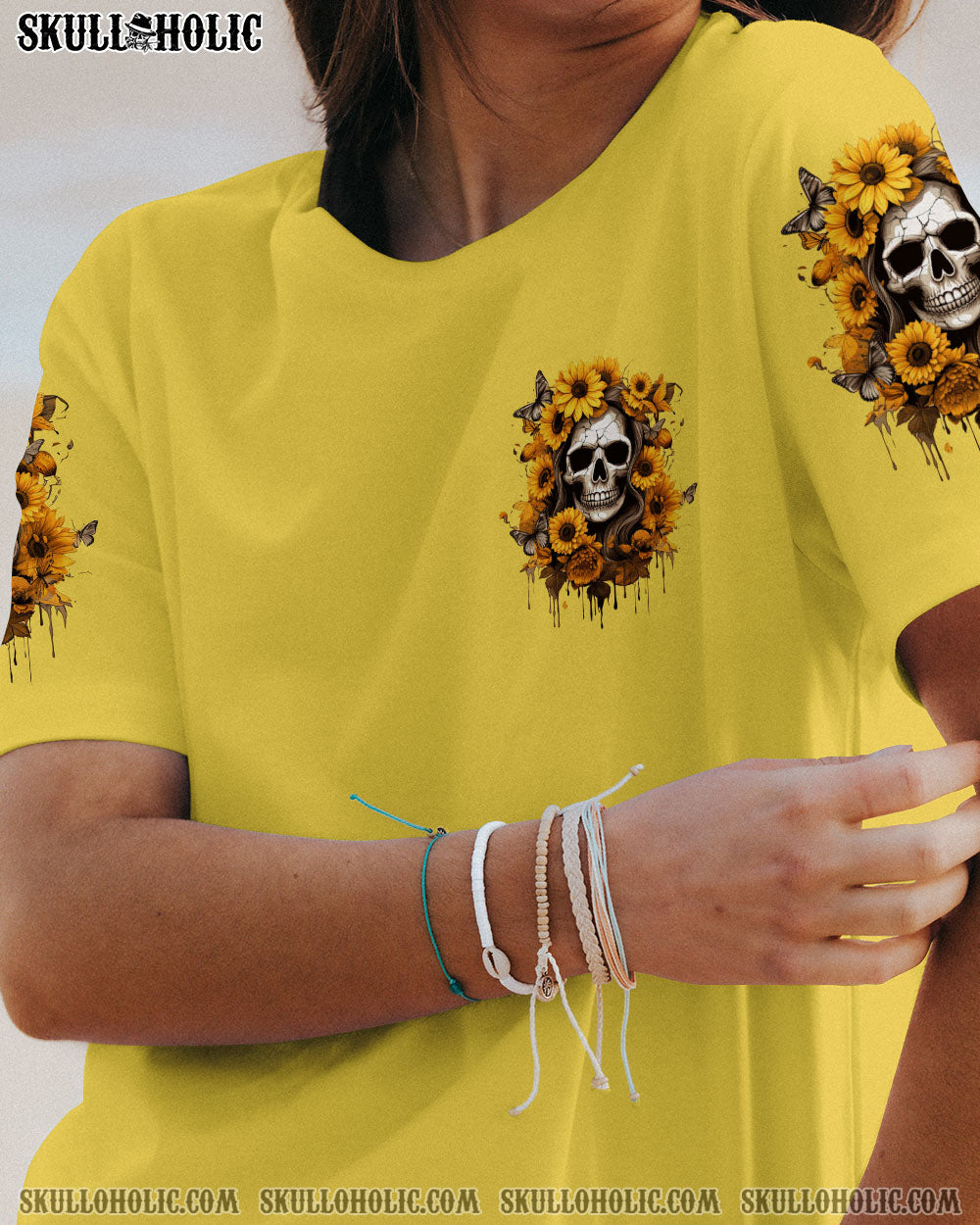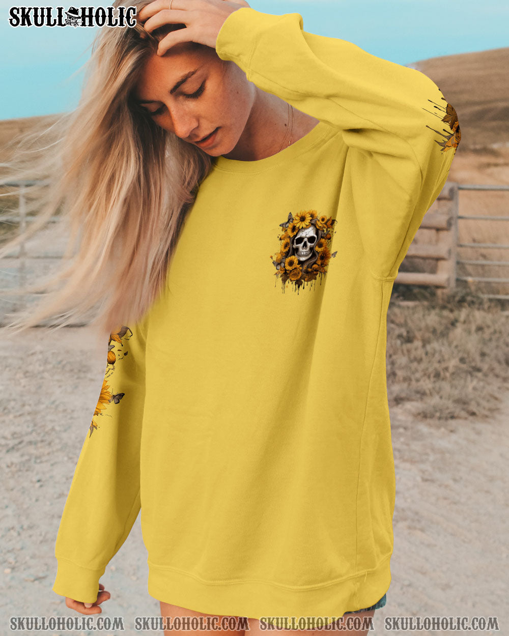 Our SUNSHINE MIXED WITH A LITTLE HURRICANE ALL OVER PRINT proudly displays a captivating interplay of nature and intensity with its intricate skull adorned with sunflowers and butterflies. This unique design stands as a symbol of the multifaceted beauty and strength of the human spirit. Show off your individual complexity with this vibrant and meaningful statement.