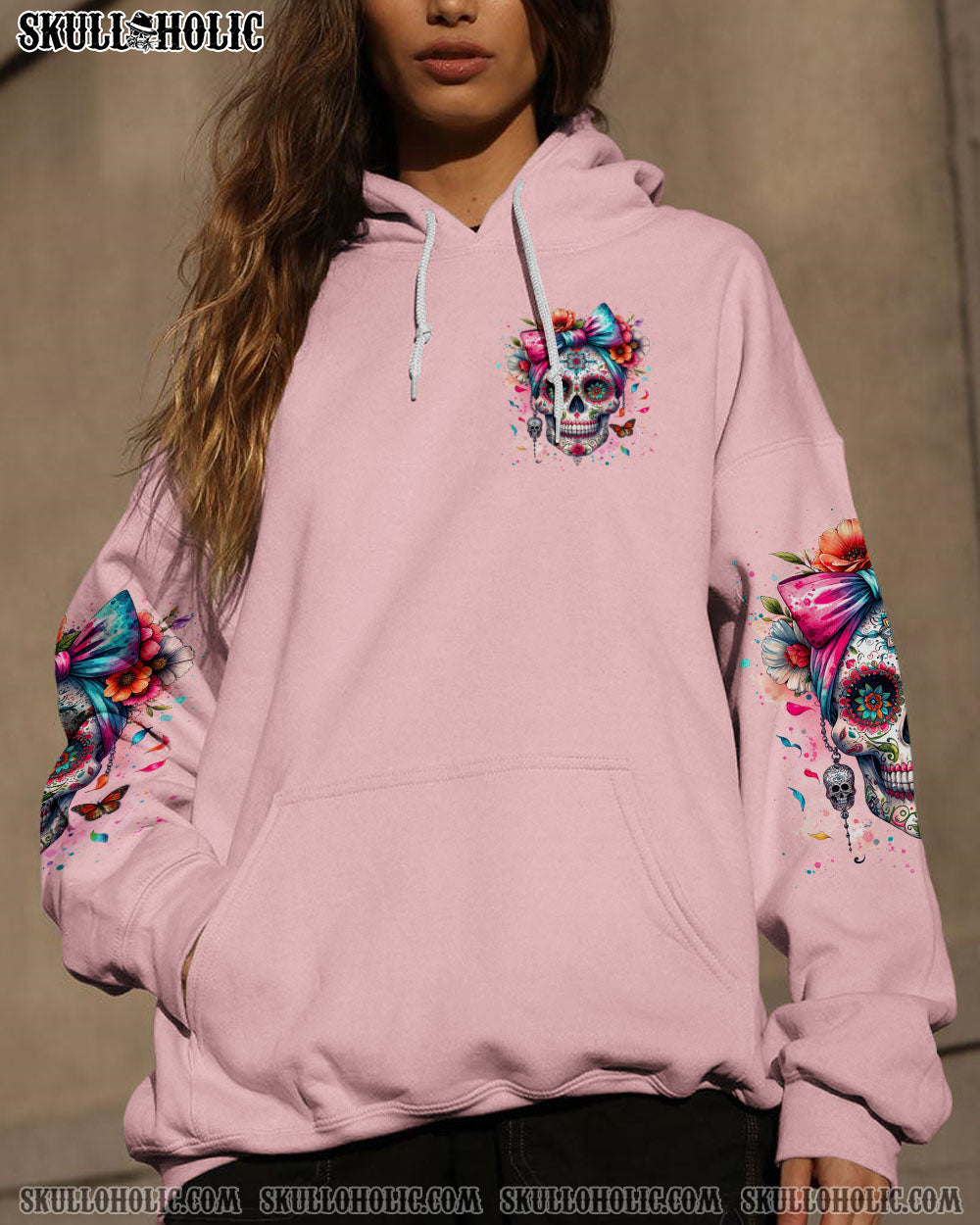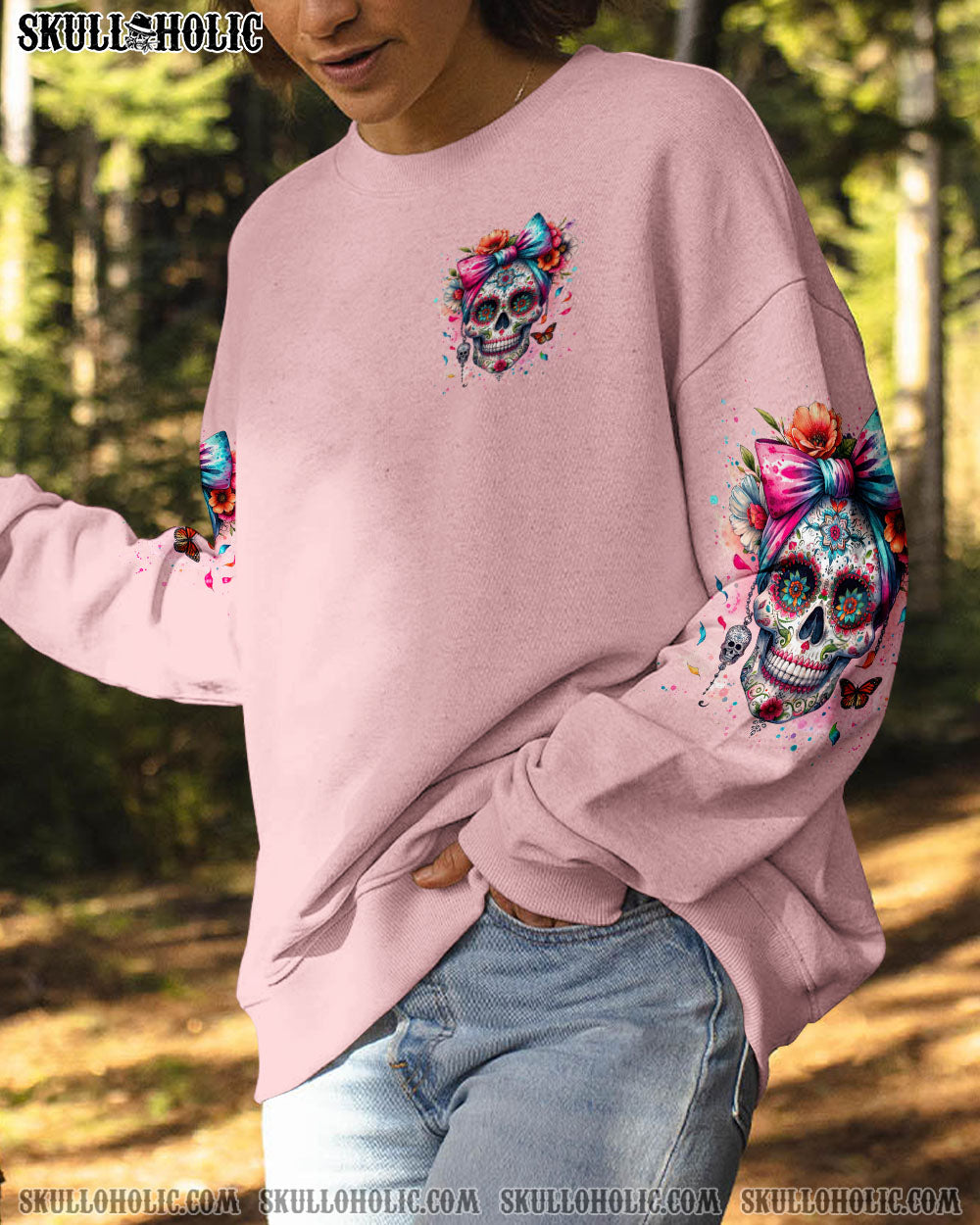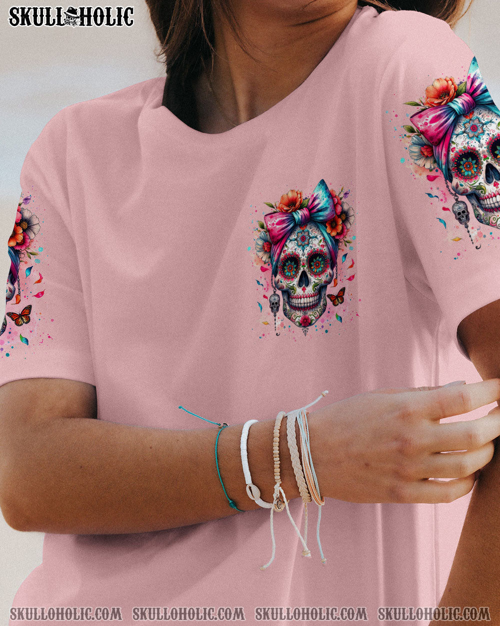 Introducing THE GOOD GIRL IN ME ALL OVER PRINT. A captivating design featuring sugar skulls, vibrant flowers, and delicate butterflies, this statement piece adds boldness and beauty to any space. Show off your individuality and artistic expression with this mesmerizing and harmonious blend, creating a visual symphony that celebrates self-expression. Make a powerful statement and elevate your surroundings with this unique design.