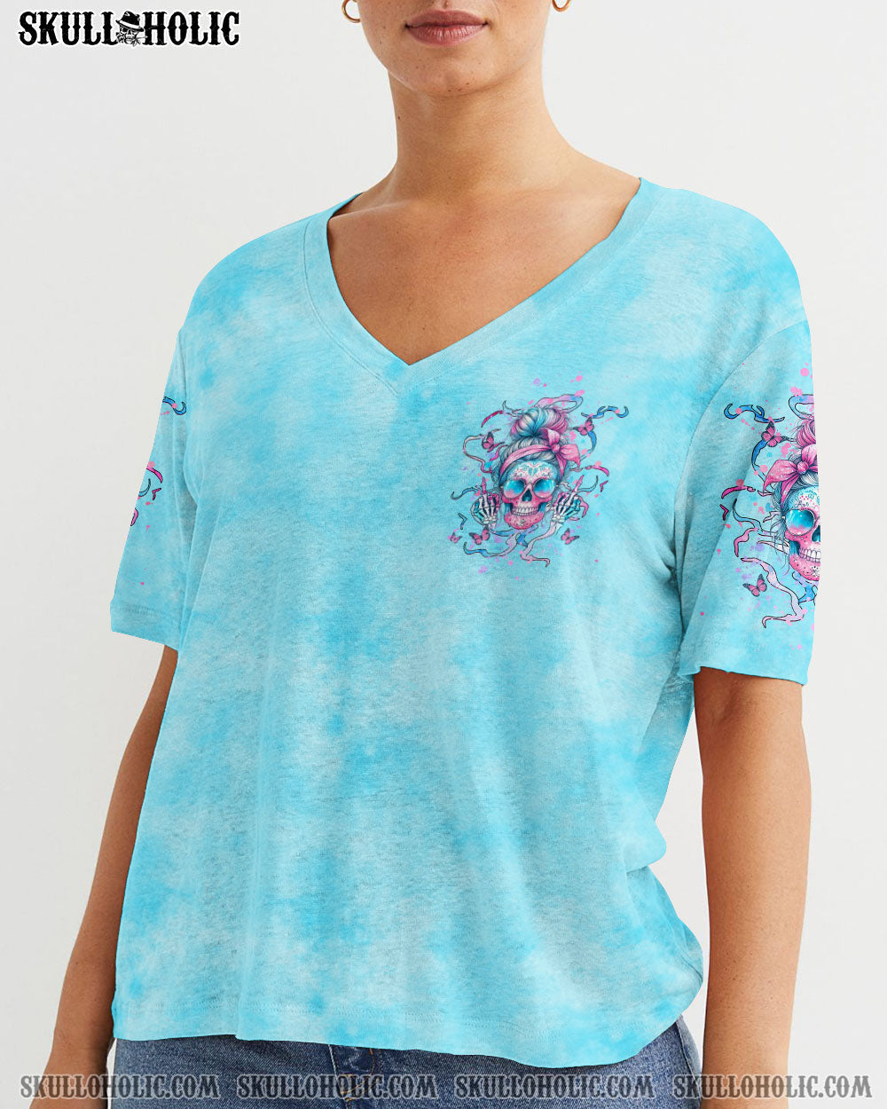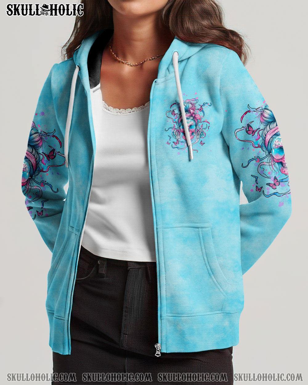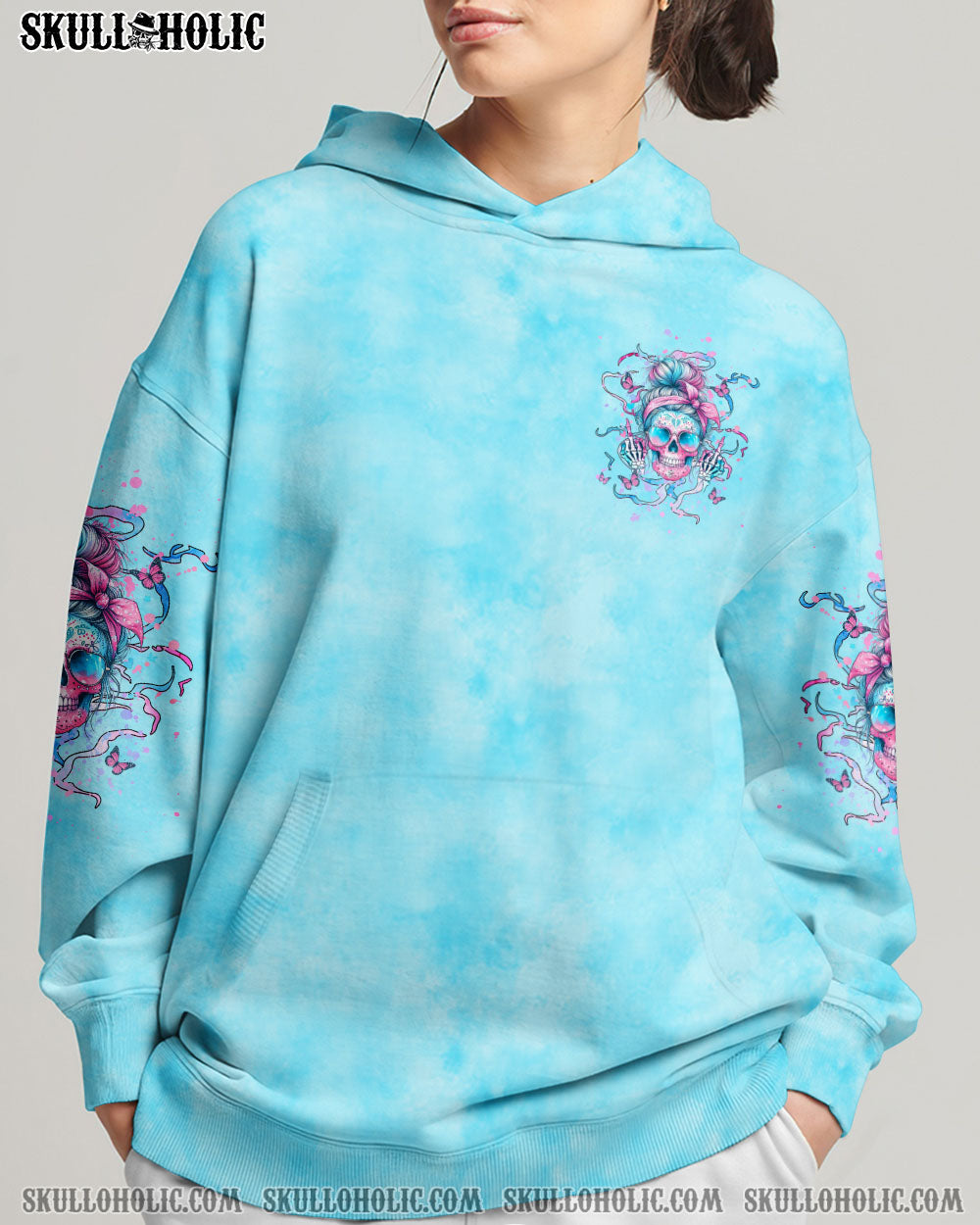 Embrace your rebel spirit! Our design showcases a stylish skull with a messy bun, cool glasses, and a headband, raising two fingers in defiance. Surrounded by vibrant butterflies, it’s all about empowerment and self-expression. Embrace your strength and unleash your fierce side!