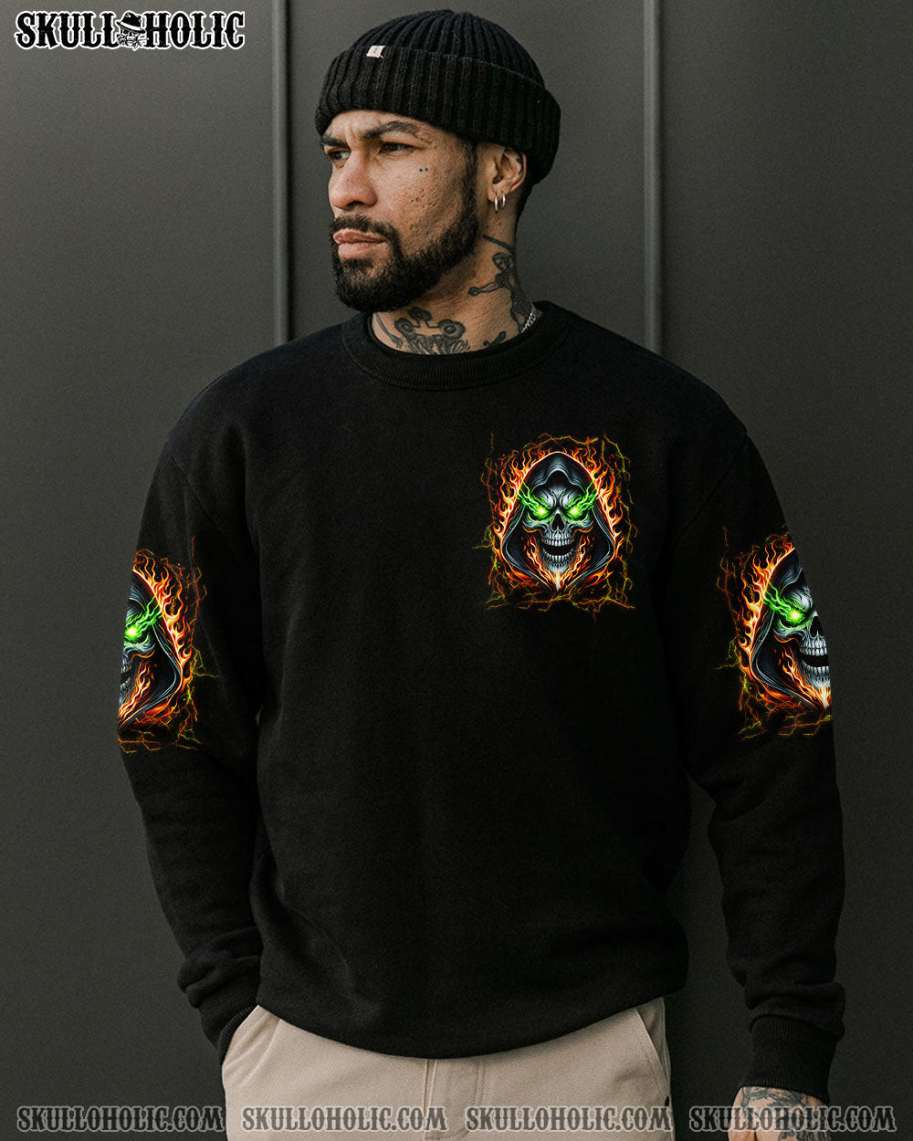 Embrace intensity with our latest design—a menacing skull reaper with fiery eyes, engulfed in smoke and lightning. This bold piece declares your no-nonsense attitude towards ignorance and frustration, perfect for those who demand respect and stand their ground.