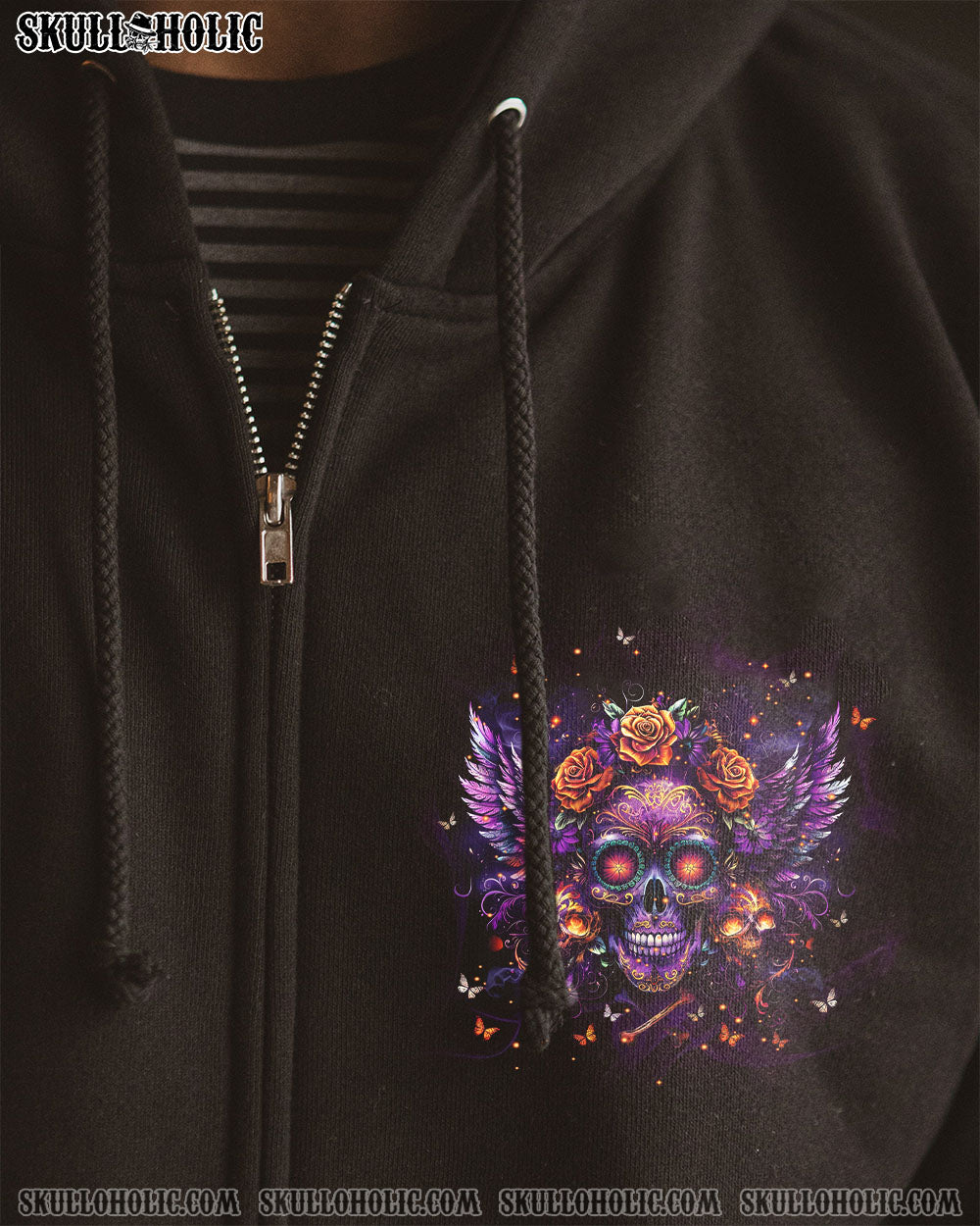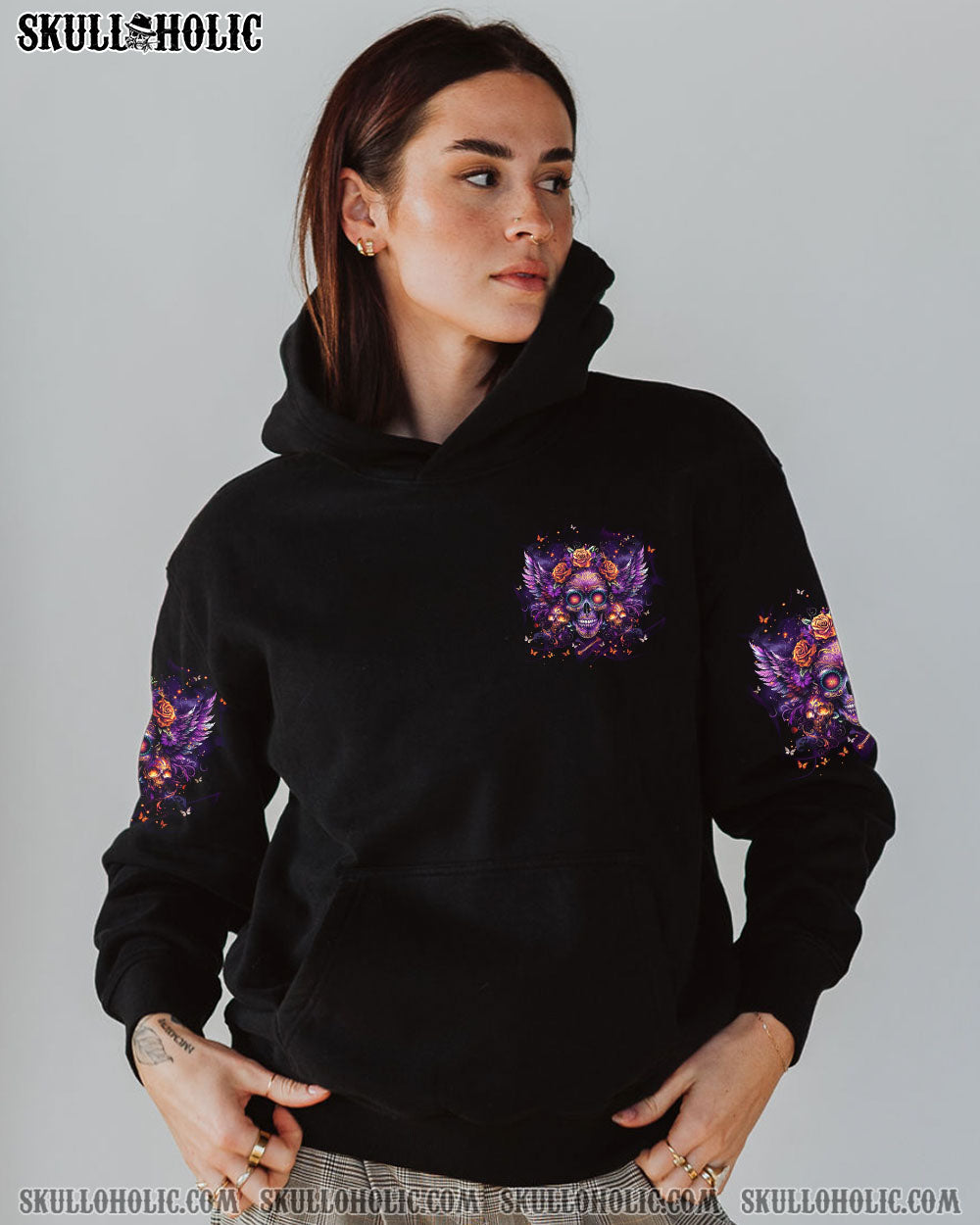 Introducing our captivating skull wings design, adorned with delicate pink flowers and small skulls, making a bold statement with every flourish. Embrace your own boundaries with this design, asserting your confidence and assertiveness, while demonstrating your intolerance for ignorance and nonsense.