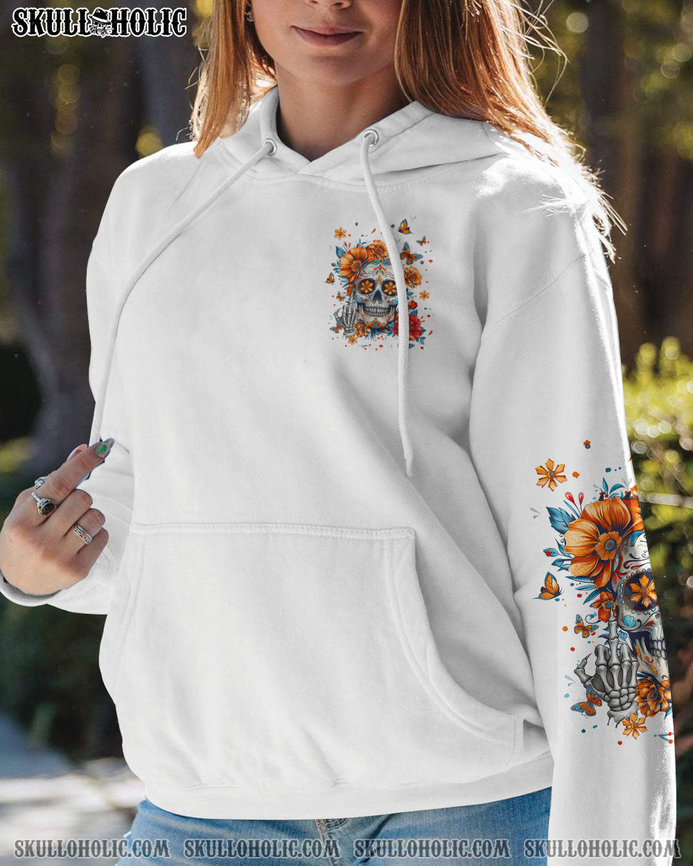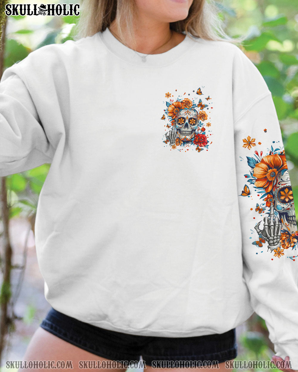Embrace the boldness of our sugar skull design adorned with vibrant blooming flowers. This statement piece exudes strength and independence, making it clear that individuality and self-confidence are at the forefront. The design symbolizes empowerment and resilience, celebrating uniqueness and personal style. Perfect for those who refuse to conform and proudly flaunt their personality. Discover a design that speaks volumes about your bold spirit and distinctive taste.