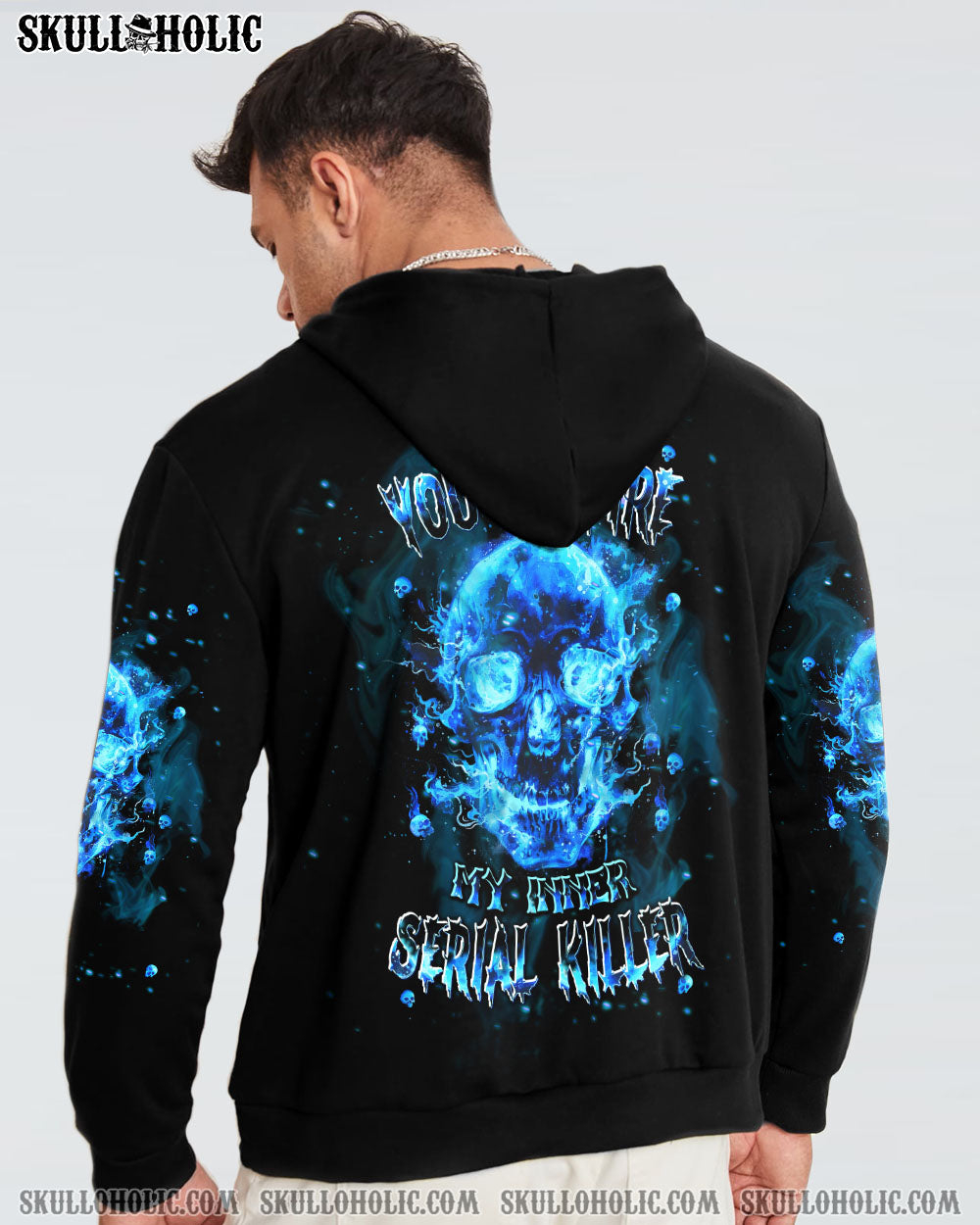 Unleash your bold, fierce side with our YOU INSPIRE MY INNER KLLER SKULL ALL OVER PRINT. The striking bright blue skull design serves as a warning of intense ferocity, while the quote playfully acknowledges the darker impulses that may arise when provoked. Embrace your inner killer with this daring design.